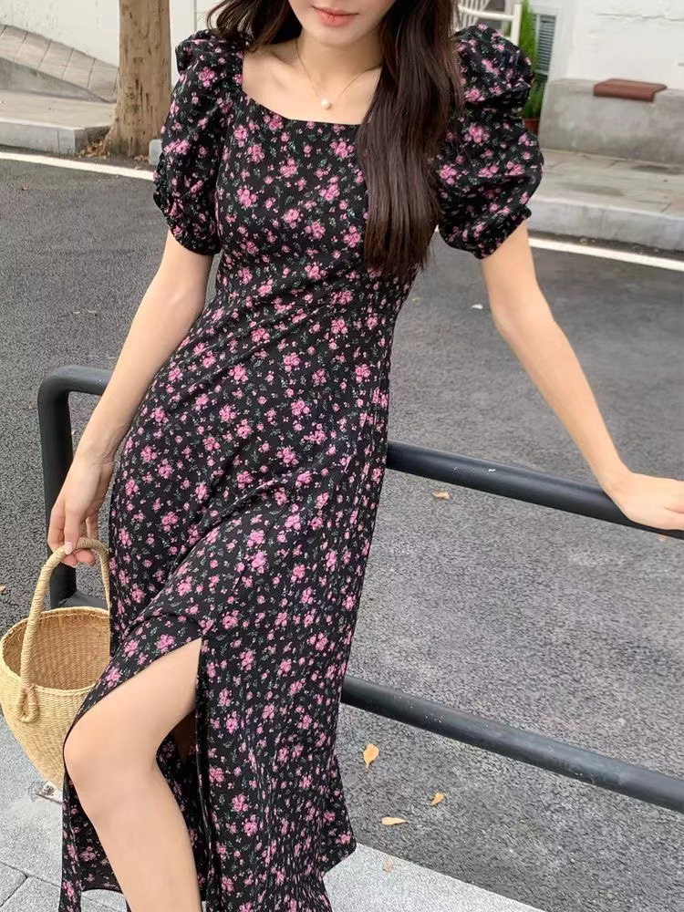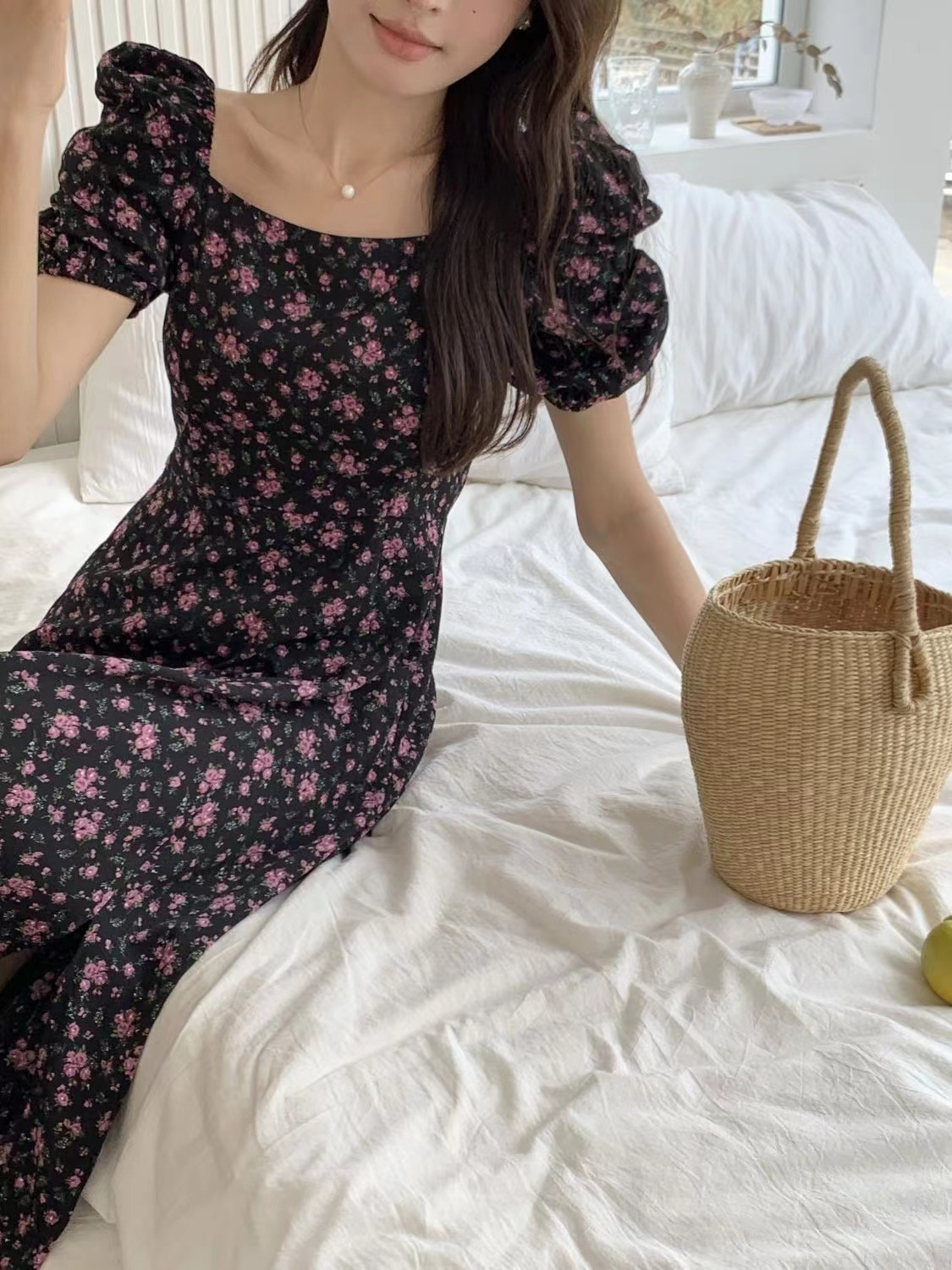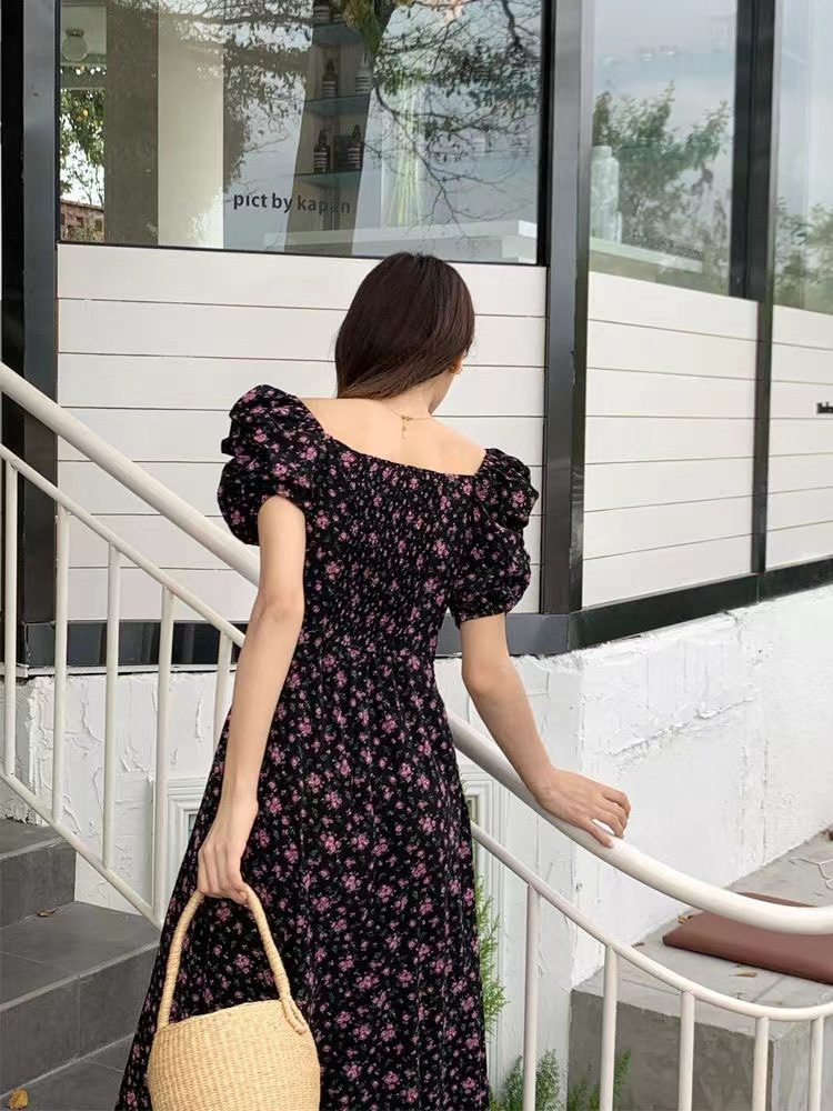 프랑스 레트로 스퀘어 칼라 원피스 여자 여름 하이 엔드 오프 숄더 스커트 타이트 허리 슬리밍 플로럴 롱 스커트