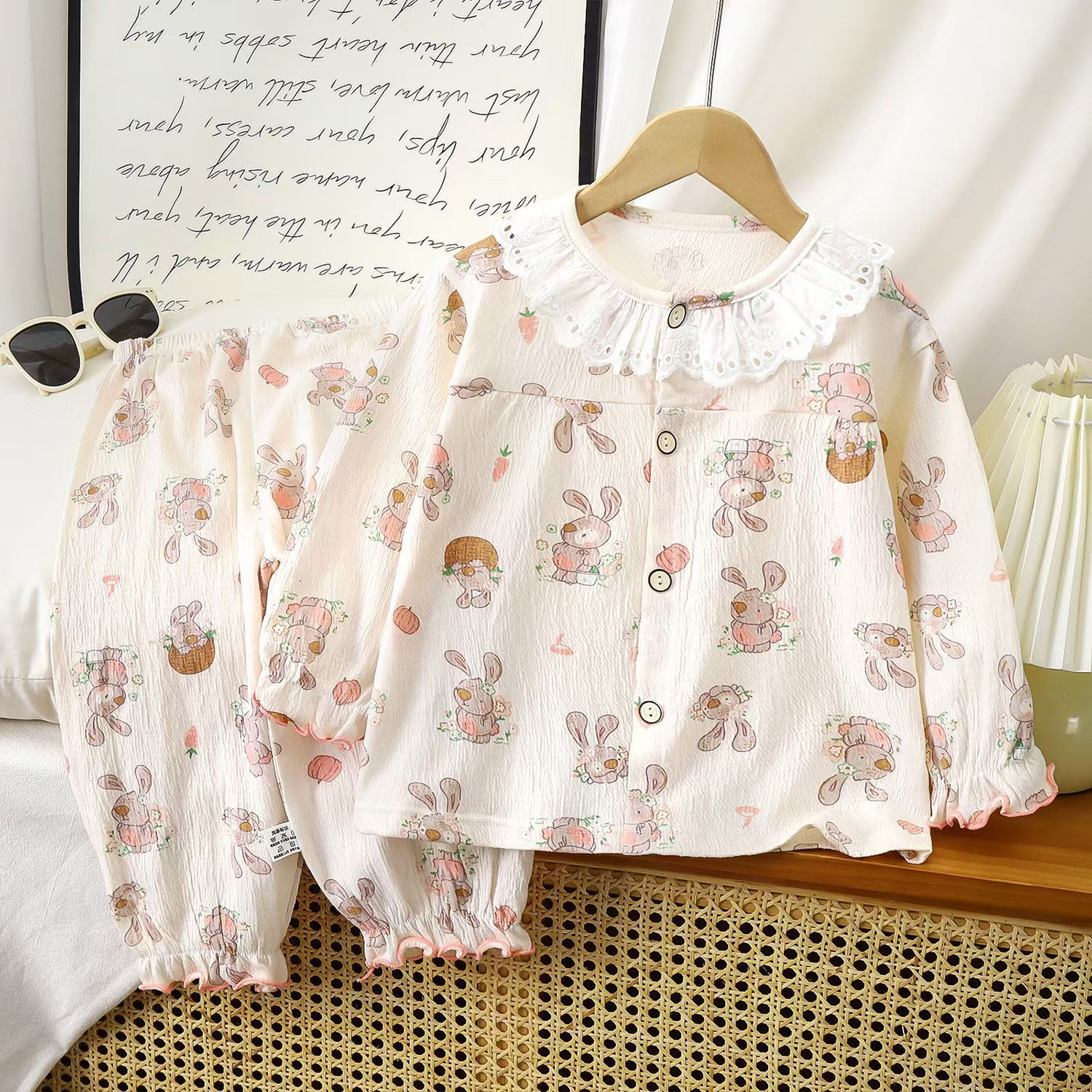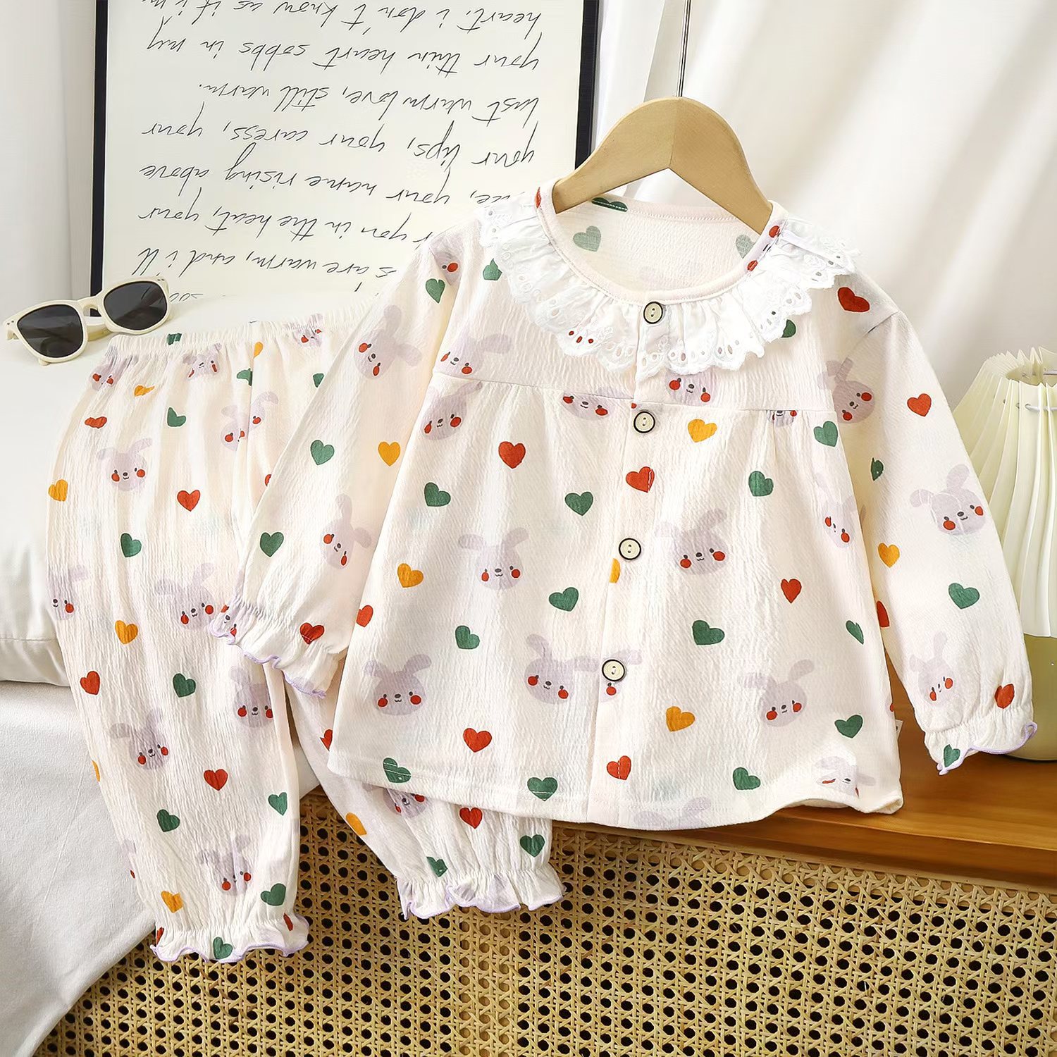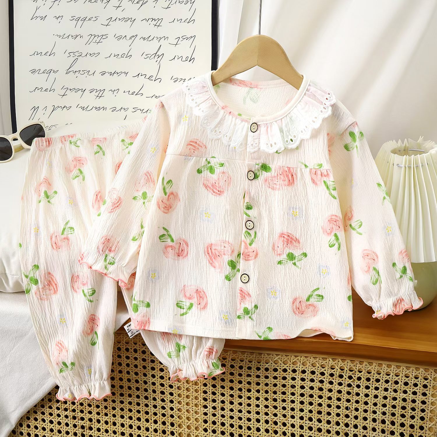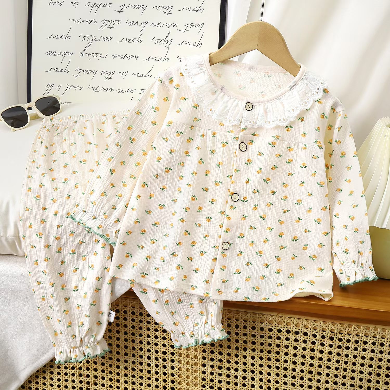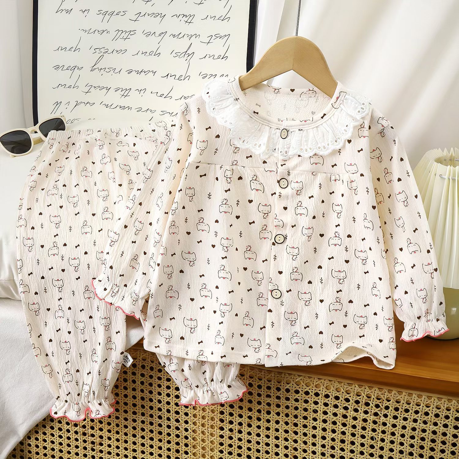 니트 주름진 가정복 세트, 아동용 레이스 면 잠옷 세트, 여름 통기성 속옷 2종스토어 가기