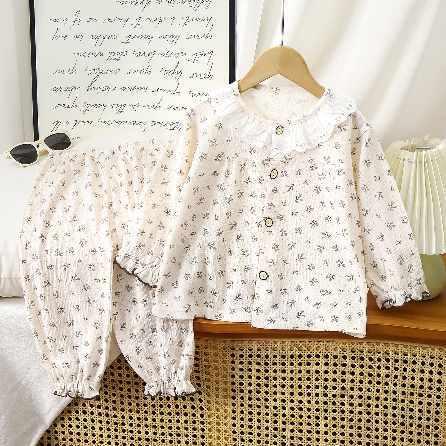 니트 주름진 가정복 세트, 아동용 레이스 면 잠옷 세트, 여름 통기성 속옷 2종