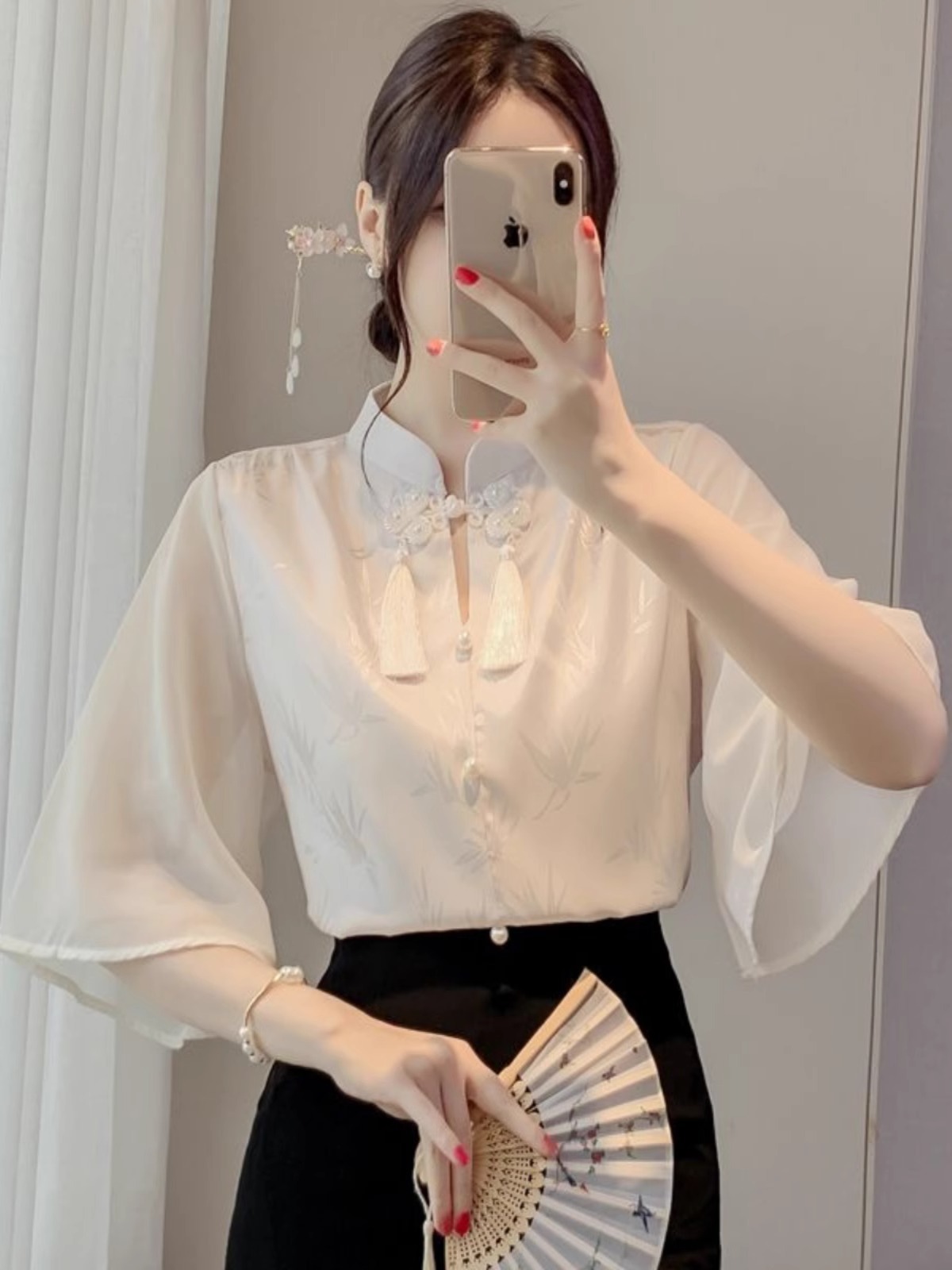 새로운 중국 스타일 자카드 술 버튼 칼라 셔츠 2025 여름 짧은 소매 국가 스타일 경적 소매 쉬폰 셔츠 A3527