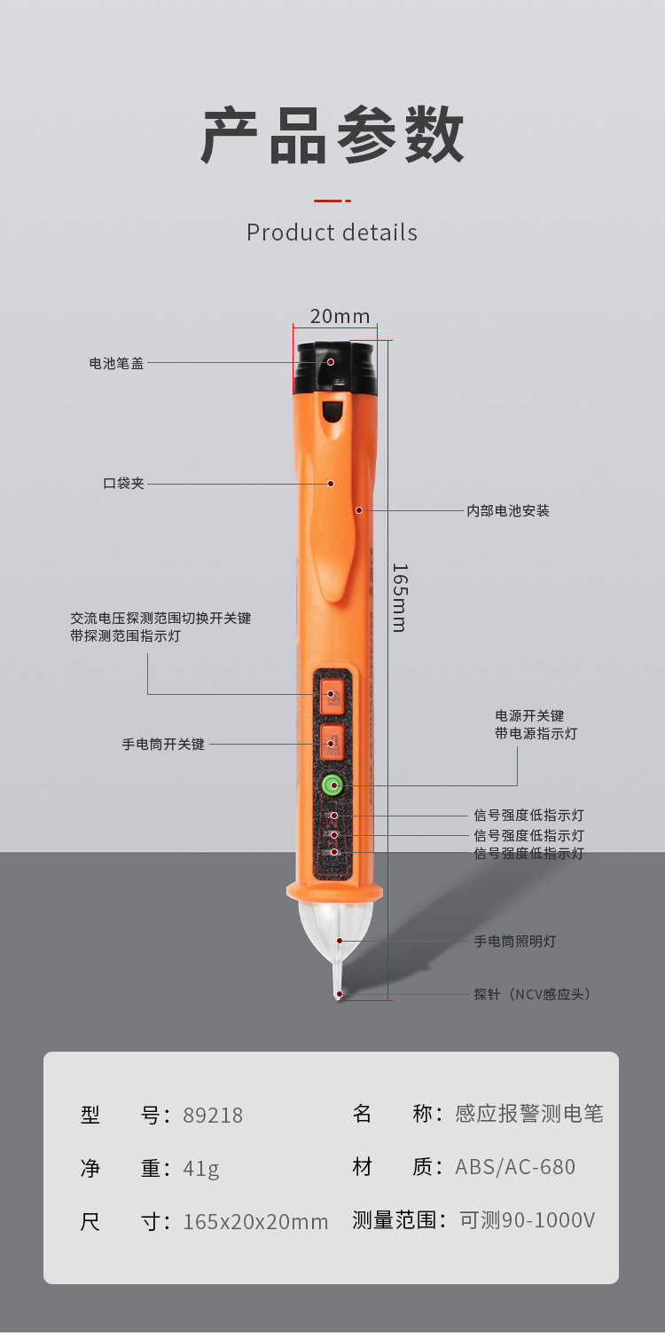 • 89218 (유도 이중 경보 테스트 펜 + 배터리 * 2 + 컬러 박스 포장)