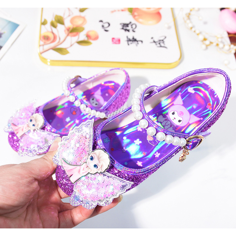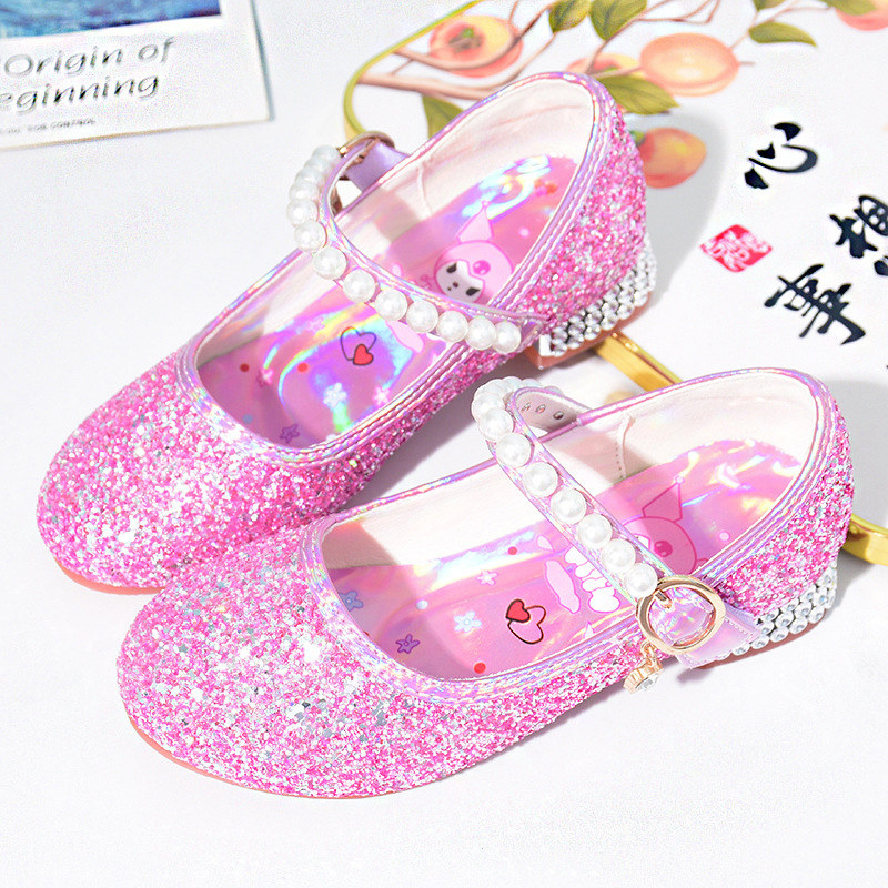 쿠로미 아동화, 여아 하이힐, 공주 드레스 슈즈, 부드러운 밑창 아동용 작은 가죽 신발, 엘사 스팽글 크리스탈 슈즈