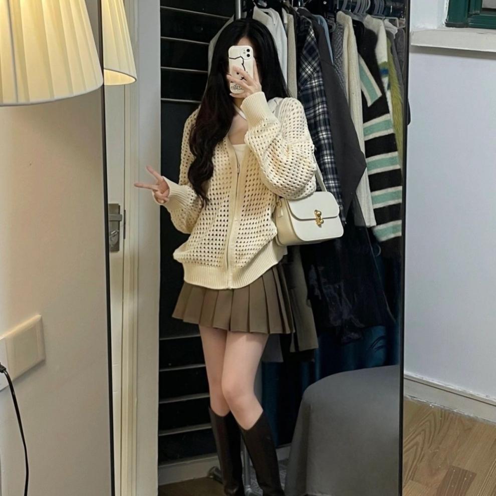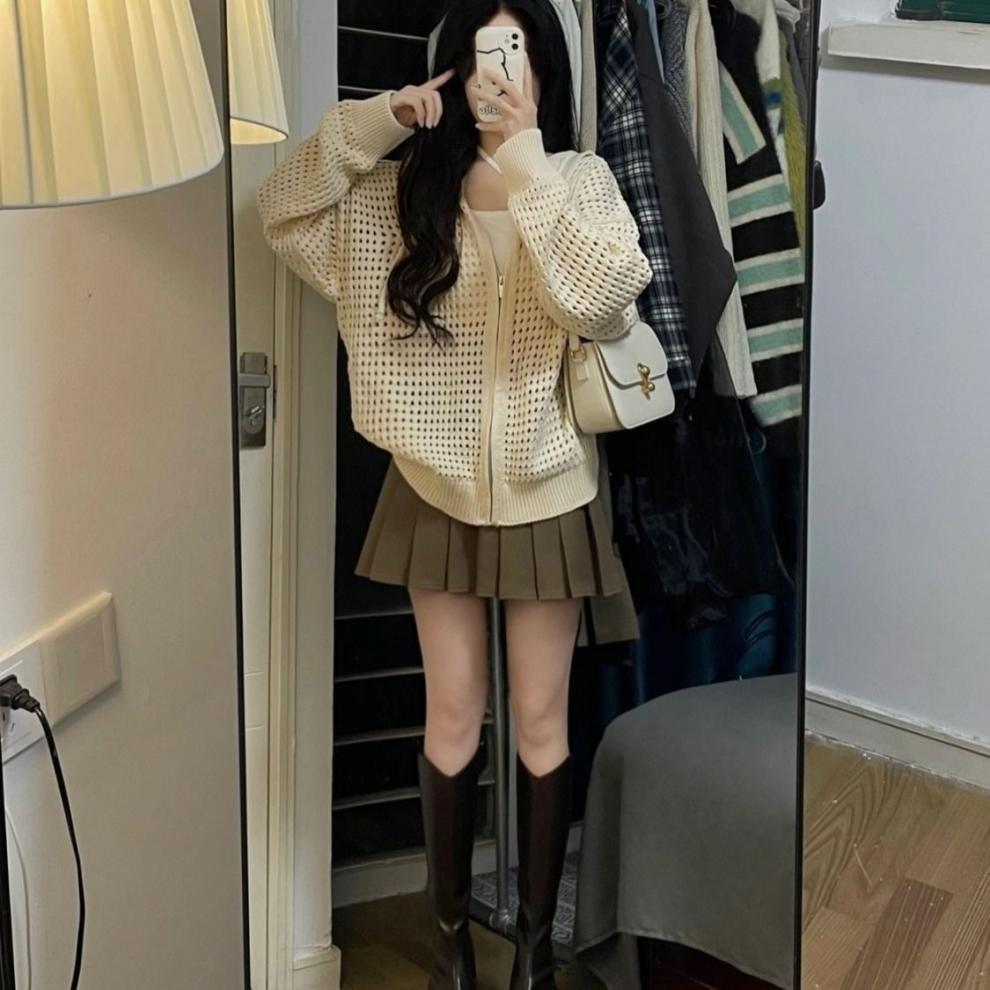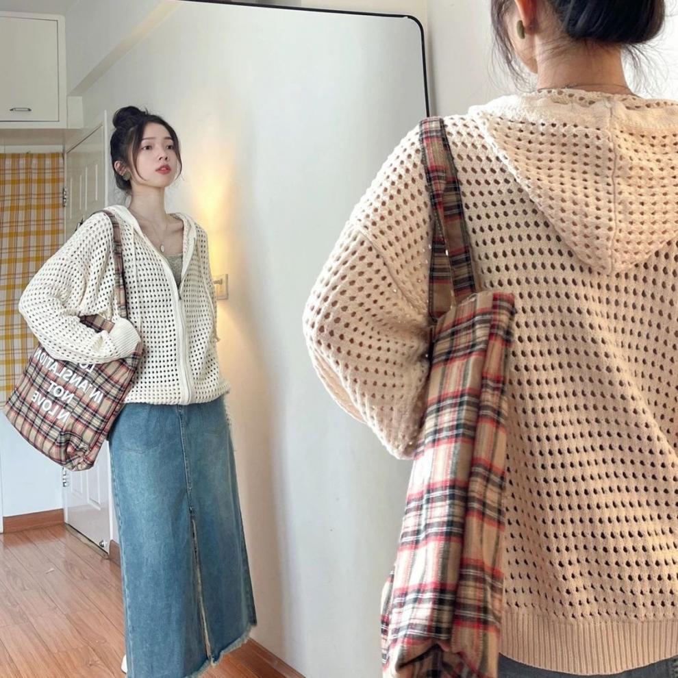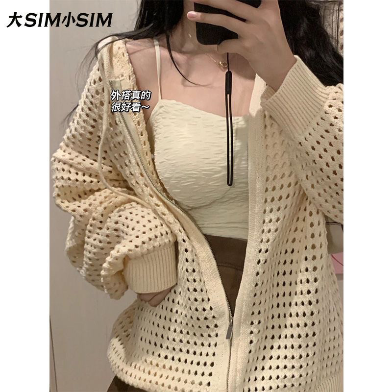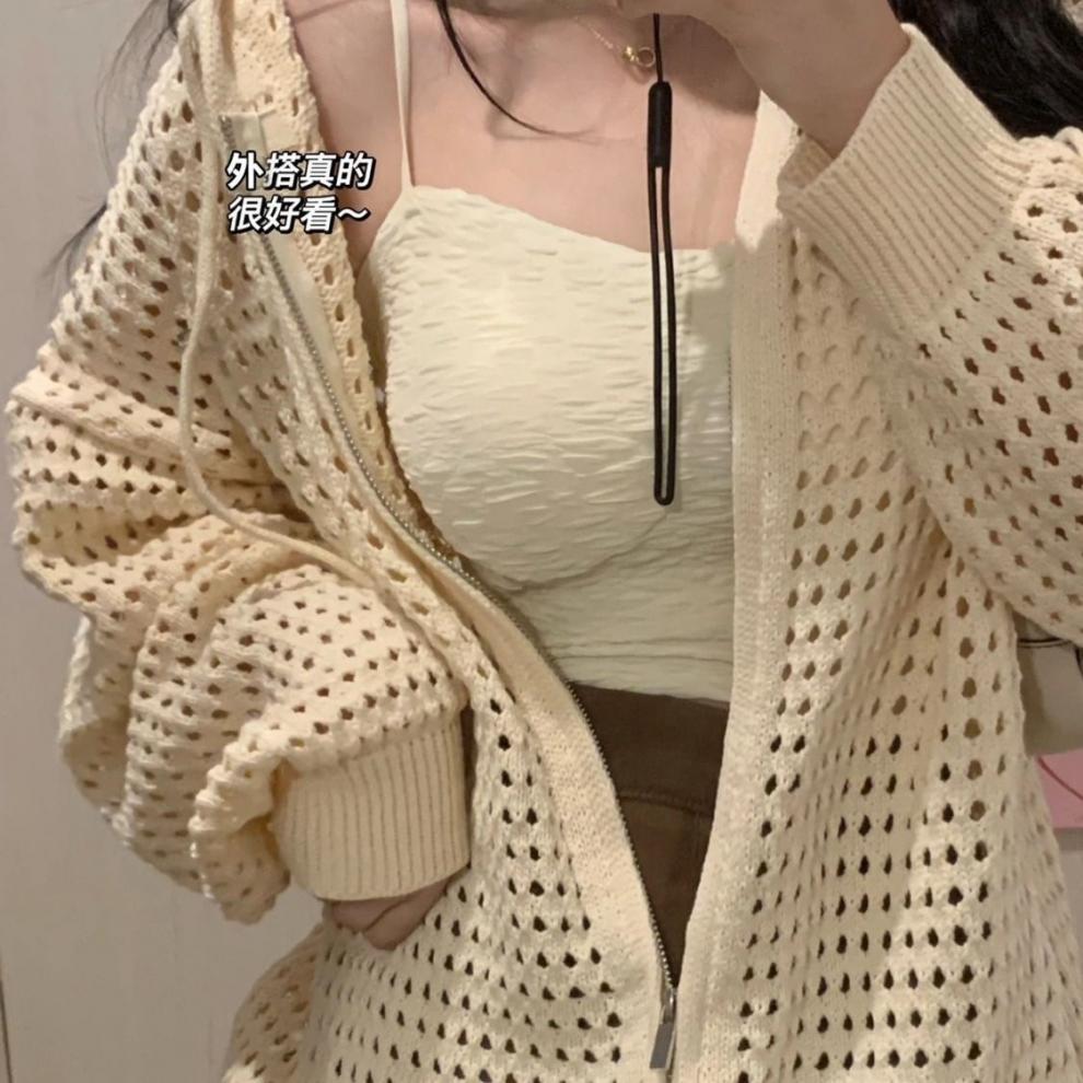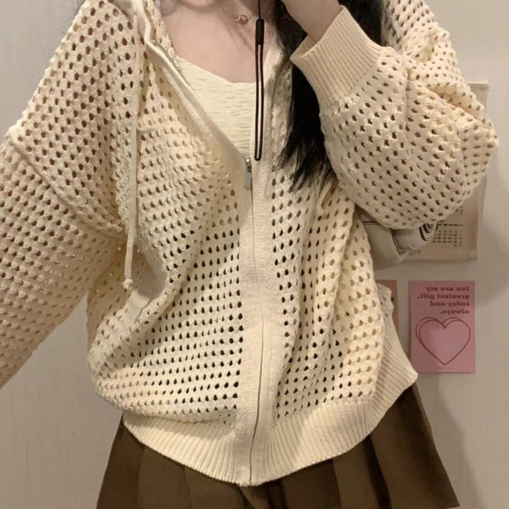 중공 니트 스웨터 디자인 센스 후드 루즈 아우터 얇은 재킷 한국 스타일 봄 여름 지퍼 카디건 탑 여성