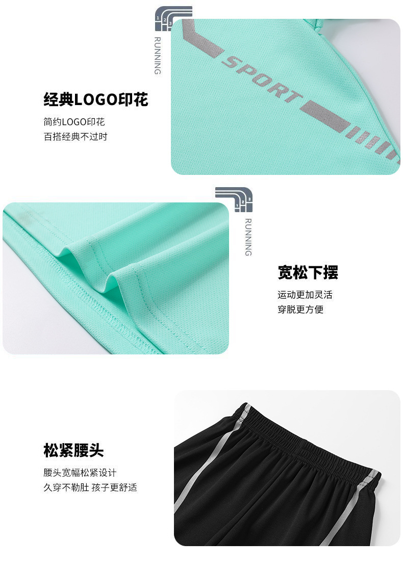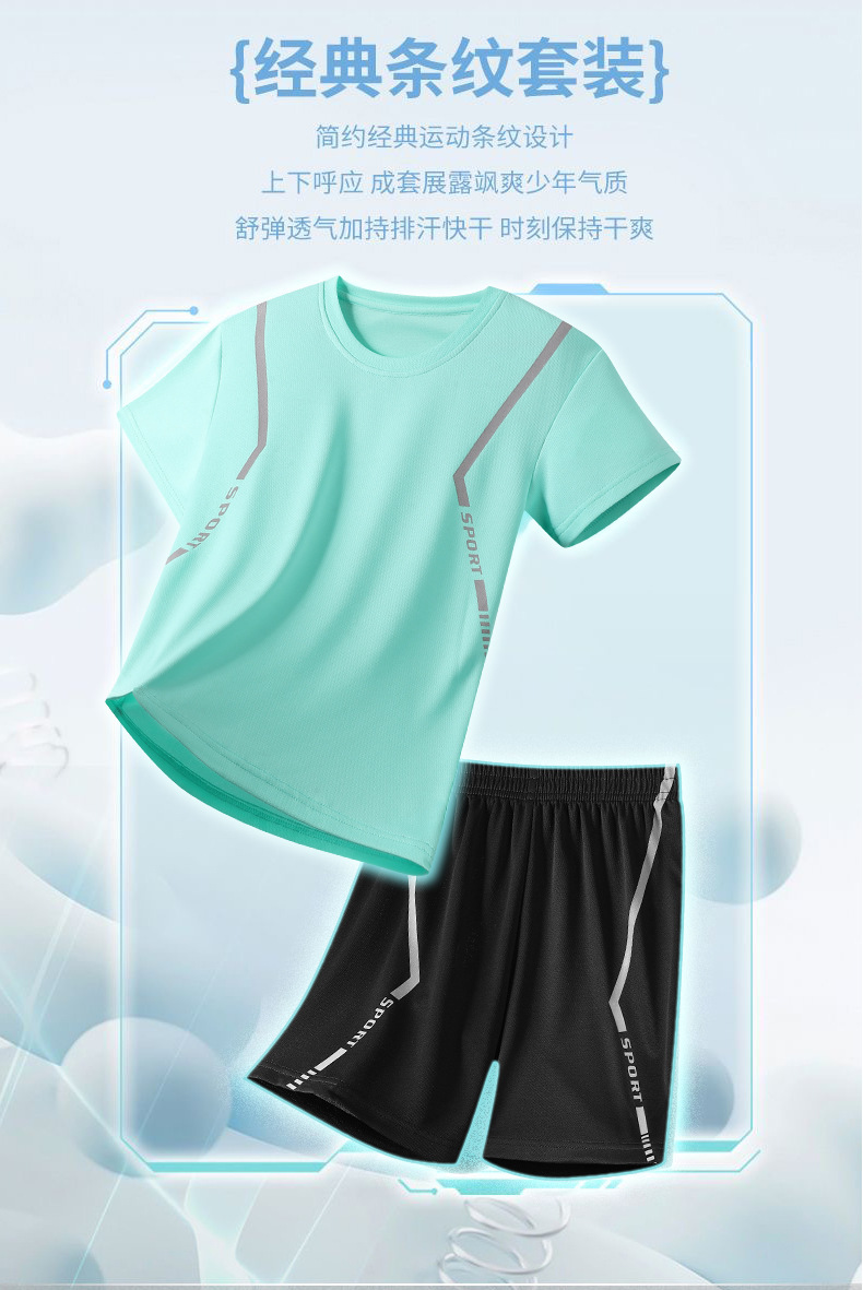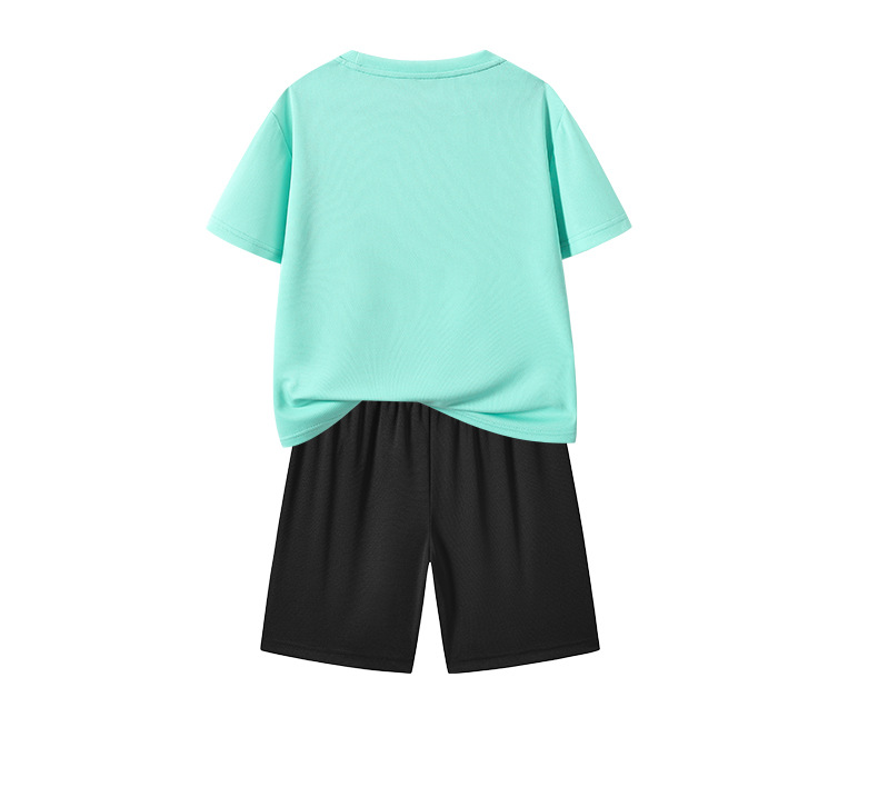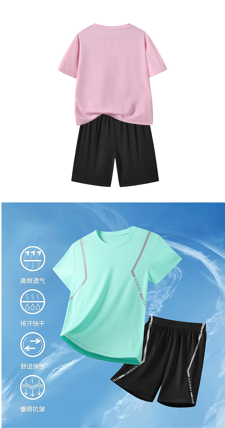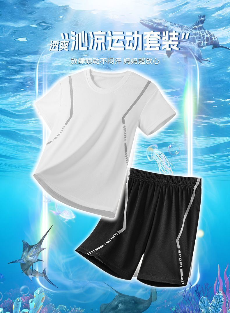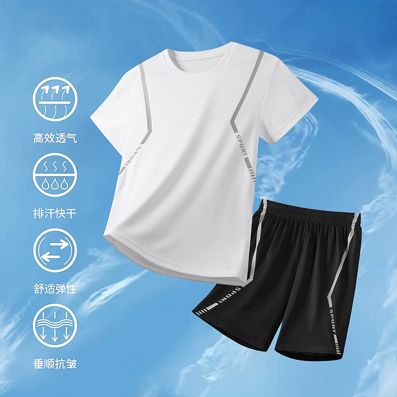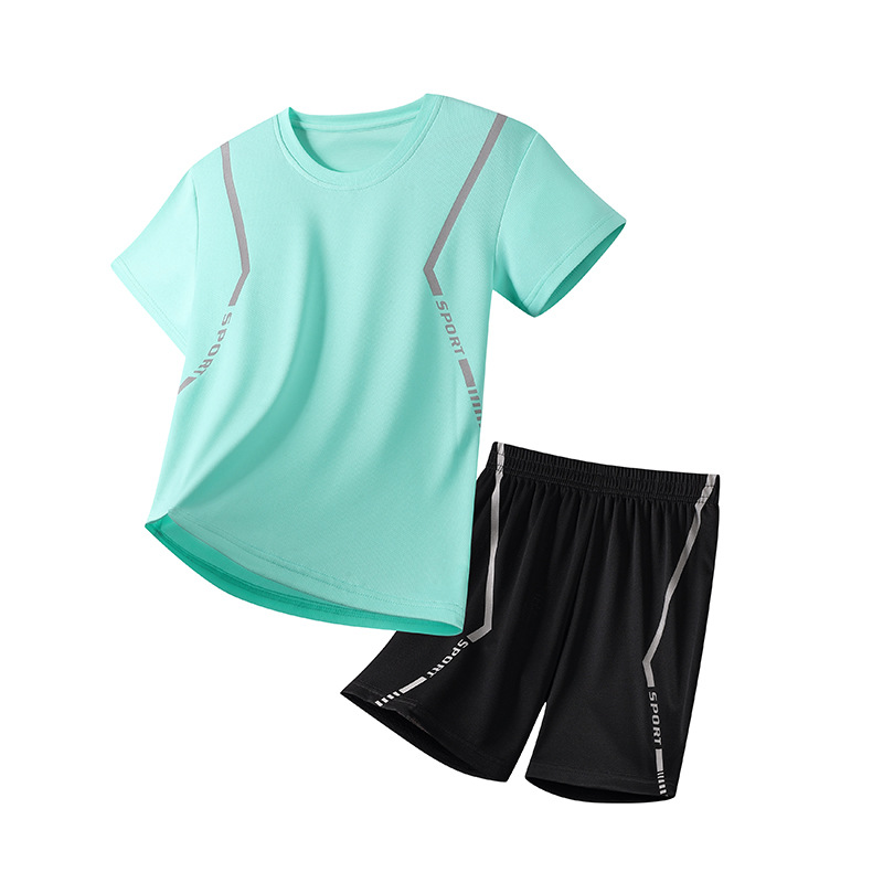 어린이 속건성 정장 여름 얼음 실크 통기성 운동복 소년과 소녀 라운드 넥 시원한 스웨트 셔츠 반바지 투피스 세트