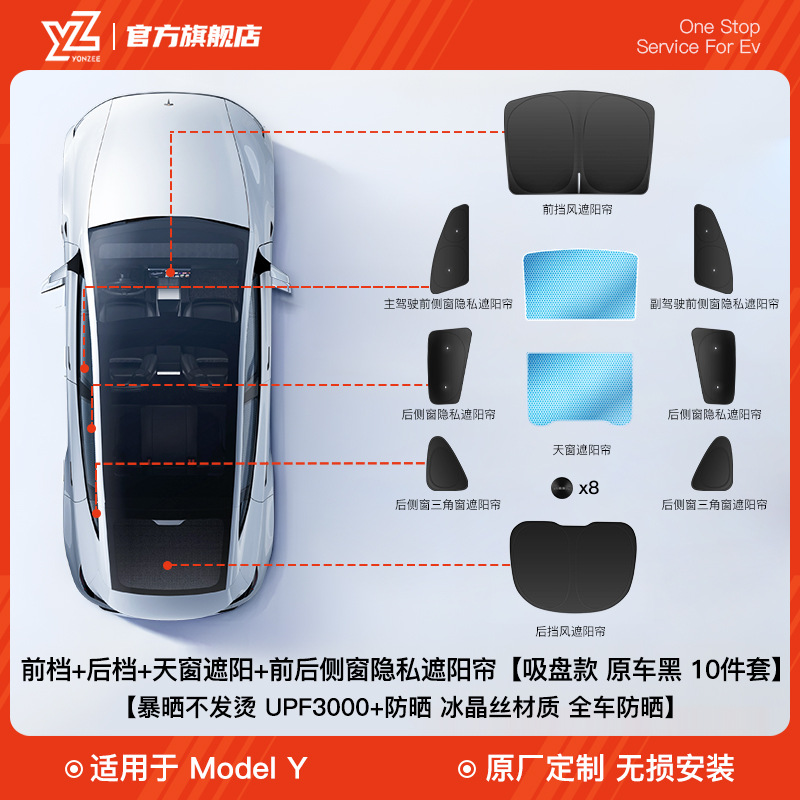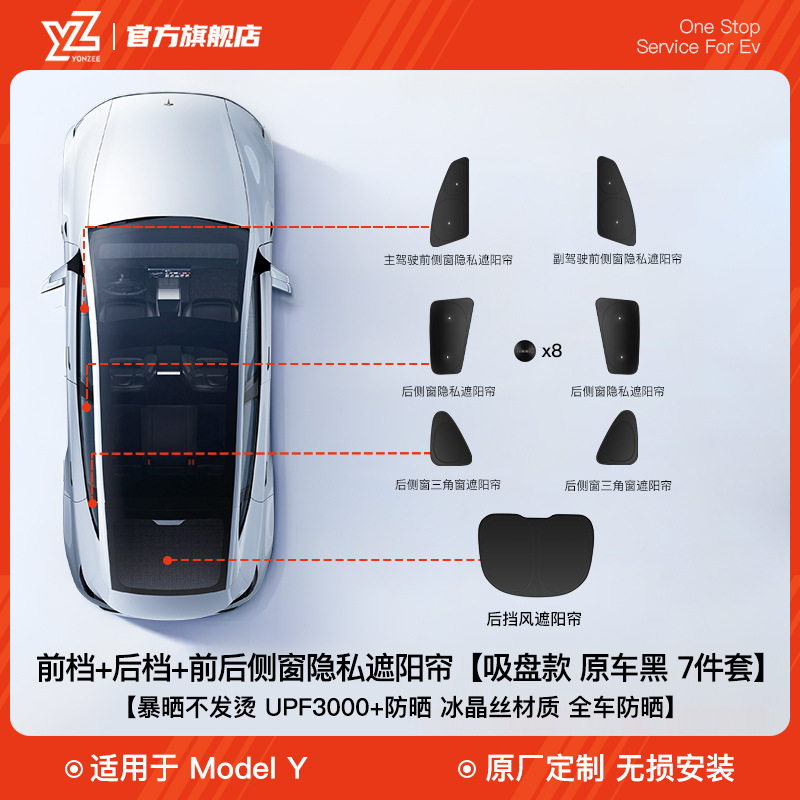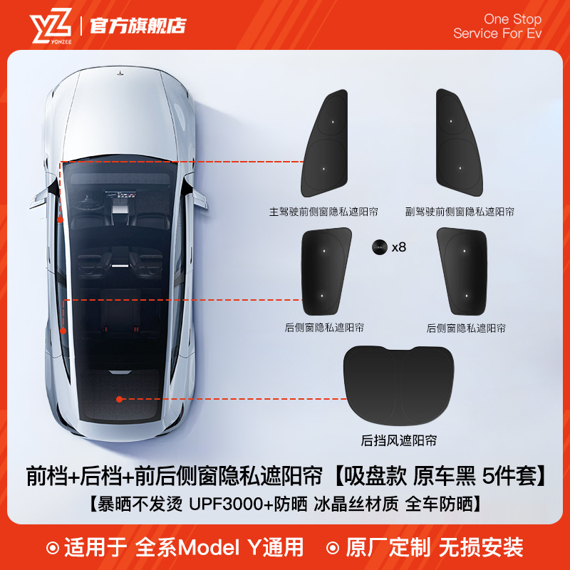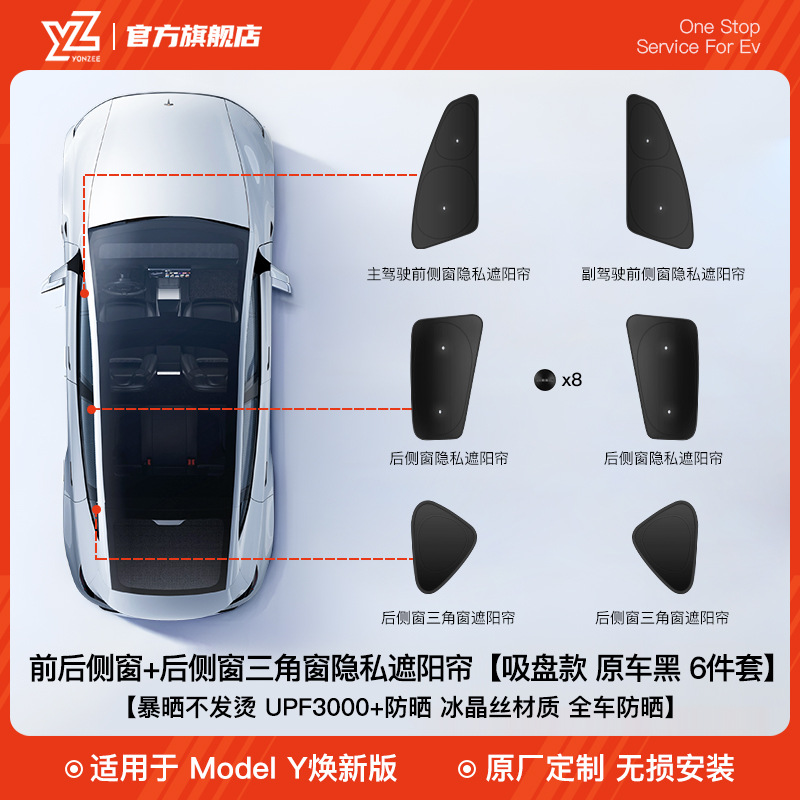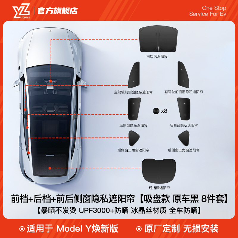 • Model Y 흡착컵 모델 리뉴얼 버전 [차량 전체 프라이버시 8종 세트] BSC 공간 냉각 - 비닐 쉐이딩 - 공식 상위 버전 UPF3000+