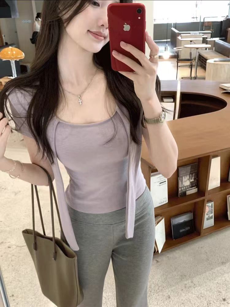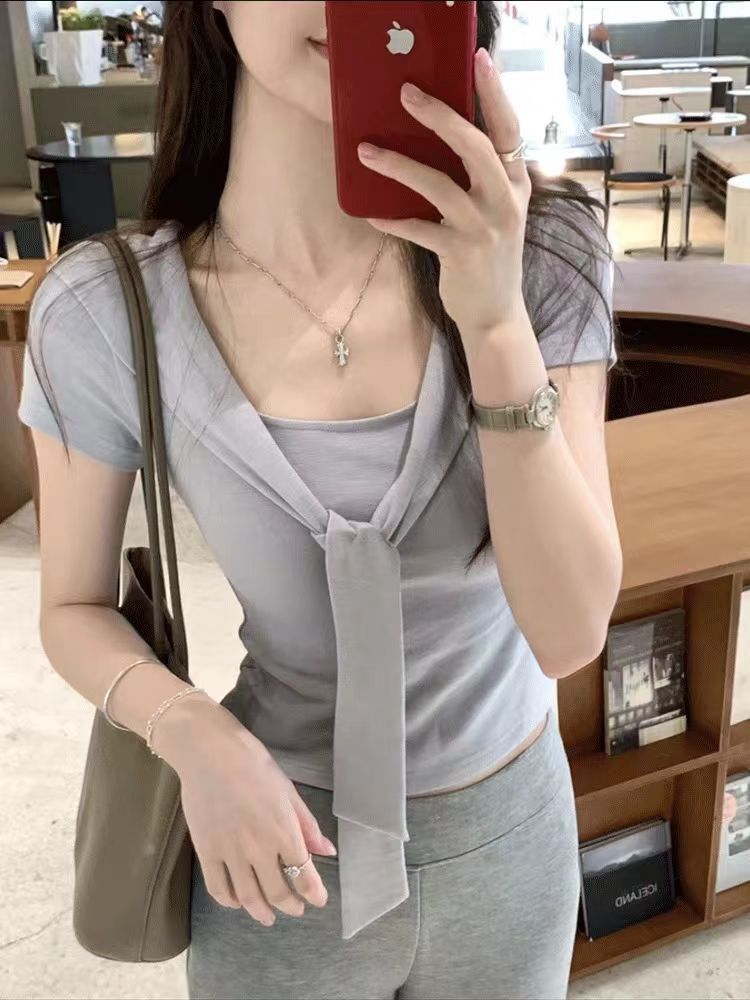 한국식 퍼플 숄더 반팔 티셔츠 여성 여름 디자인 센스 니스 레이스업 슬림핏 짧은 목도리 탑스토어 가기
