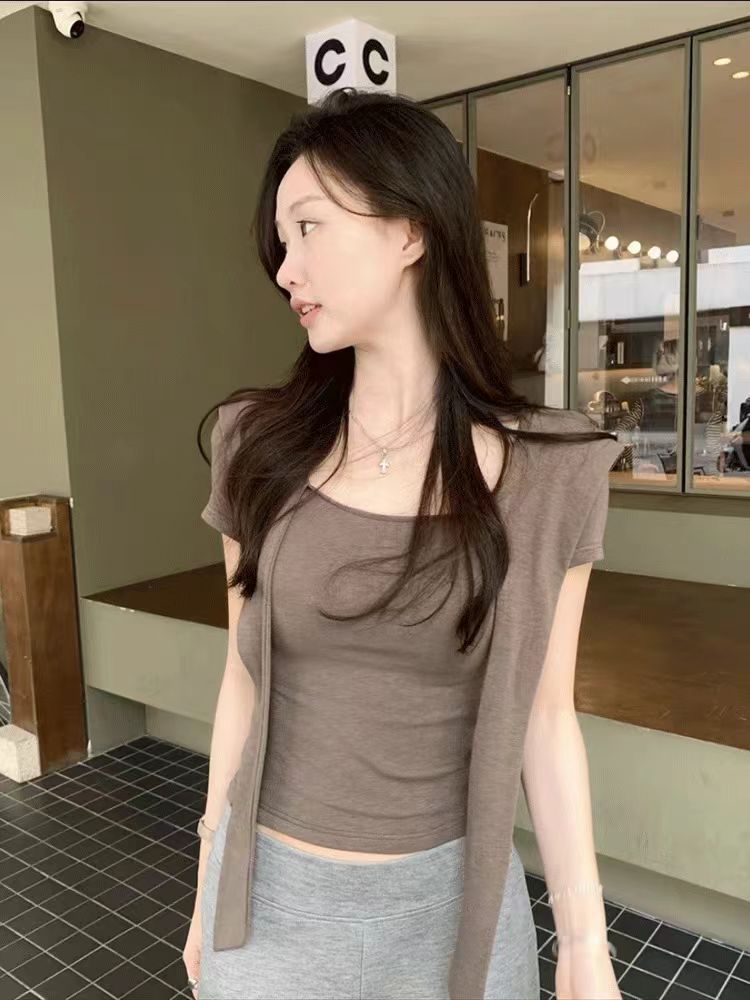 한국식 퍼플 숄더 반팔 티셔츠 여성 여름 디자인 센스 니스 레이스업 슬림핏 짧은 목도리 탑
