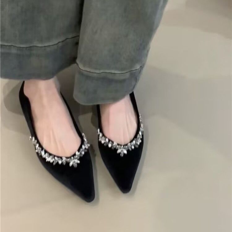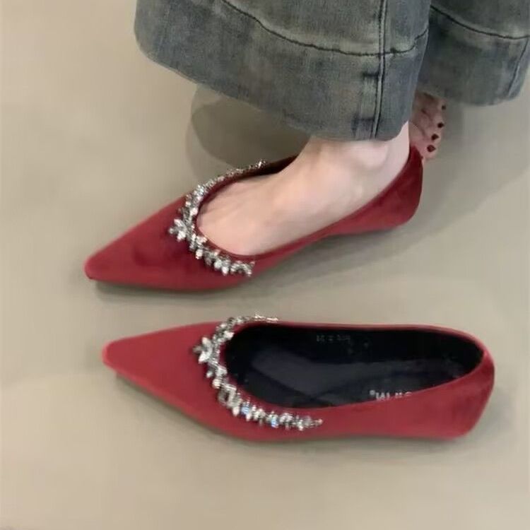 2025 프렌치 벨벳 통근화, 순수한 섹시 스타일, 달콤한 여성 봄 뾰족한 라인스톤 펌프스, 부드러운 밑창 웨딩슈즈, 플랫슈즈스토어 가기