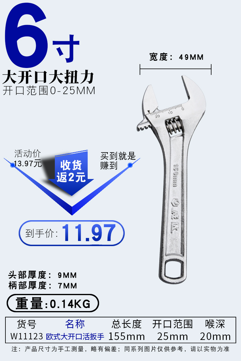 • 6inch 유럽식 대형 개방형 조절식 렌치 150mm 개방량 25mm(W11123)
