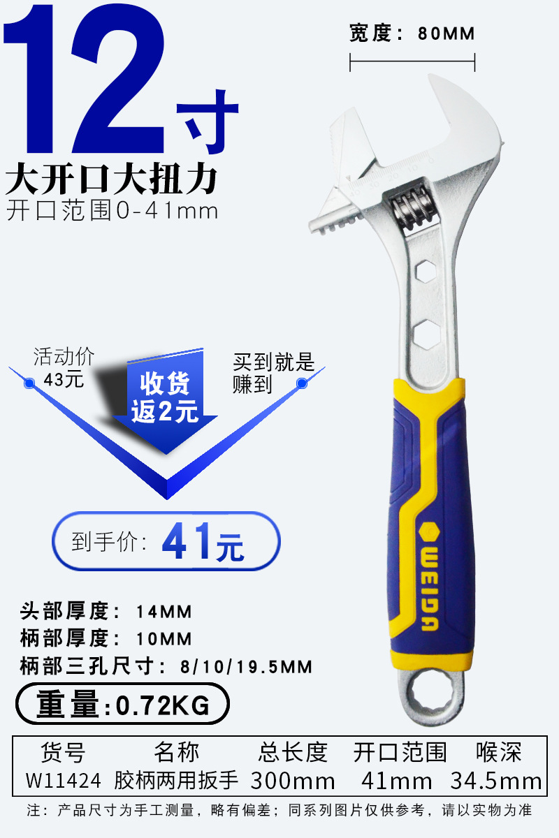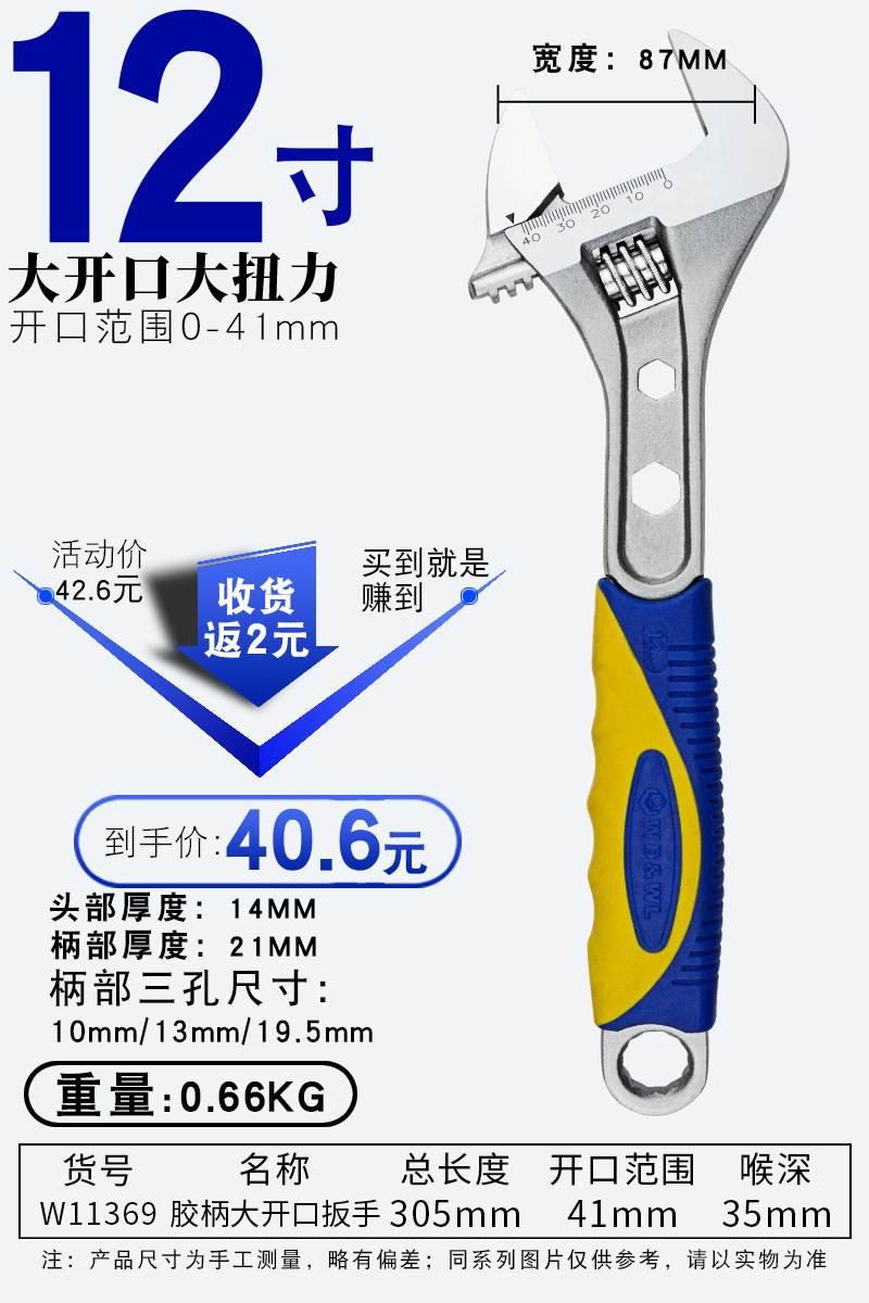 • 고무 손잡이 대형 개방형 조절 렌치 12인치 300mm 개방량 41mm(W11369)