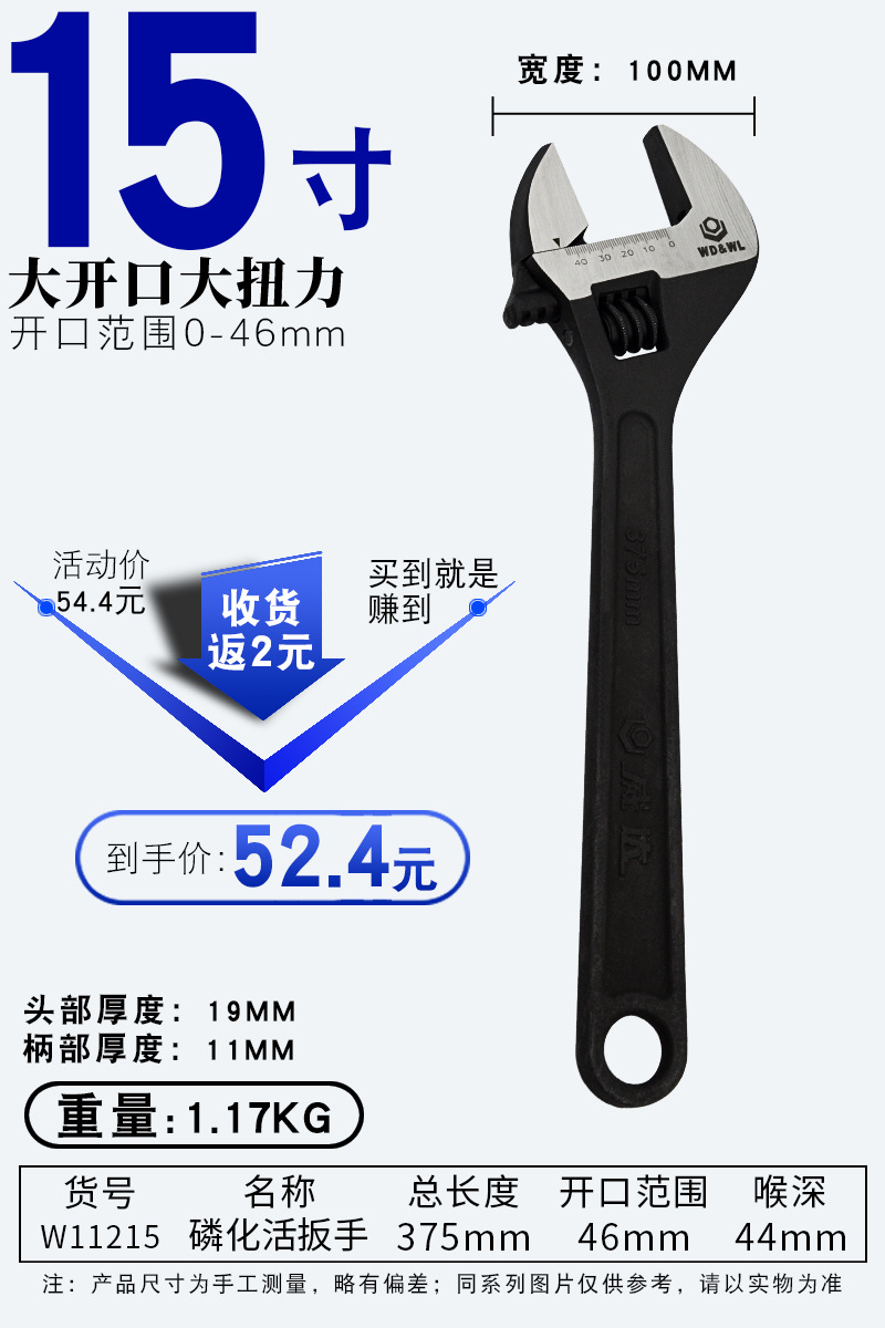 • 조정 가능한 렌치 15인치 375mm 개구부 46mm(W11106)