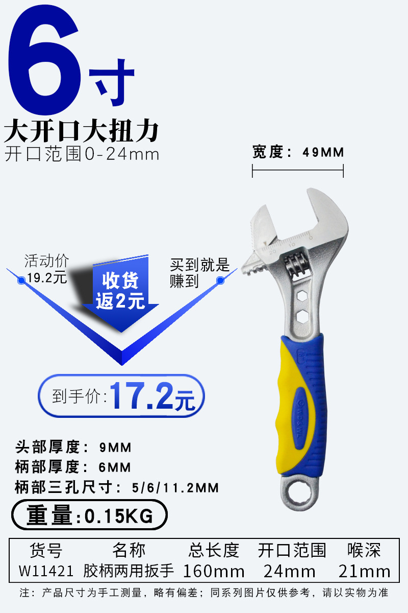 • 6inch 고무 손잡이 겸용 조절식 렌치 150mm 개구부 24mm(W11421)