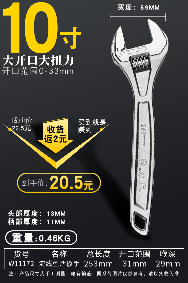 • 산업용 등급 조절식 렌치 10인치 250mm 개구부 31mm(W11172)
