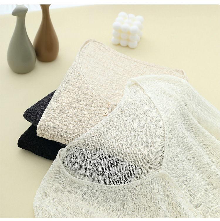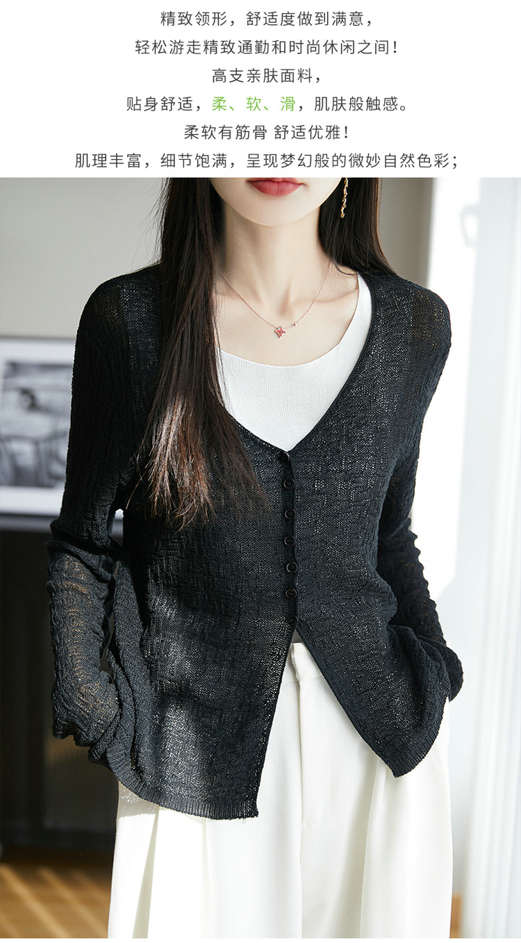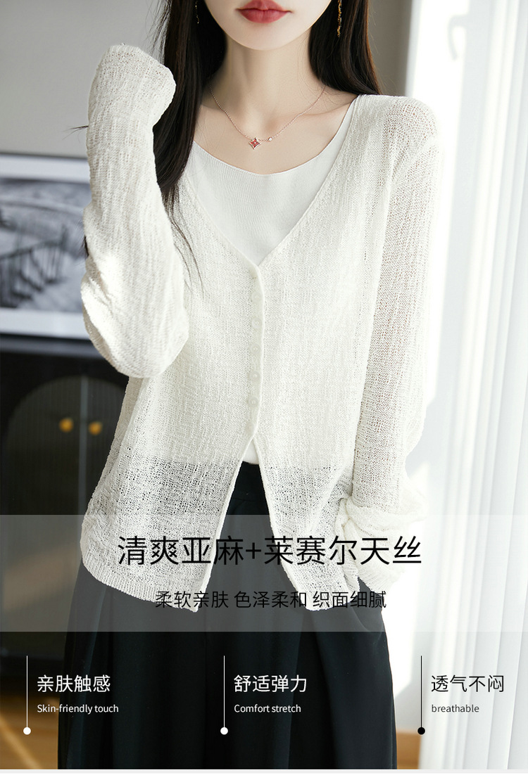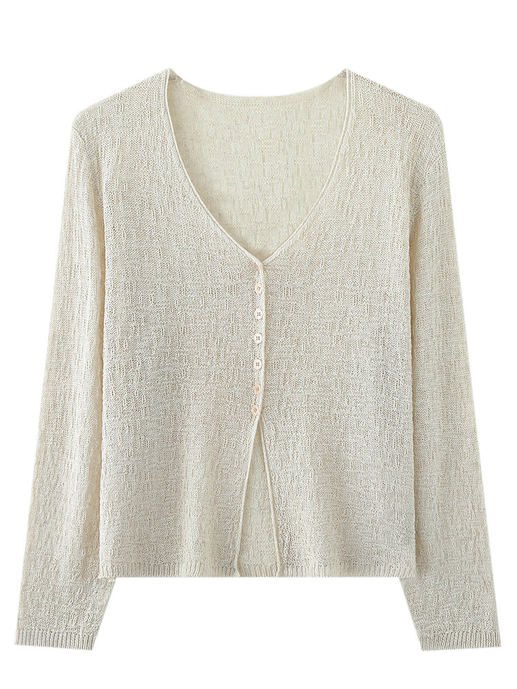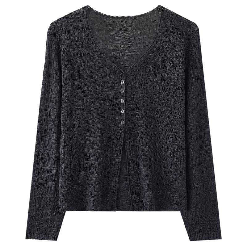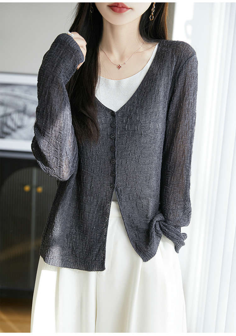 중공 질감 통기성 느슨한 슬림 선 스크린 카디건 여름 패션 게으른 V-넥 리넨 여성용 니트 에어컨 셔츠
