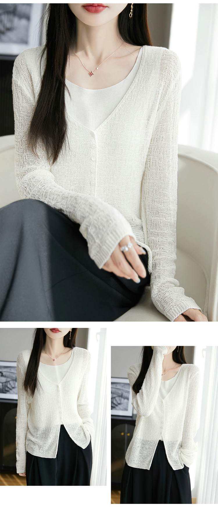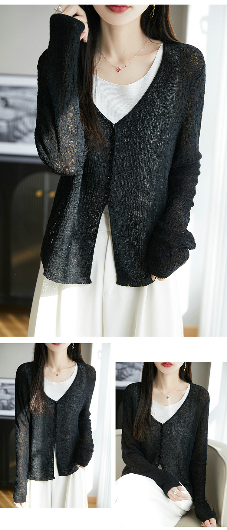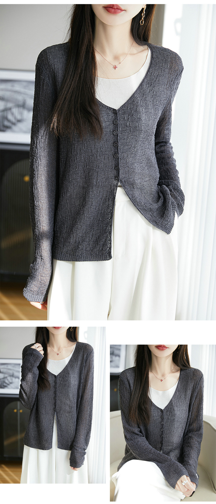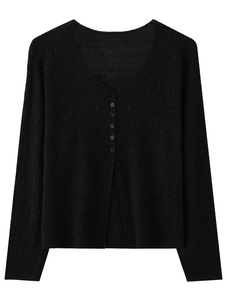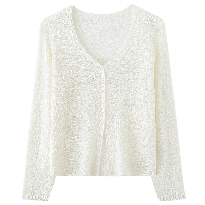 중공 질감 통기성 느슨한 슬림 선 스크린 카디건 여름 패션 게으른 V-넥 리넨 여성용 니트 에어컨 셔츠