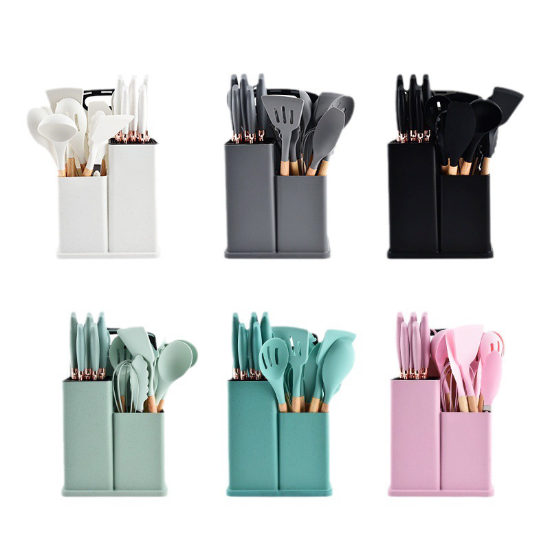 뜨거운 판매 실리콘 주방 용품 세트 19 피스 세트 가정용 고온 저항하는 비 스틱 팬 삽 숟가락 칼 세트 저장 버킷 조합스토어 가기