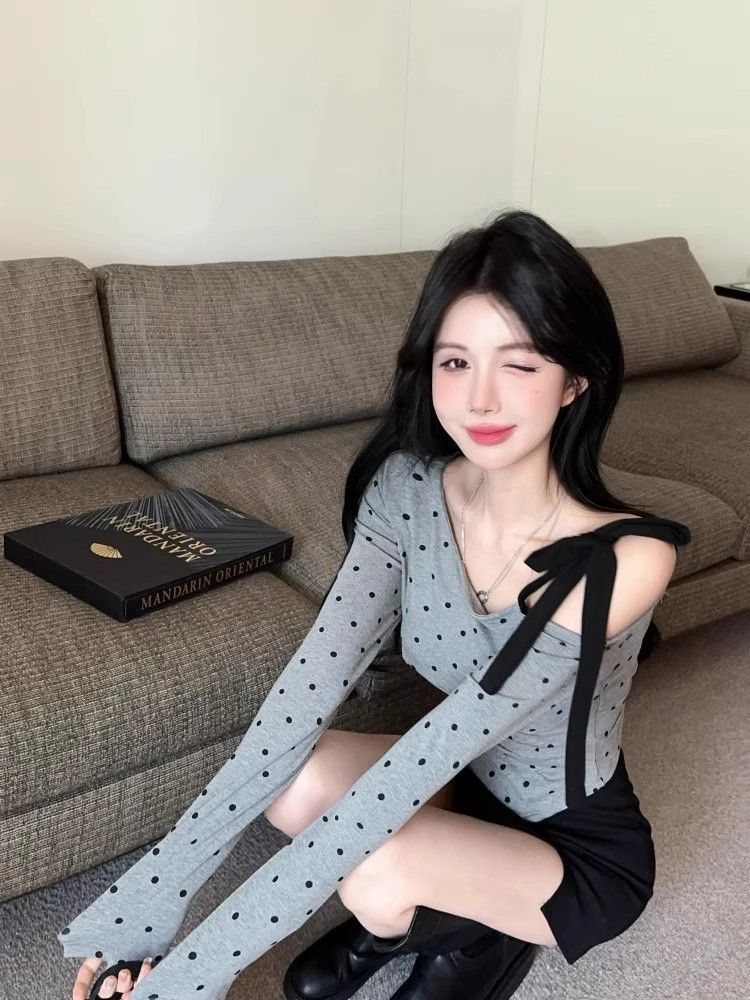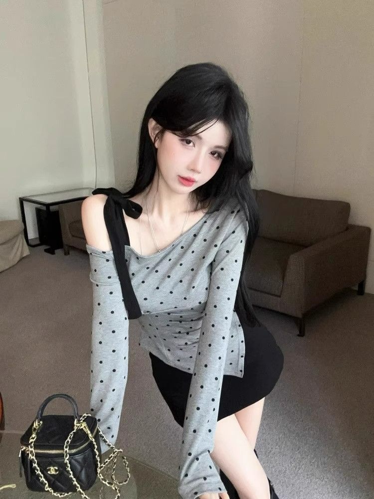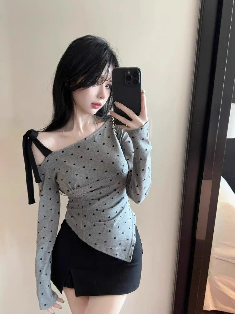 Pure Desire Hot Girl 디자인 폴카 도트 오프 숄더 티셔츠 여성 봄, 여름 불규칙한 바닥 셔츠 비스듬한 어깨 긴팔 탑 크로스 보더