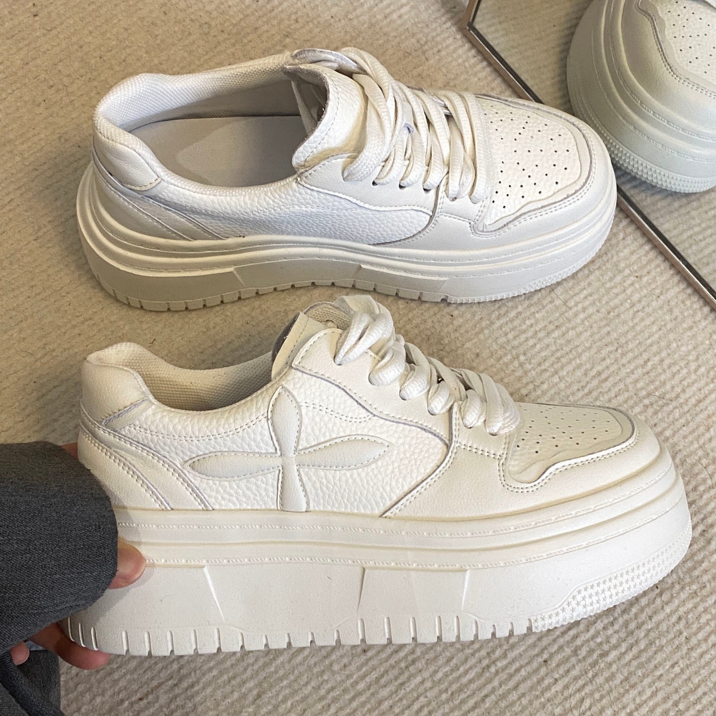 2025년 신상 여성용 천연가죽 화이트 슈즈, 슬림하고 두꺼운 밑창, 높이가 증가하는 봄 여성용 만능 신발, 빵 신발스토어 가기