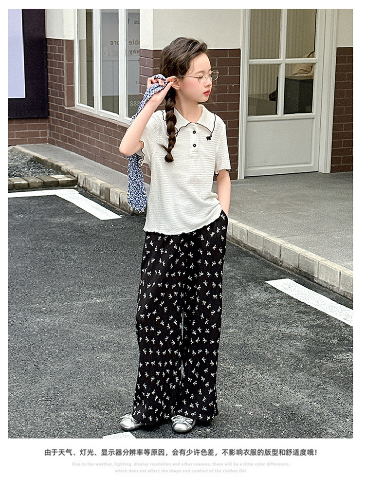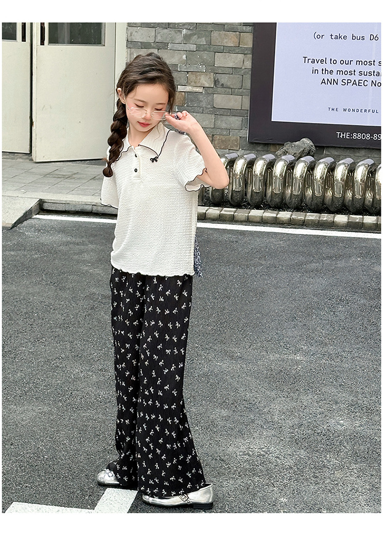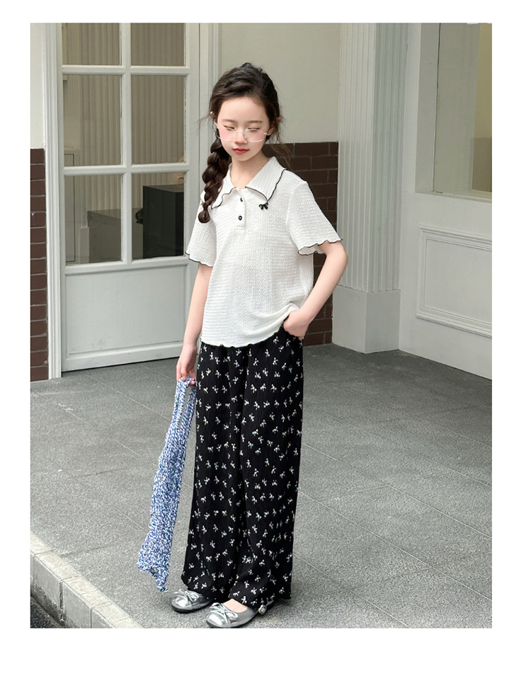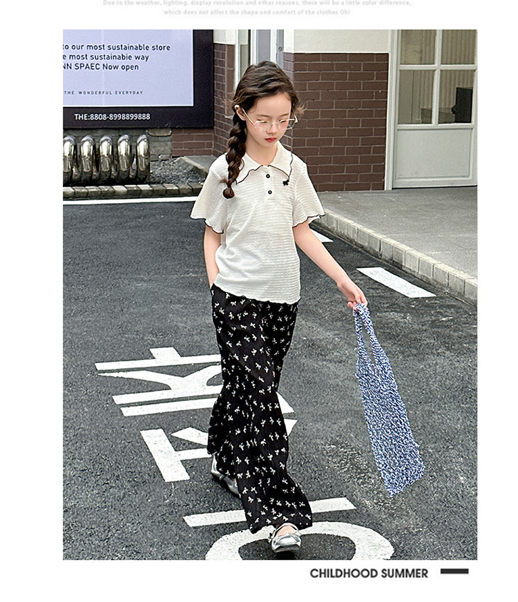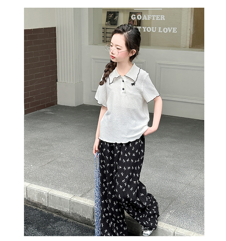 여자 화이트 반팔 라 티셔츠 여름 어린이 폴로 셔츠 탑 활 바지 와이드 레그 바지 투피스 세트