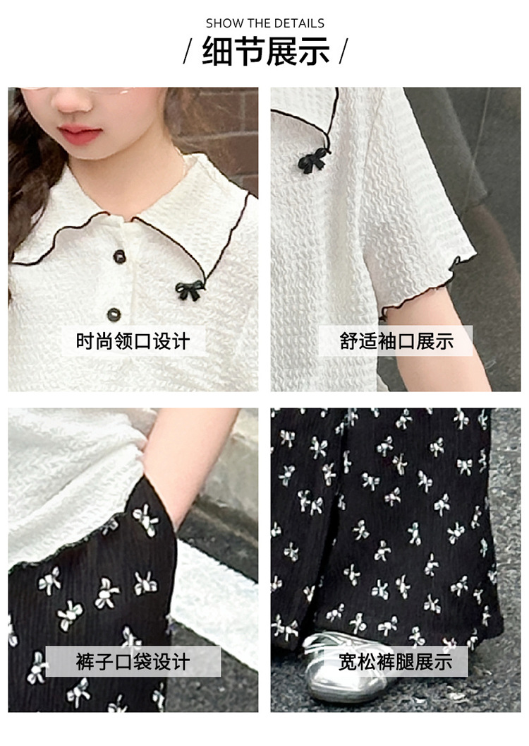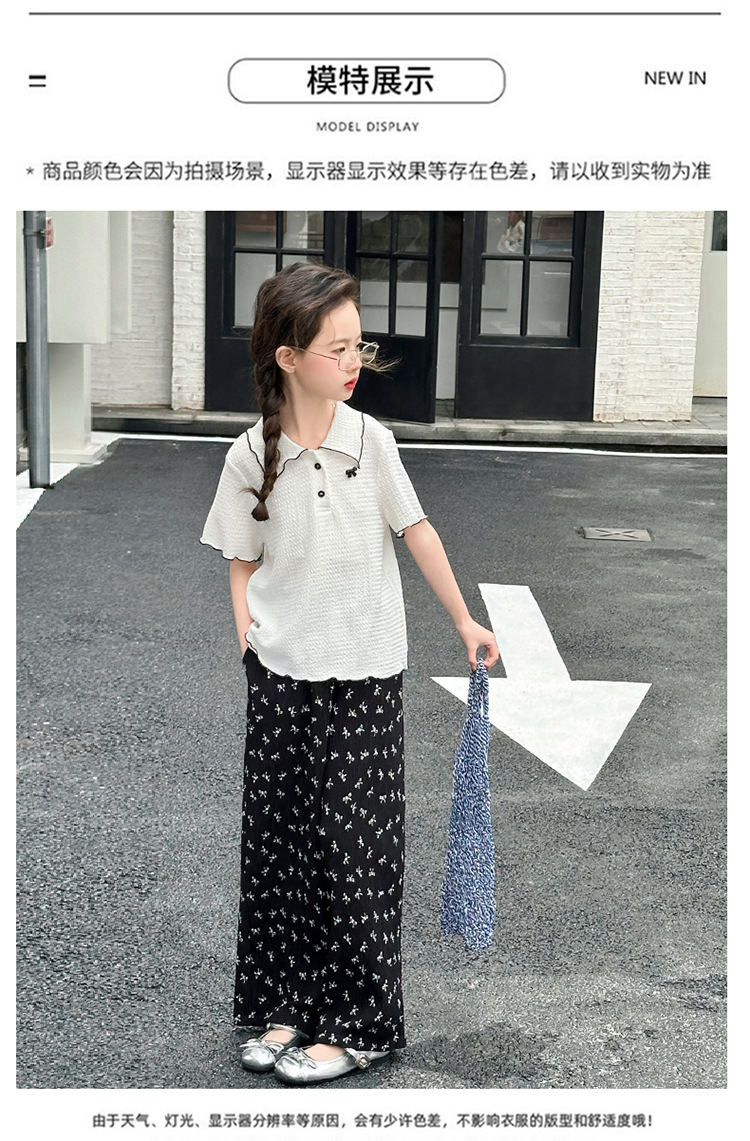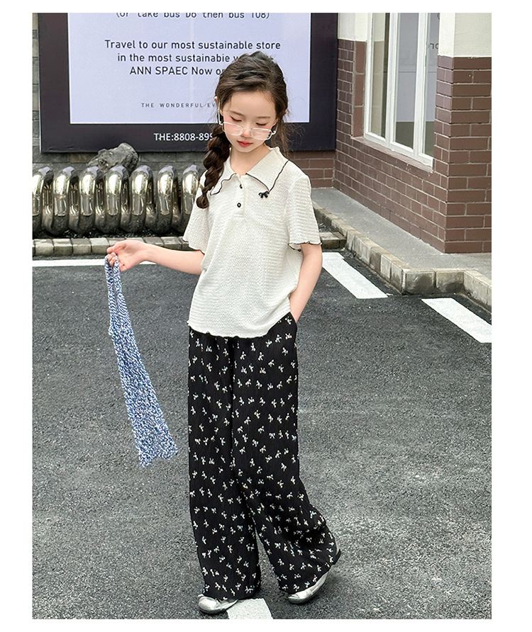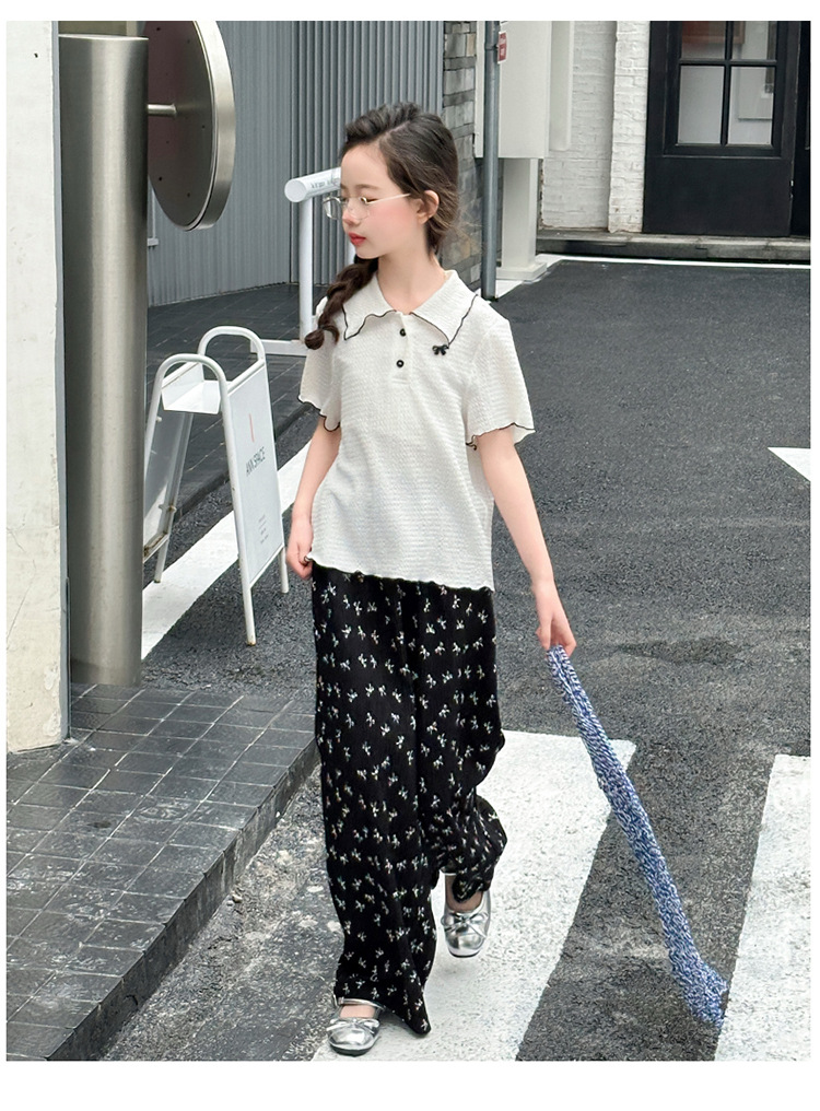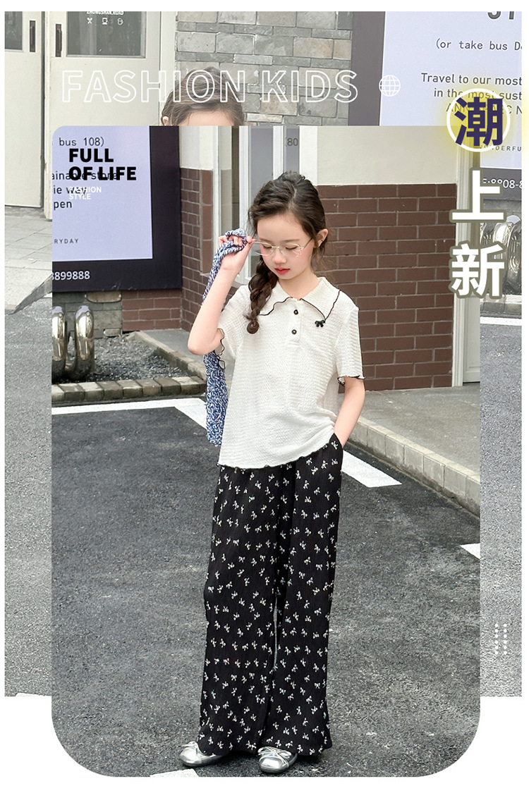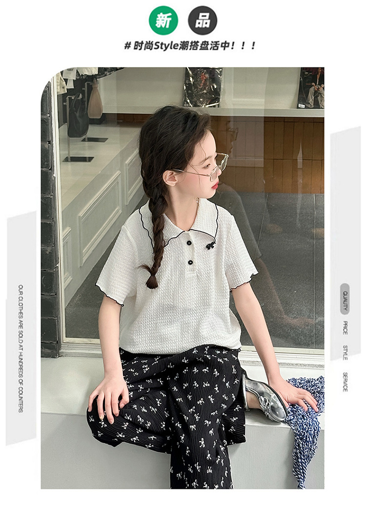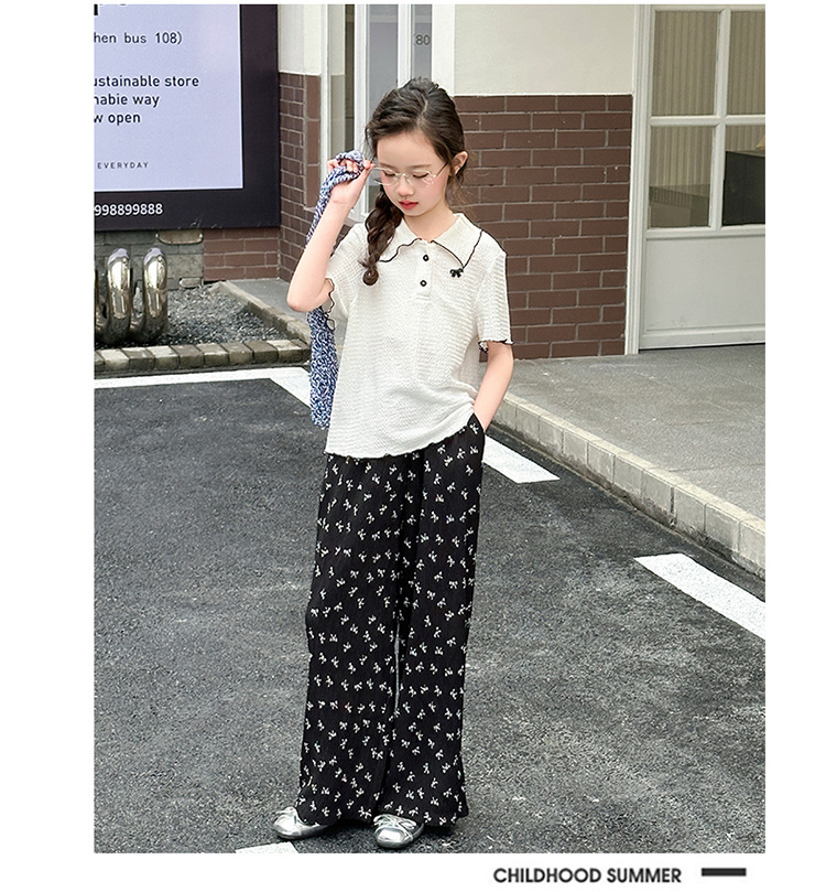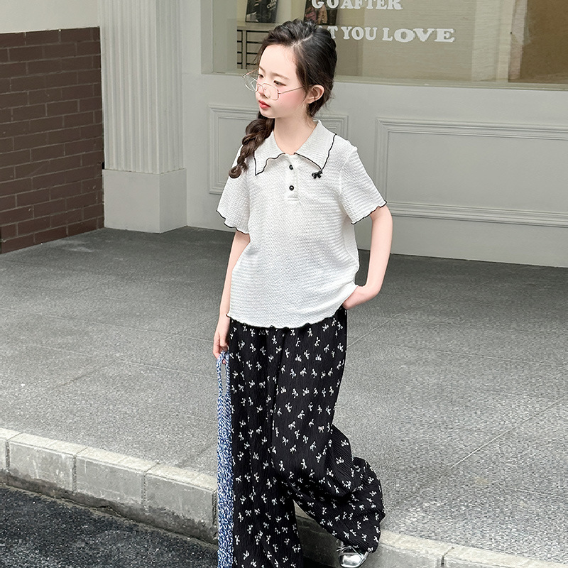여자 화이트 반팔 라 티셔츠 여름 어린이 폴로 셔츠 탑 활 바지 와이드 레그 바지 투피스 세트스토어 가기