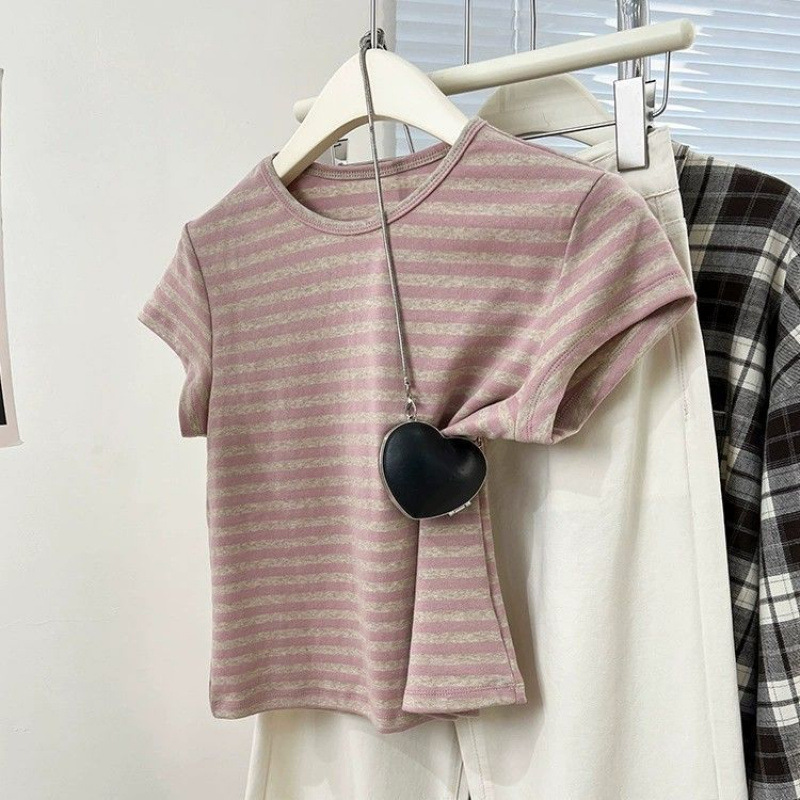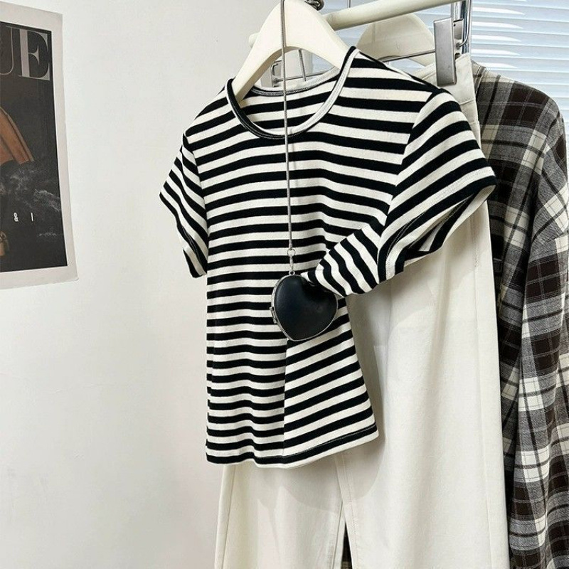 퓨어 코튼 스트라이프 숄더 반팔 티셔츠 여성 여름 새로운 디자인 센스 니쉬 크루 넥 통근 탑 트렌디스토어 가기
