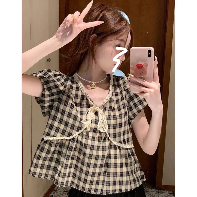 2025 년 여름 새로운 한국 스타일 레트로 격자 무늬 버블 슬리브 레이스 V-넥 인형 셔츠 탑 흑백 격자 무늬