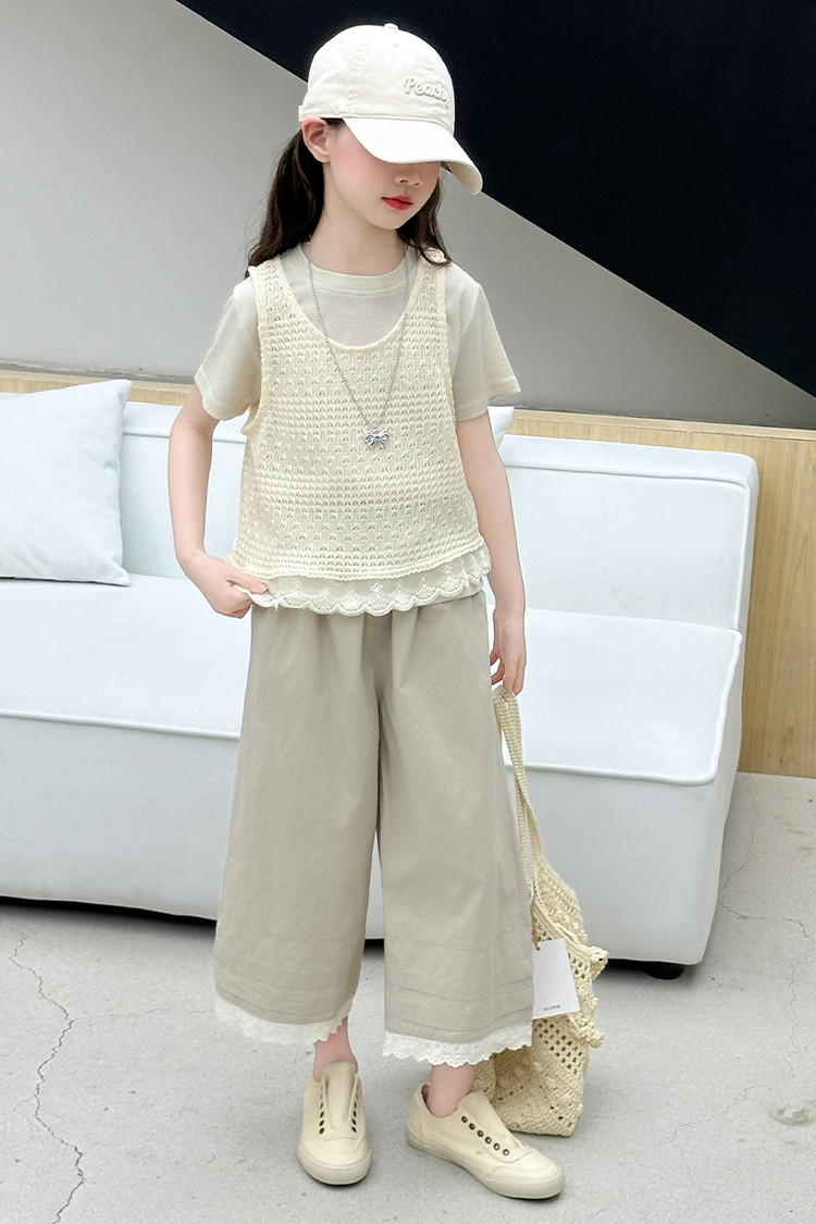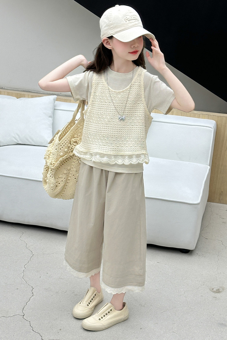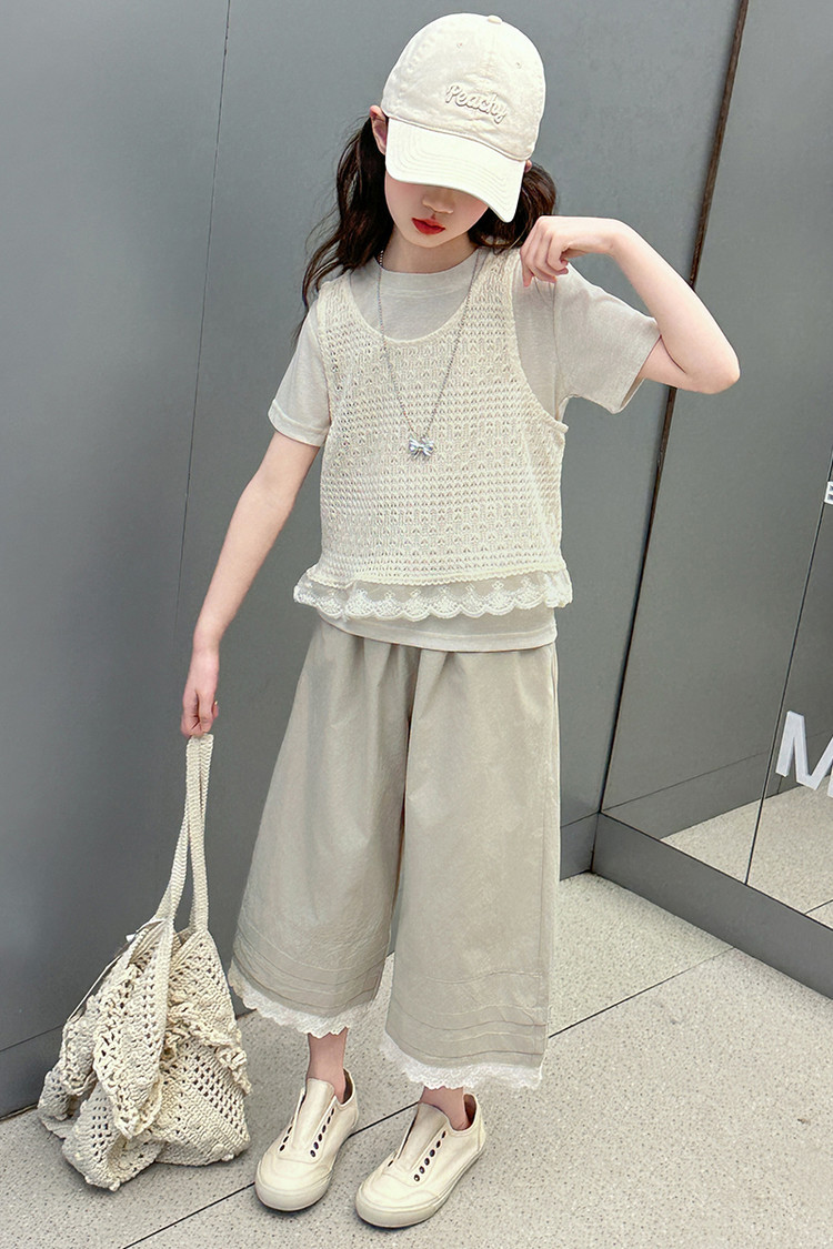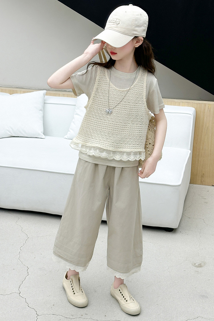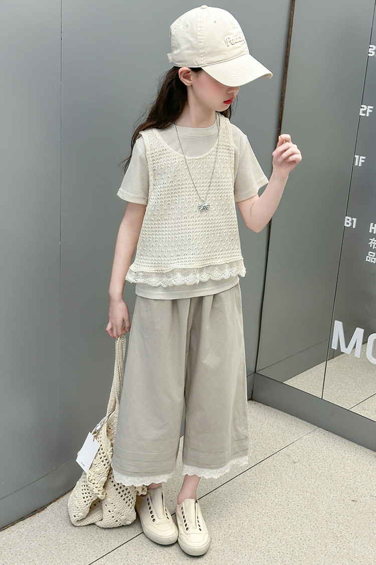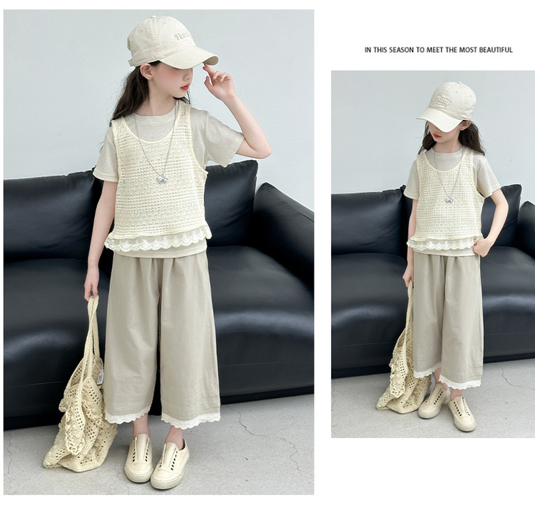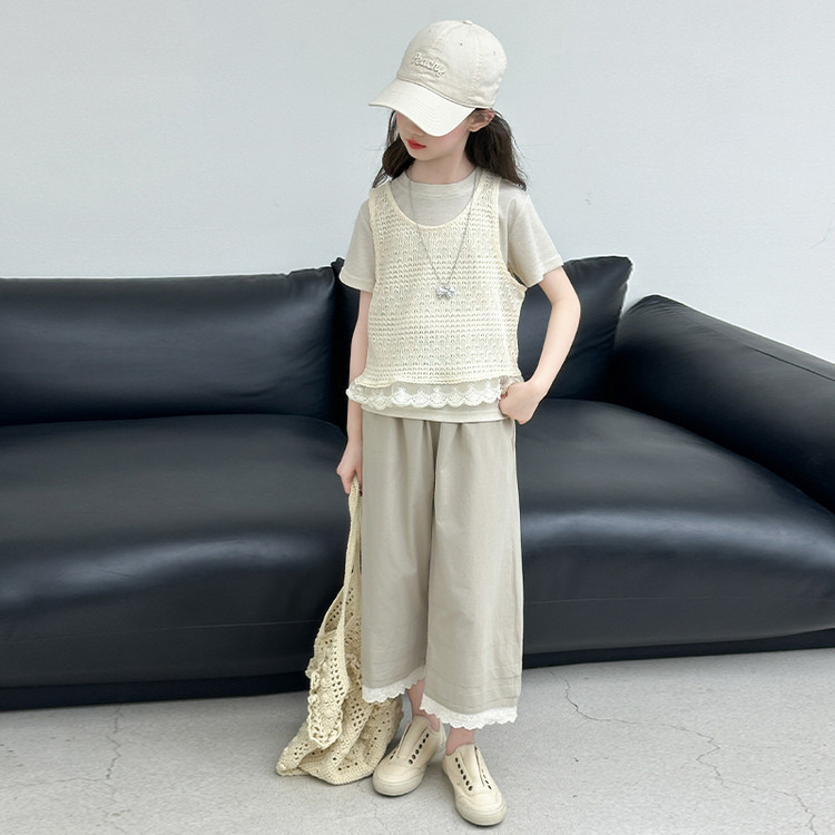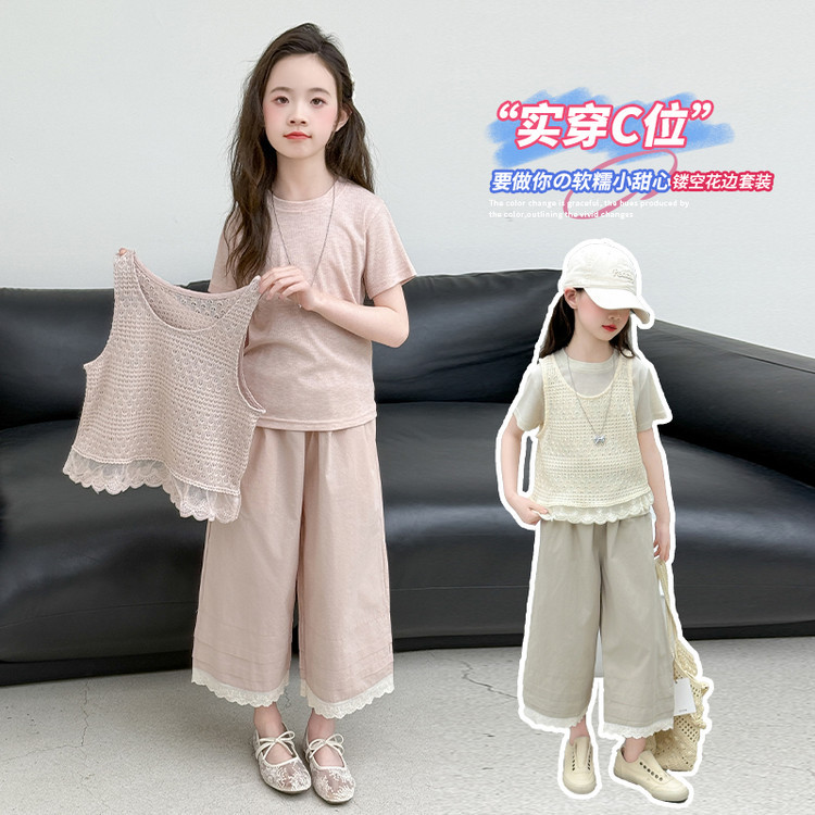 여아 여름 정장 레이스 아동 스타일 조끼 여아 여름 반팔 티셔츠 와이드 팬츠 큰 아동용 3종 세트스토어 가기