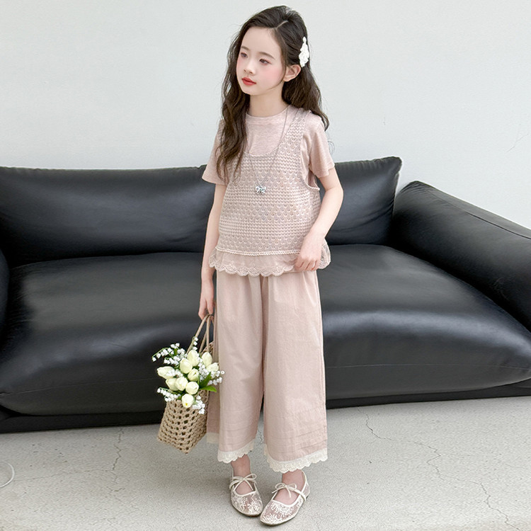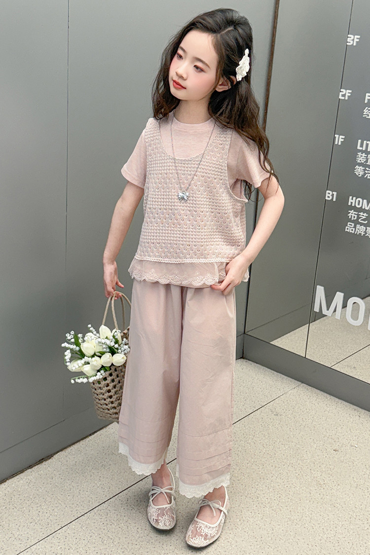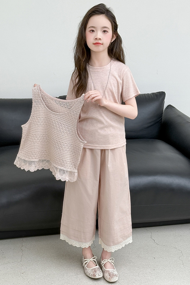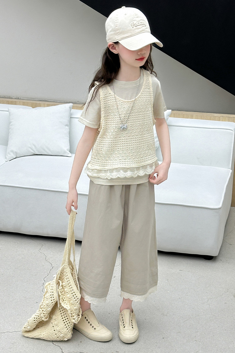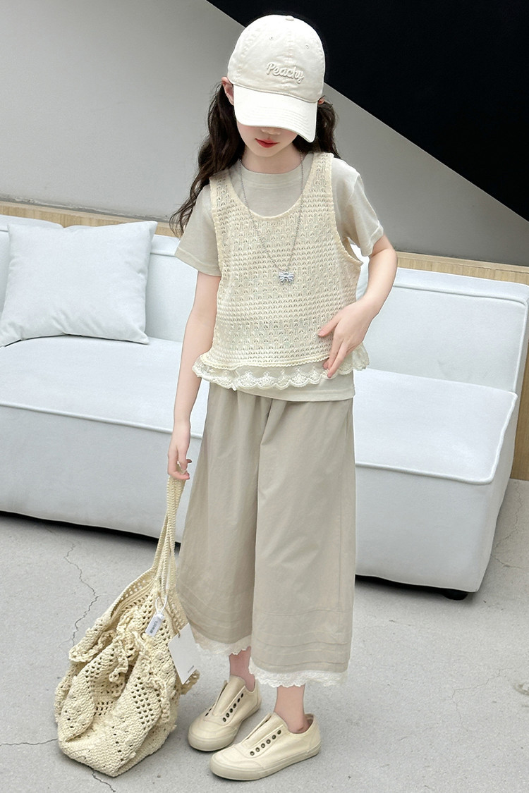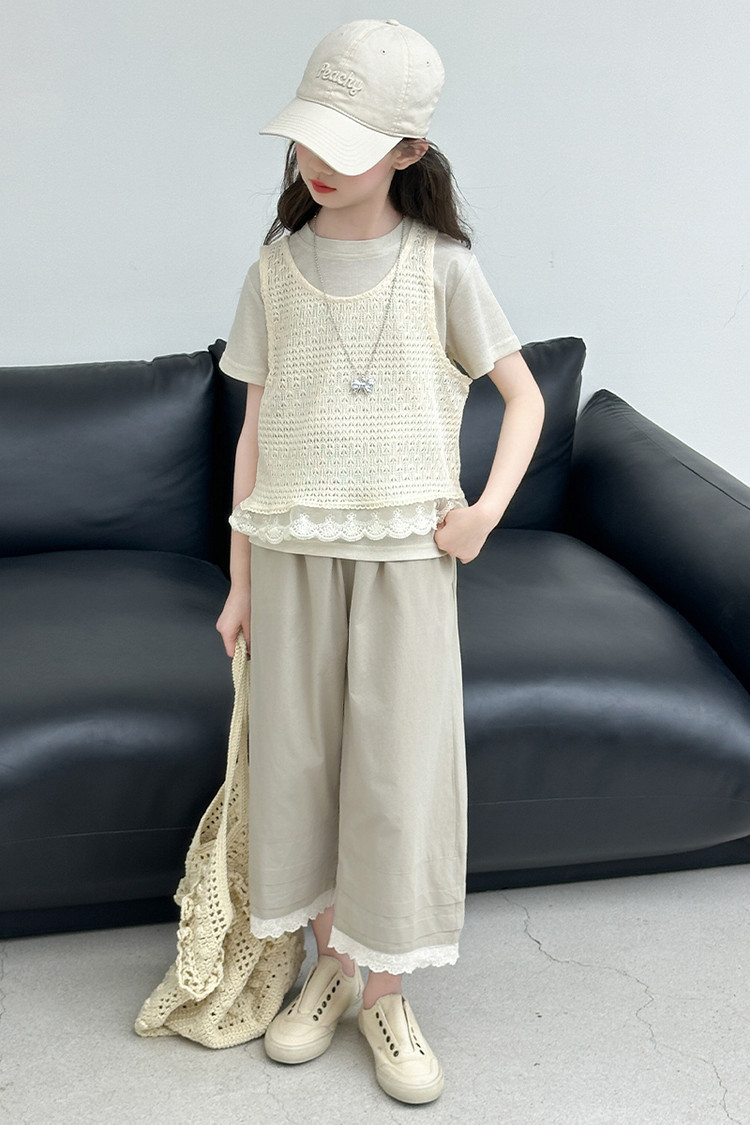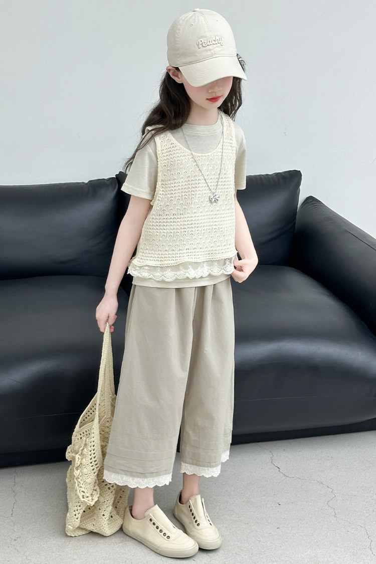 여아 여름 정장 레이스 아동 스타일 조끼 여아 여름 반팔 티셔츠 와이드 팬츠 큰 아동용 3종 세트스토어 가기