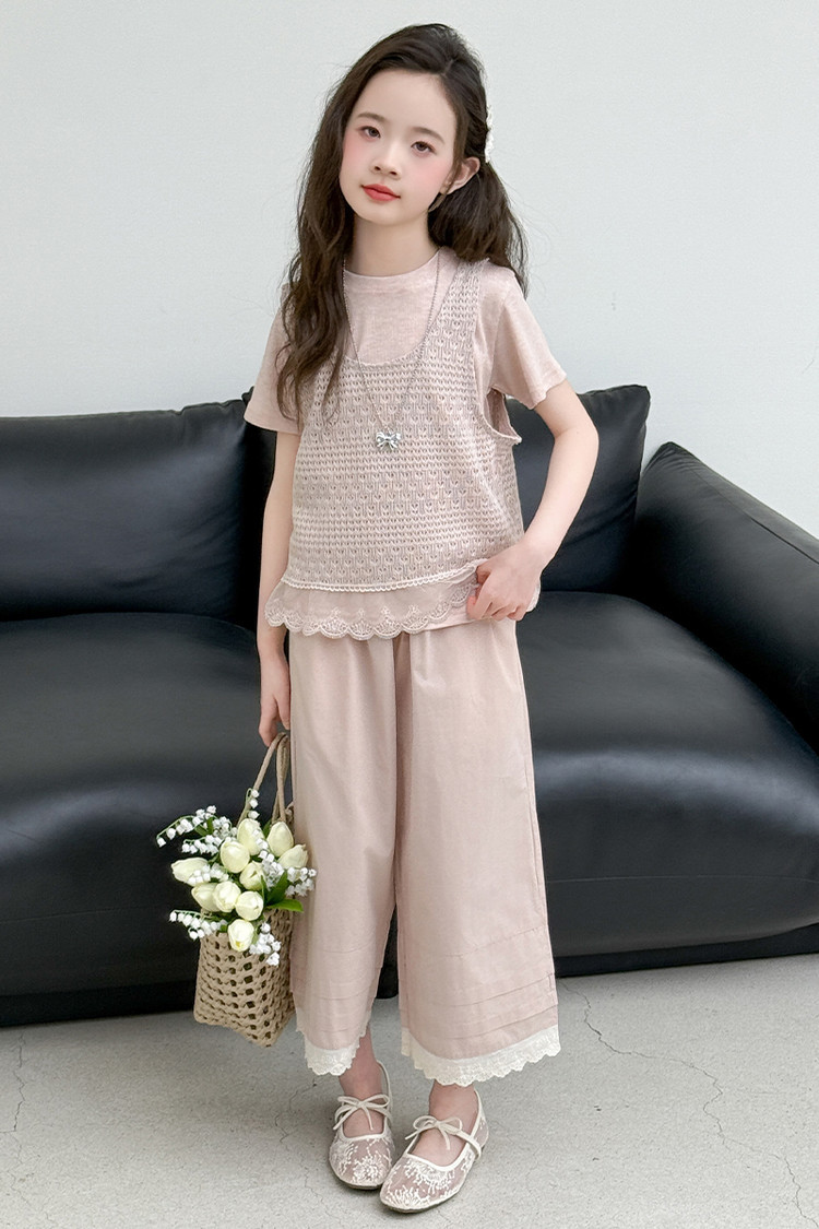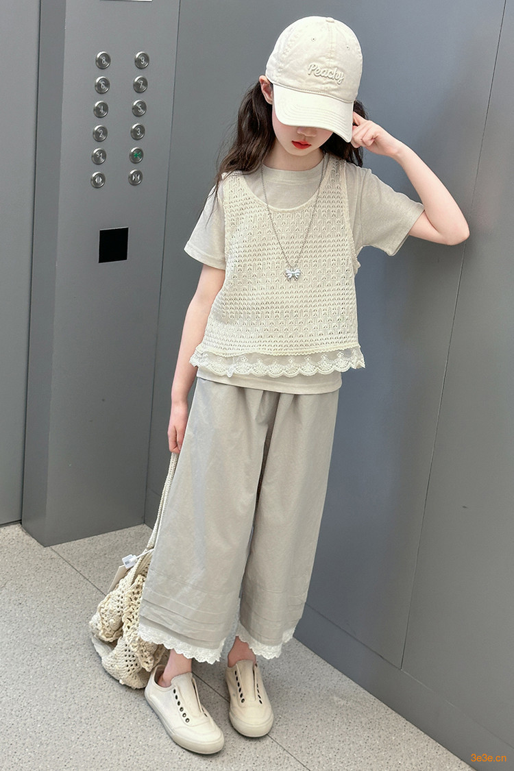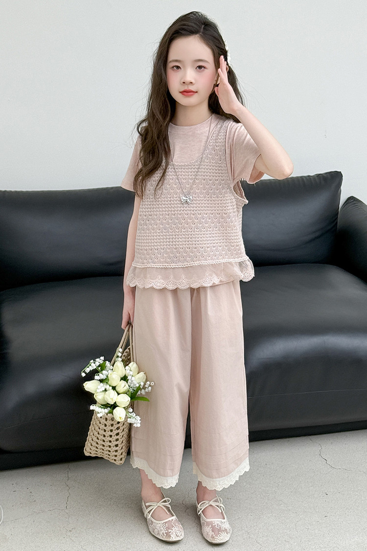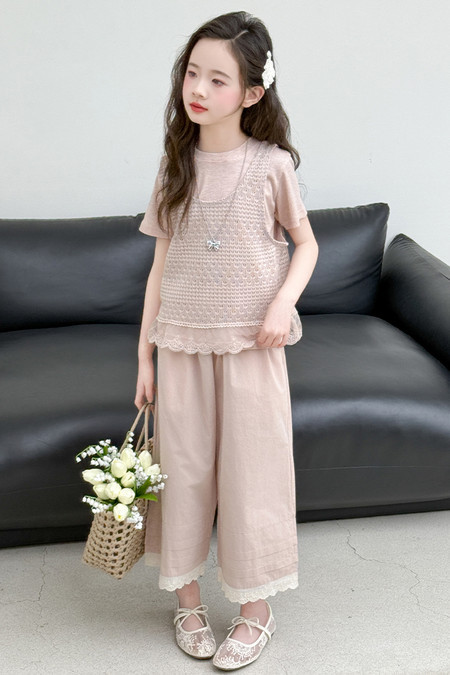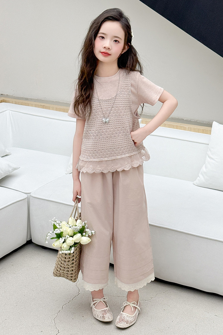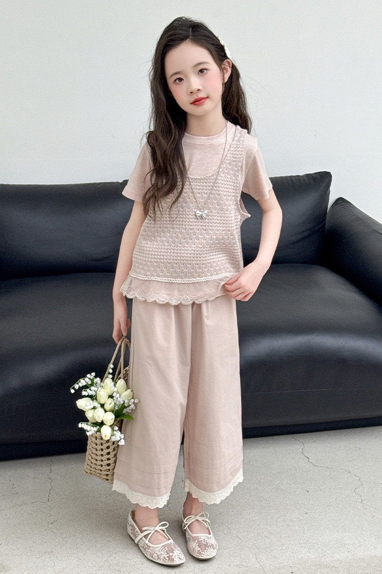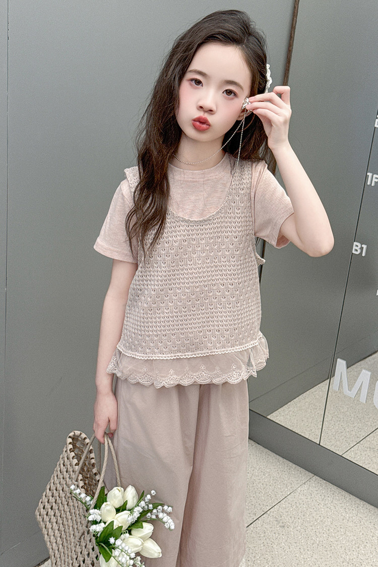 여아 여름 정장 레이스 아동 스타일 조끼 여아 여름 반팔 티셔츠 와이드 팬츠 큰 아동용 3종 세트스토어 가기