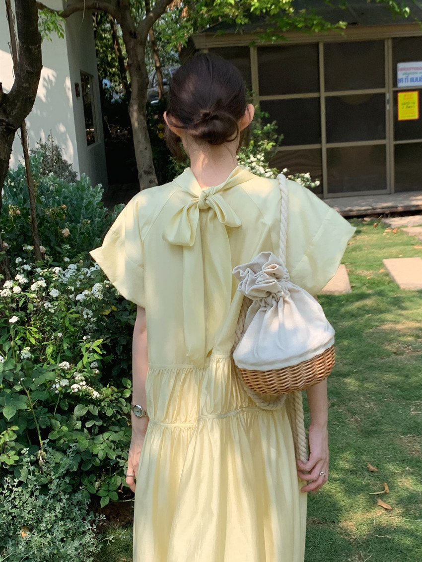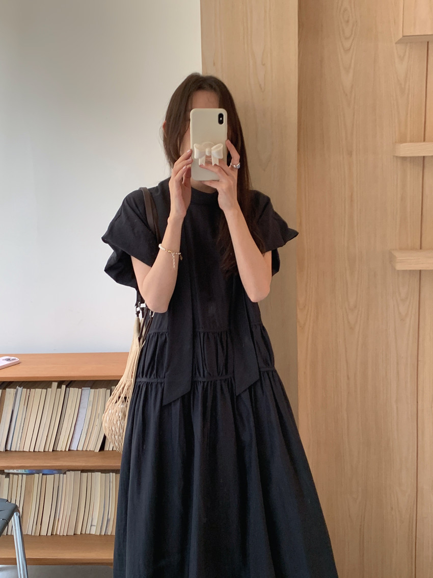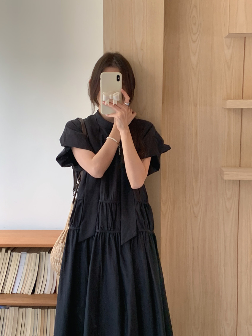 재고 리얼 샷 프랑스 복고풍 틈새 리본 디자인 느슨한 할인 허리 스트랩 긴 원피스 3 색