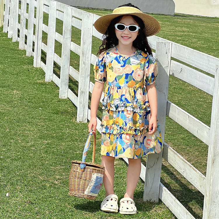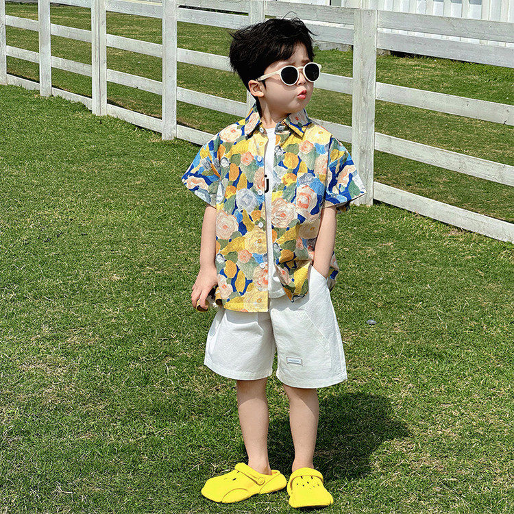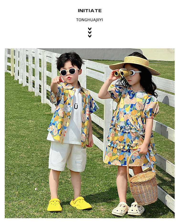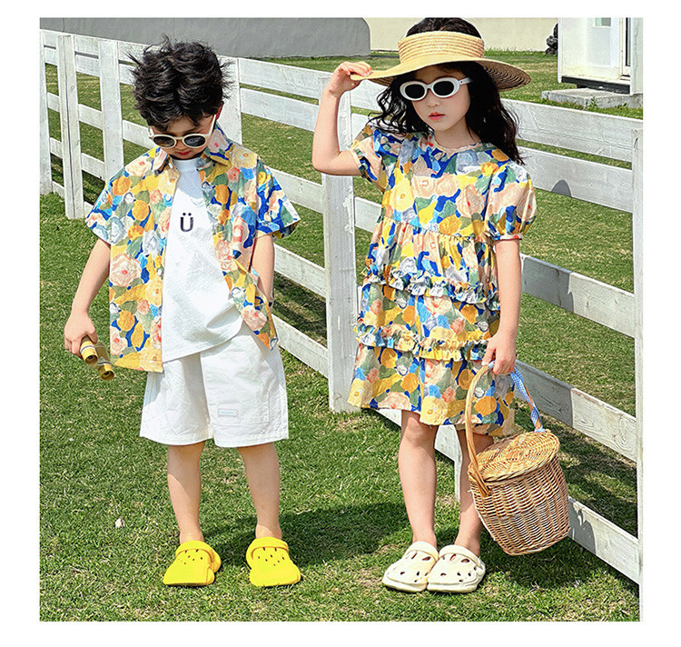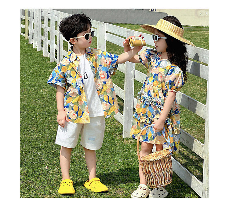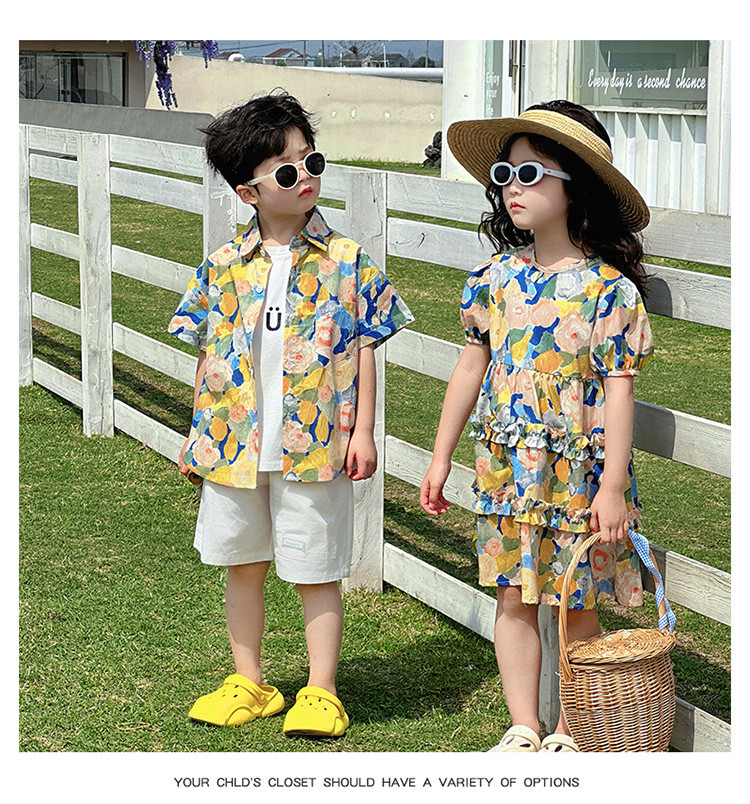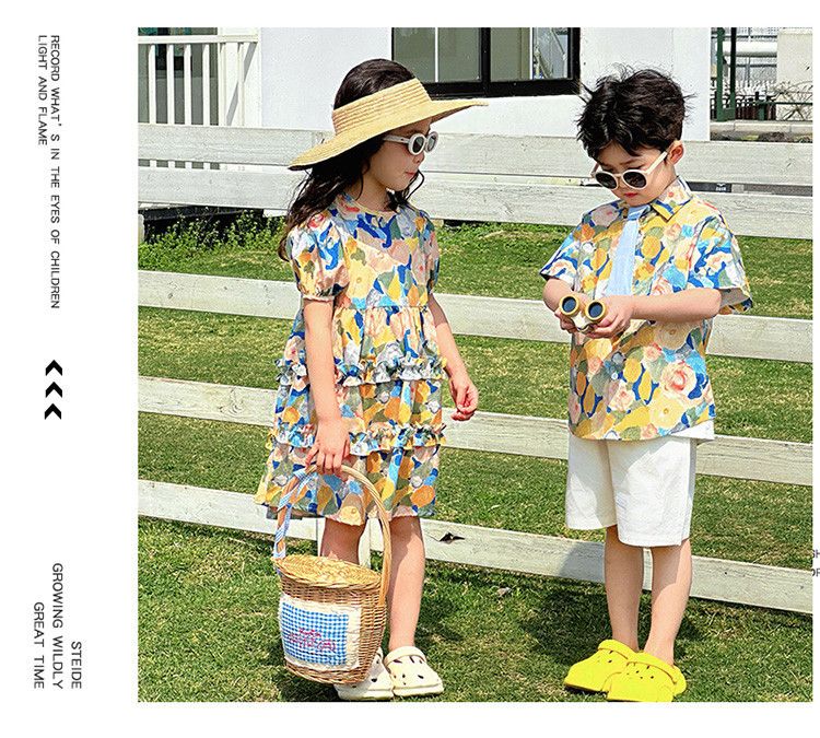 도파민 아동복 인터넷 연예인 부모-자식 자매 의류 소년 꽃무늬 셔츠 반팔 정장 소녀 드레스 유행스토어 가기