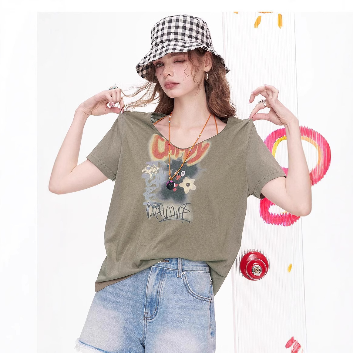 고블린 포켓 V 넥 프린트 반팔 티셔츠 여성용 2025 년 여름 새로운 느슨한 슬리밍 캐주얼 니쉬 탑