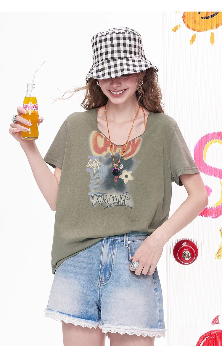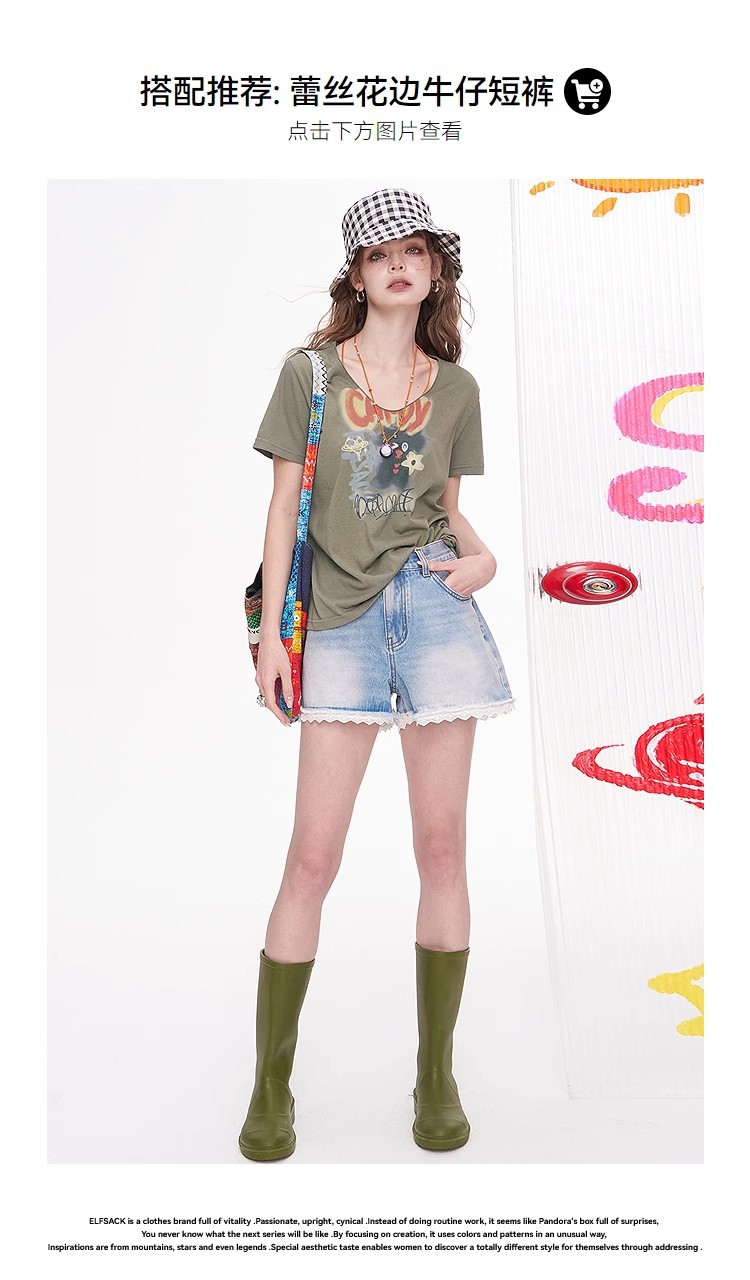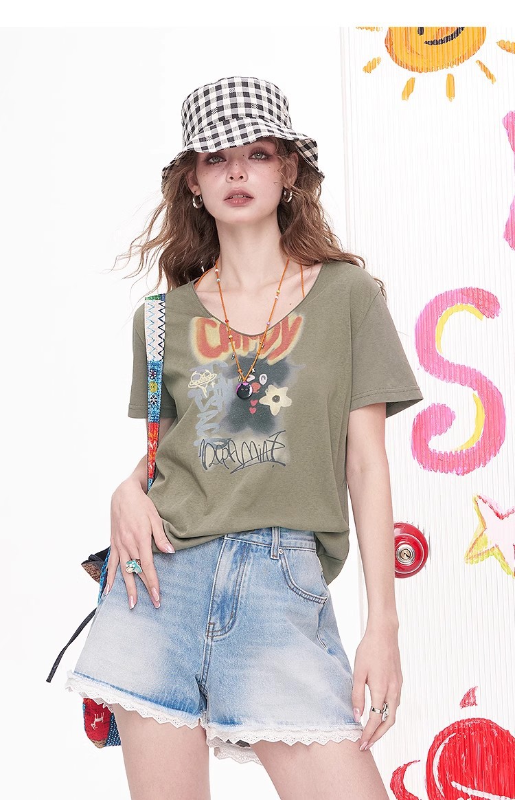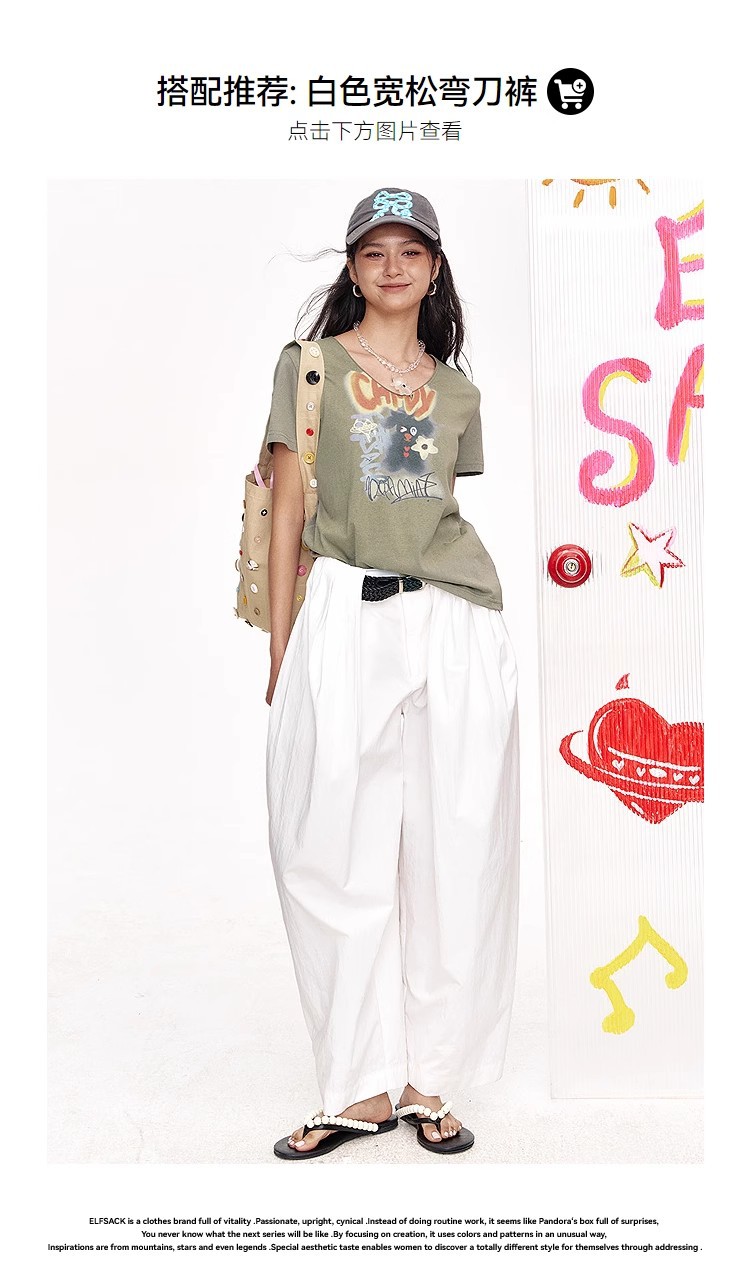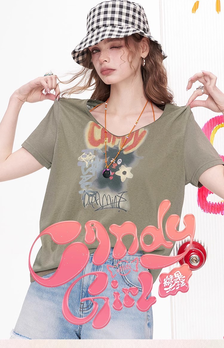 고블린 포켓 V 넥 프린트 반팔 티셔츠 여성용 2025 년 여름 새로운 느슨한 슬리밍 캐주얼 니쉬 탑스토어 가기