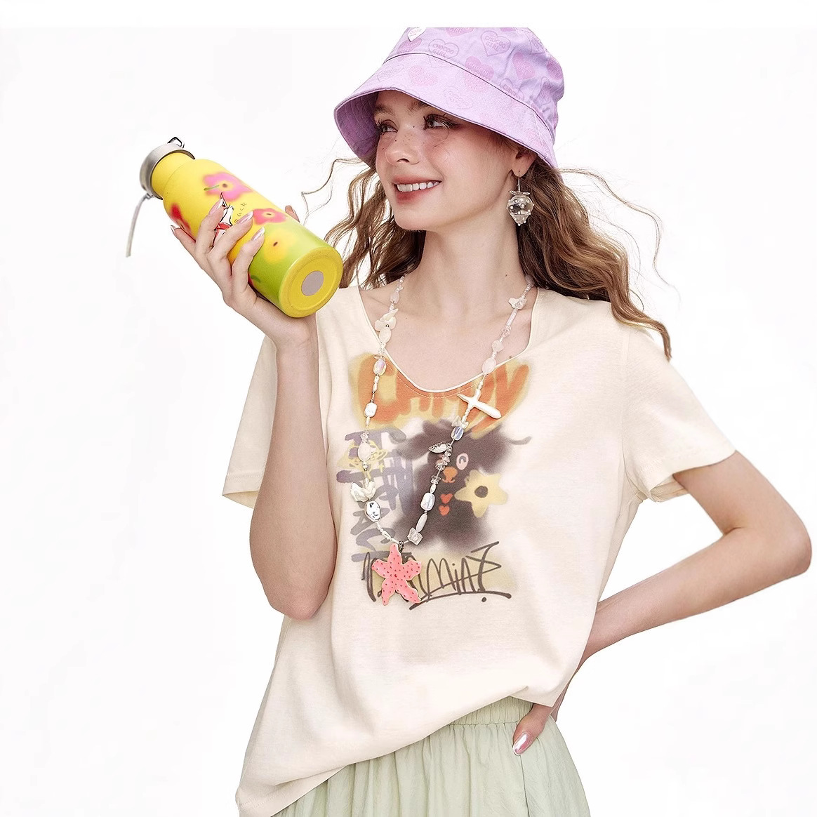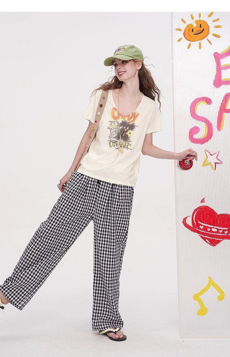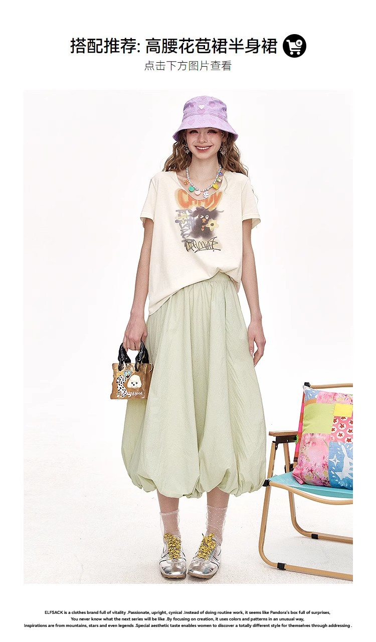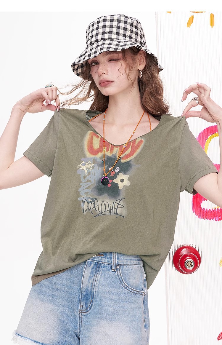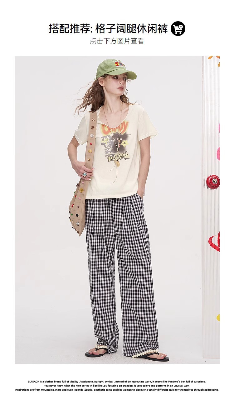 고블린 포켓 V 넥 프린트 반팔 티셔츠 여성용 2025 년 여름 새로운 느슨한 슬리밍 캐주얼 니쉬 탑스토어 가기
