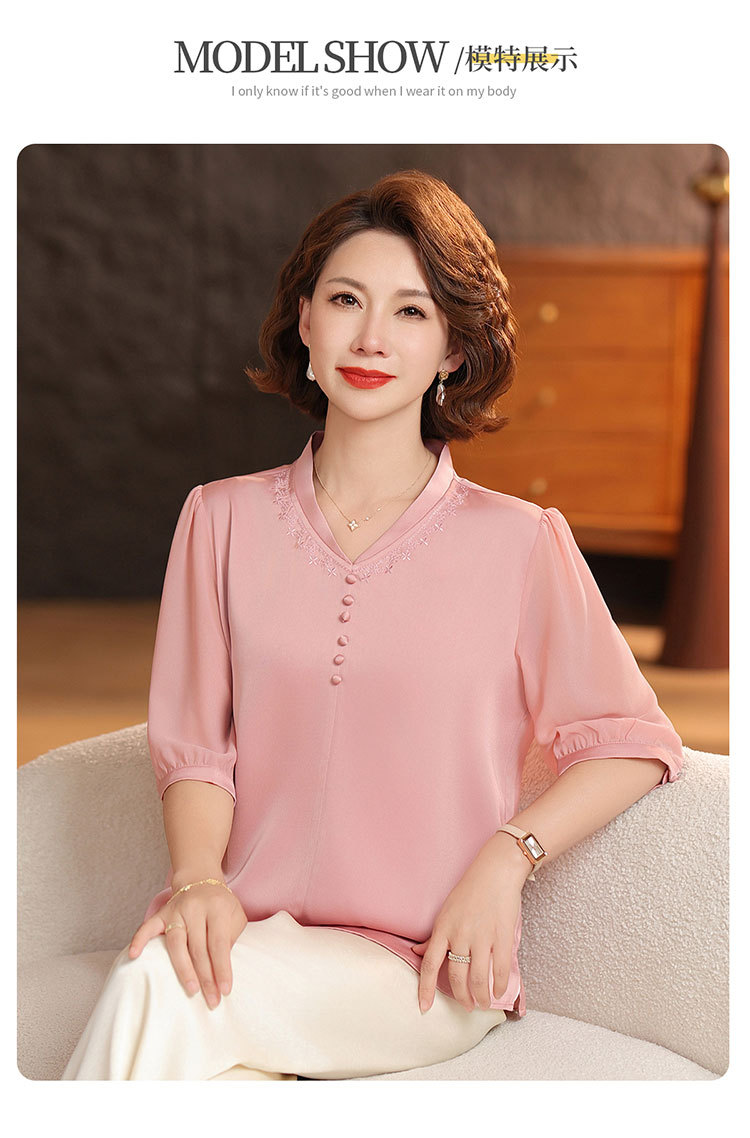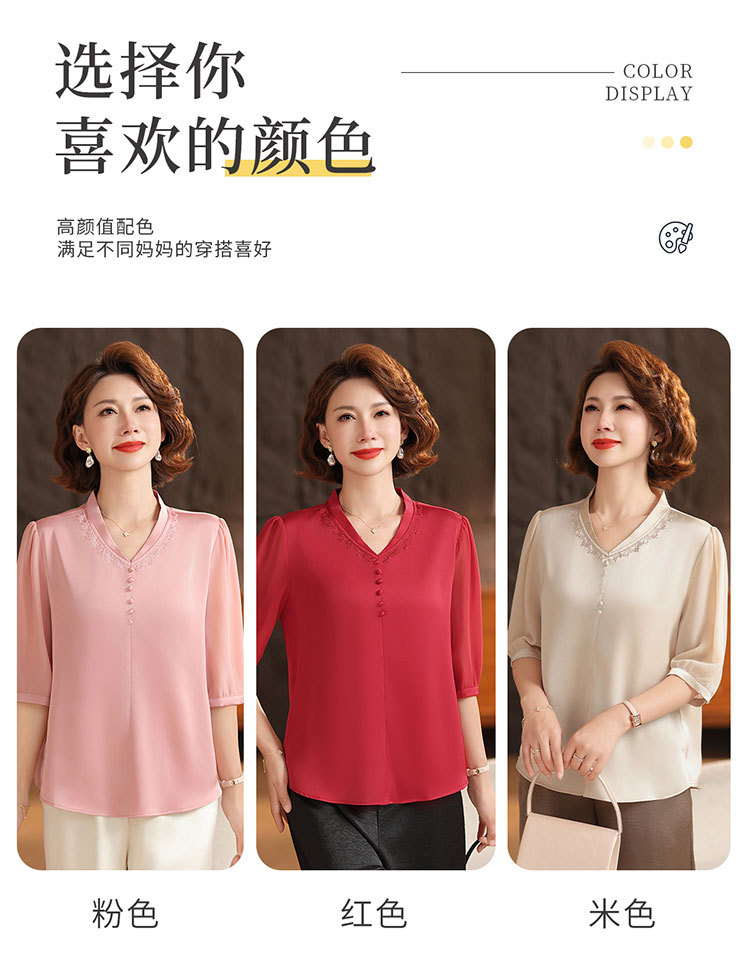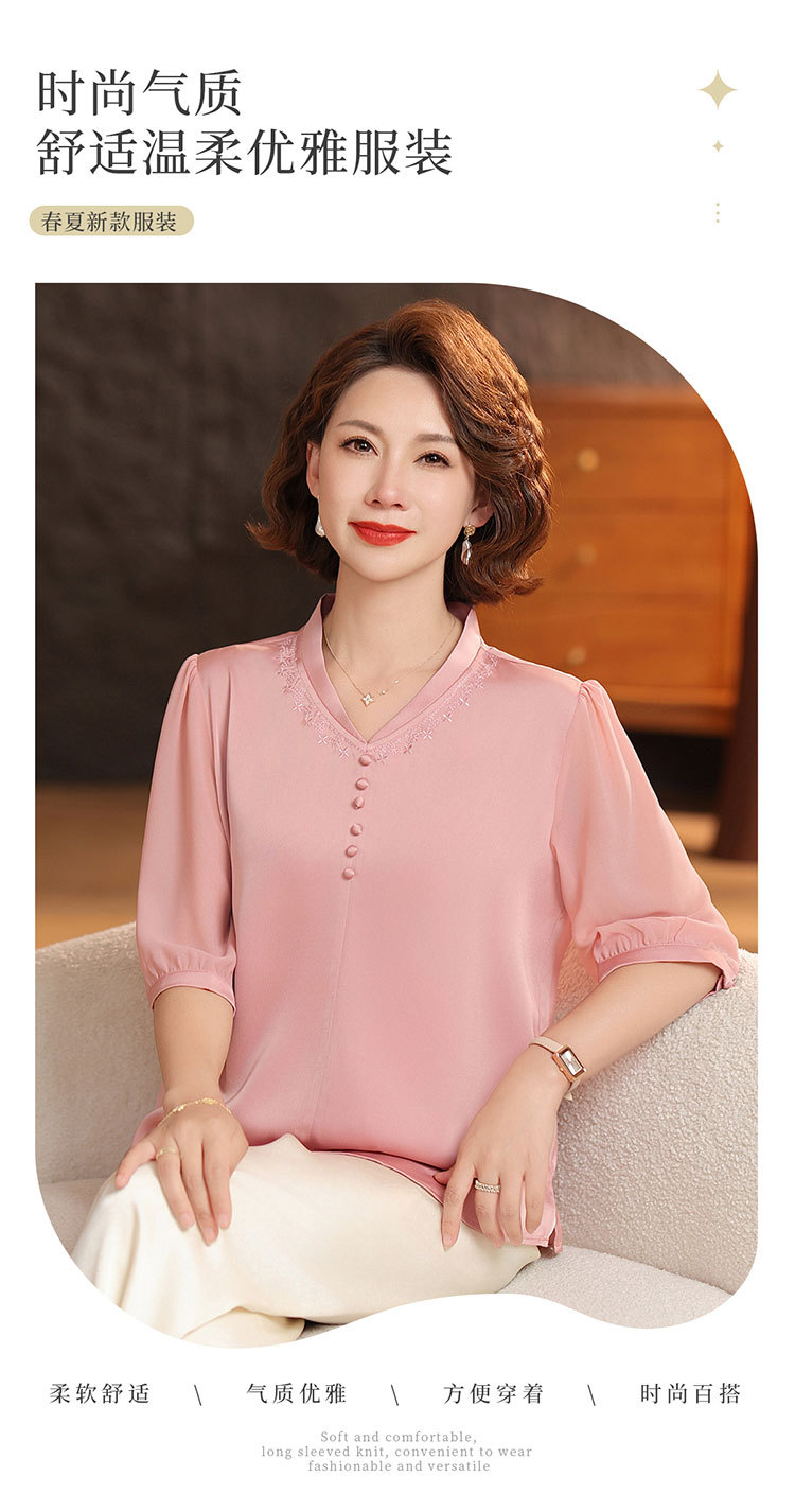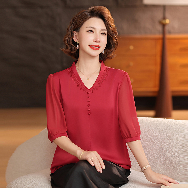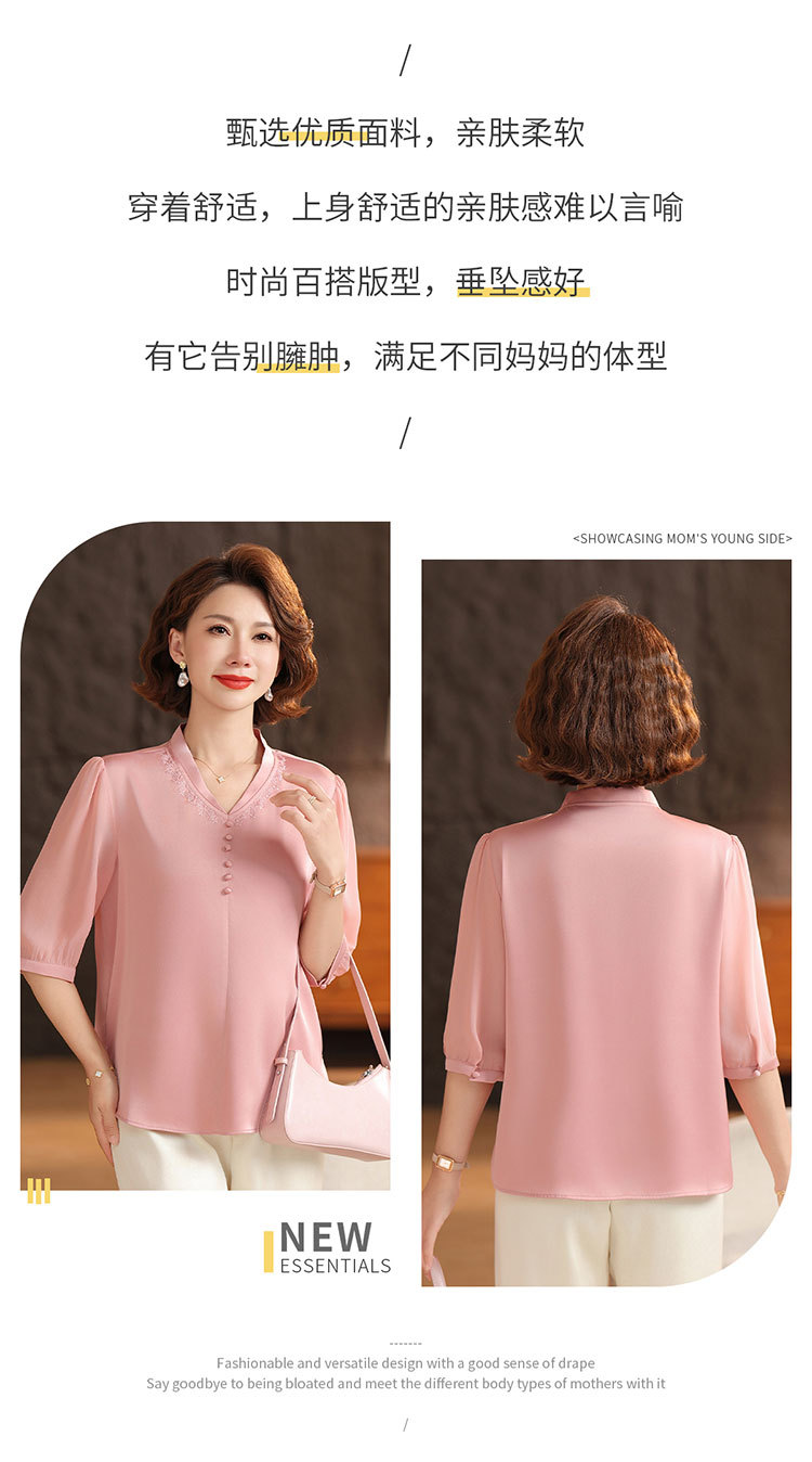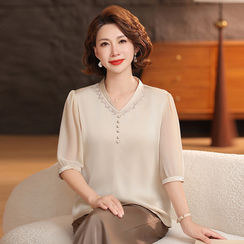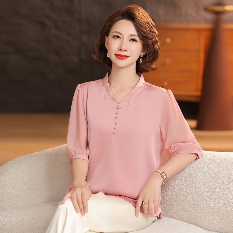 하이 엔드 센스 셔츠 여자 2025 년 여름 새로운 실크 V-넥 티셔츠 어머니의 올 매치 살을 덮는 슬림 셔츠 탑