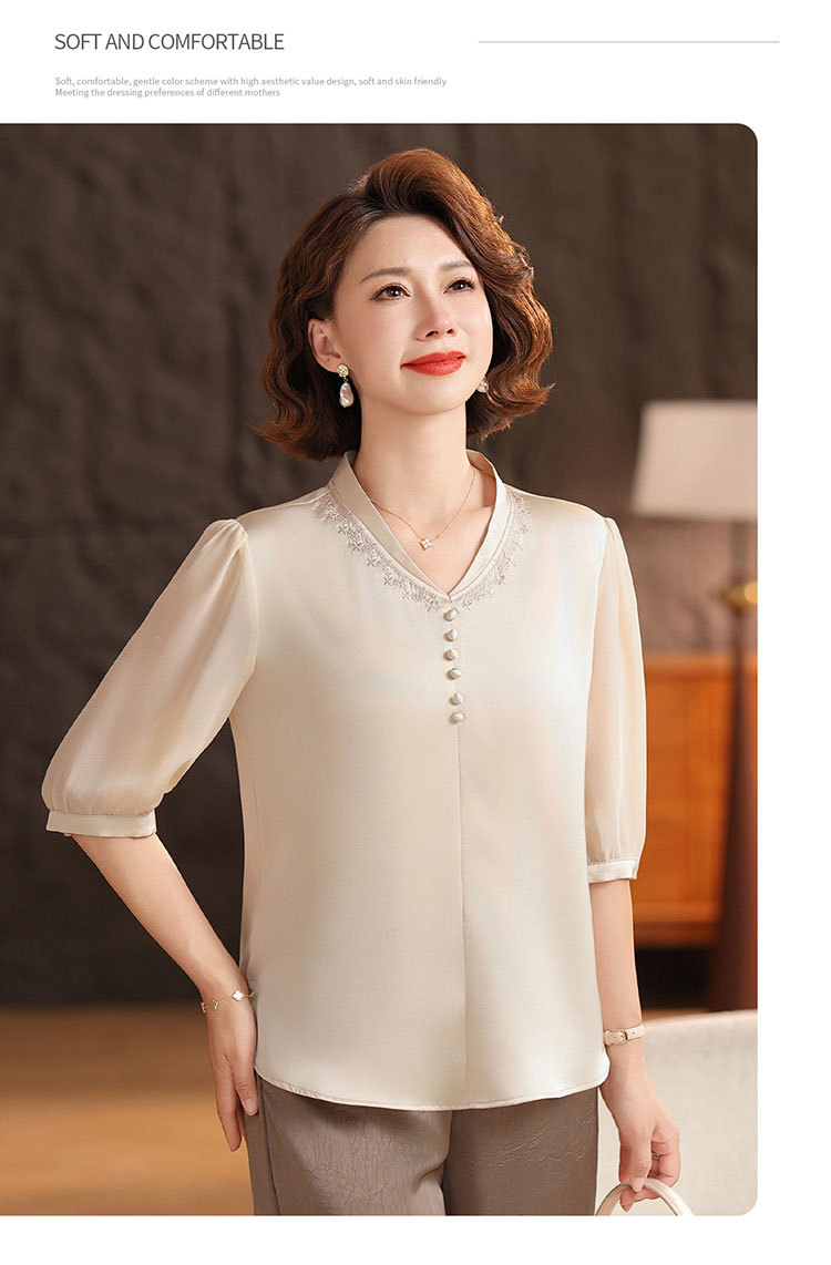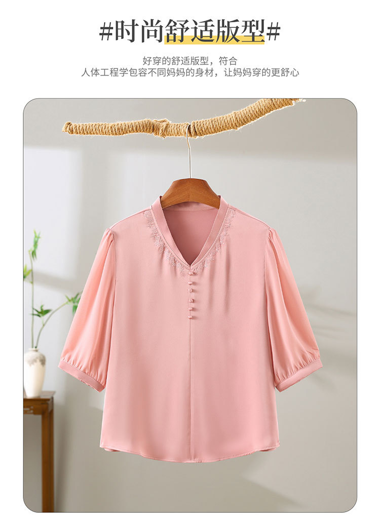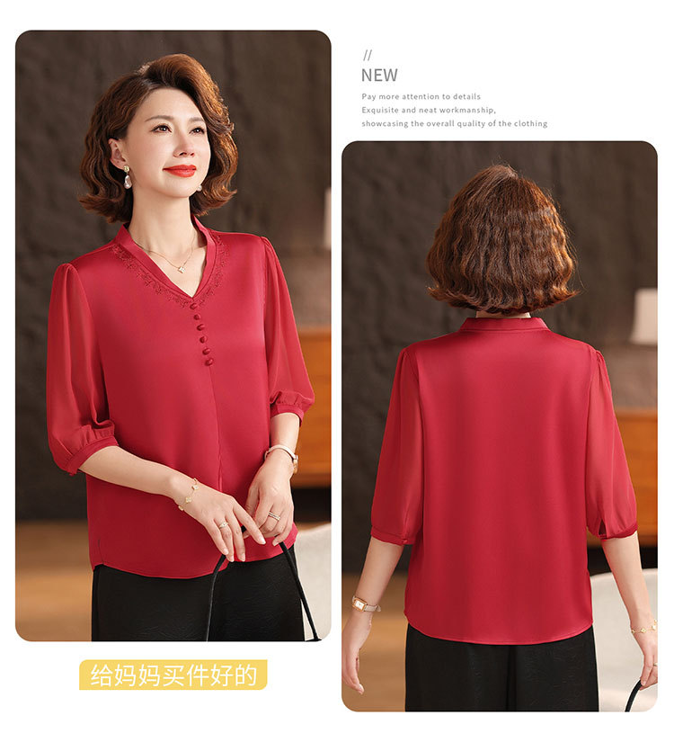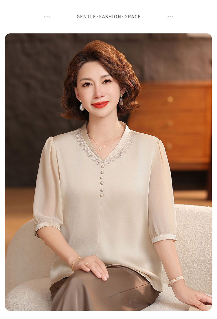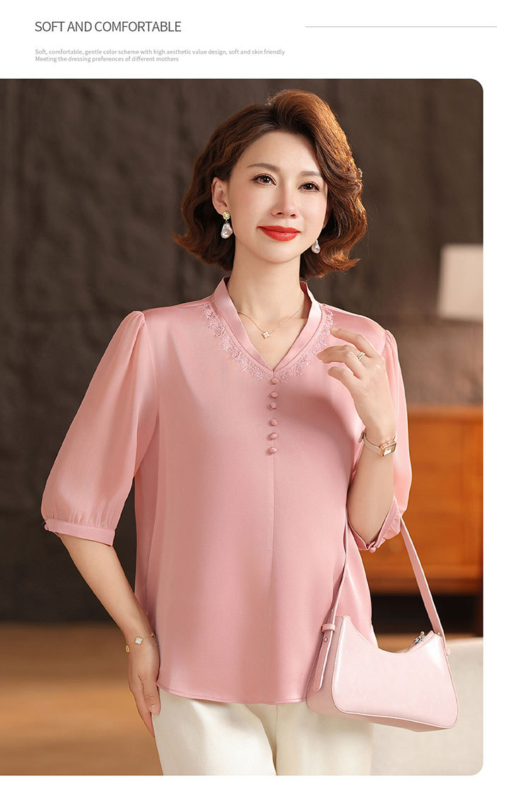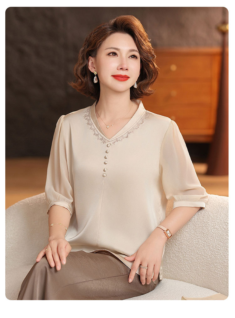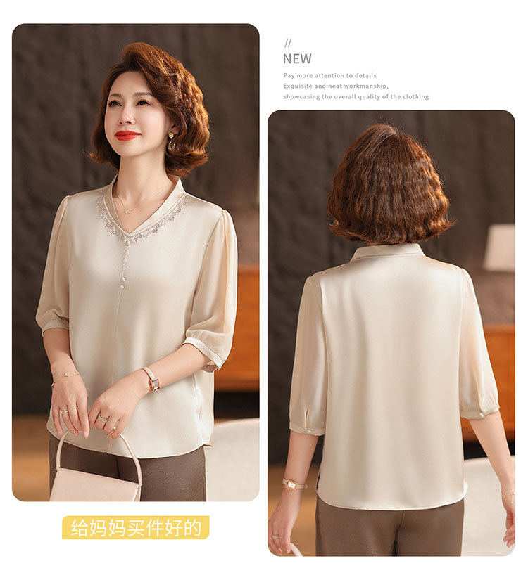하이 엔드 센스 셔츠 여자 2025 년 여름 새로운 실크 V-넥 티셔츠 어머니의 올 매치 살을 덮는 슬림 셔츠 탑