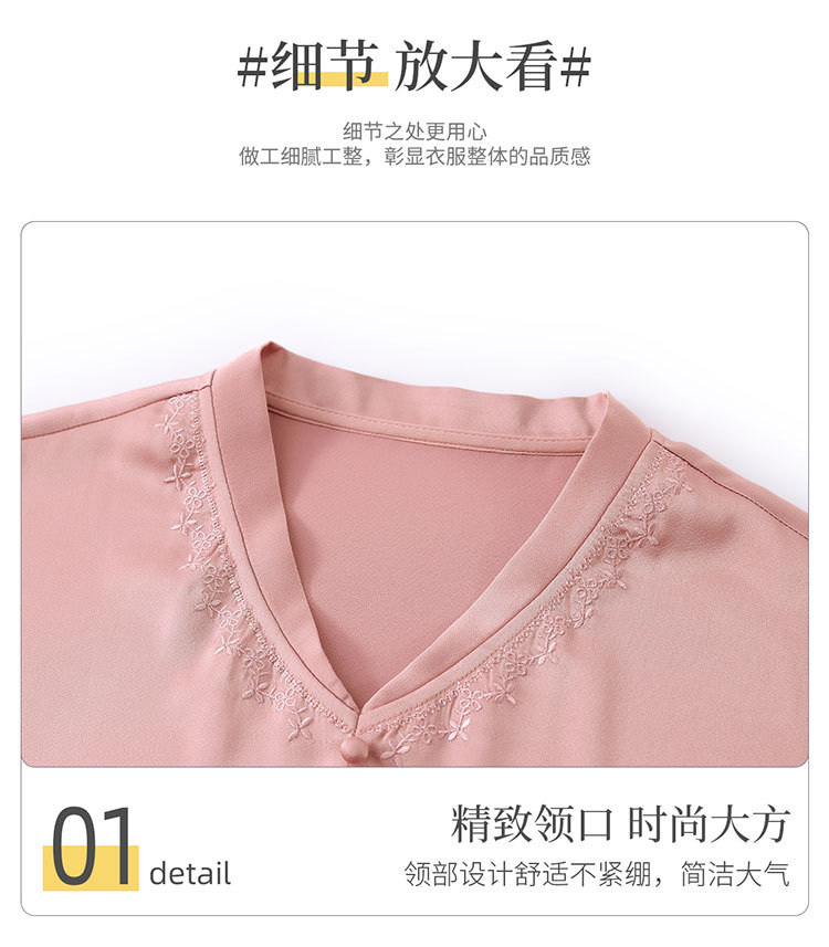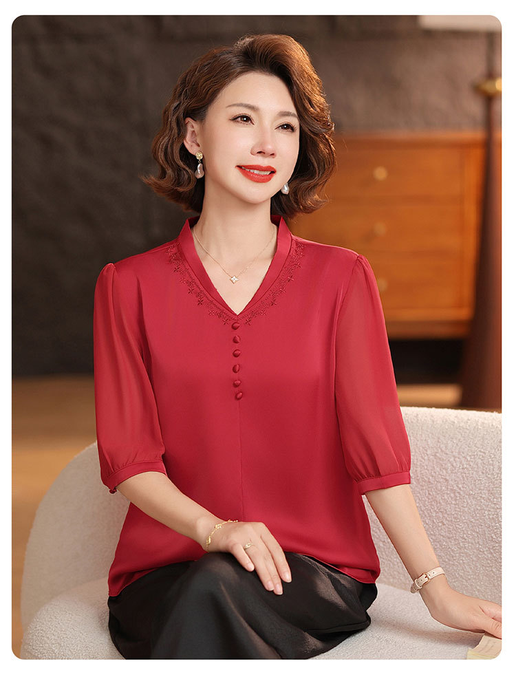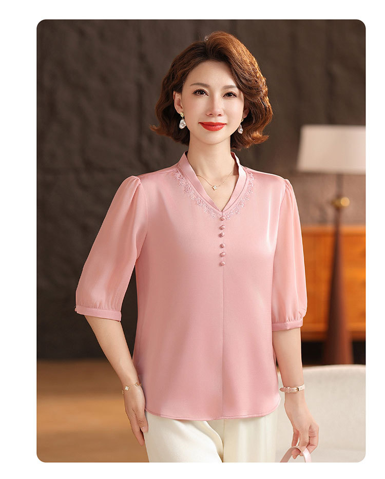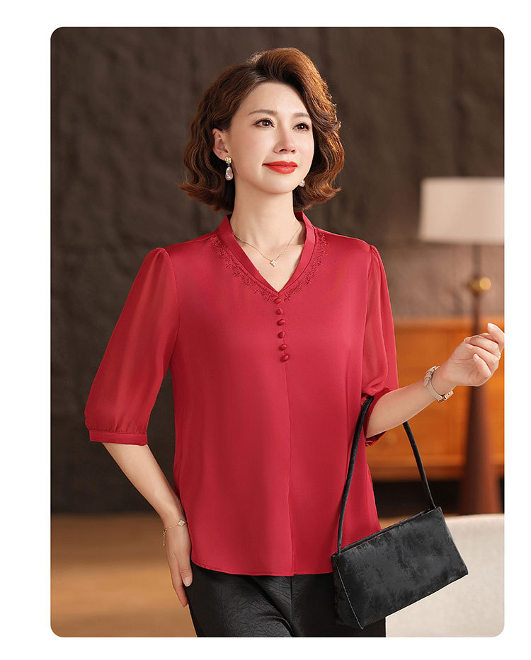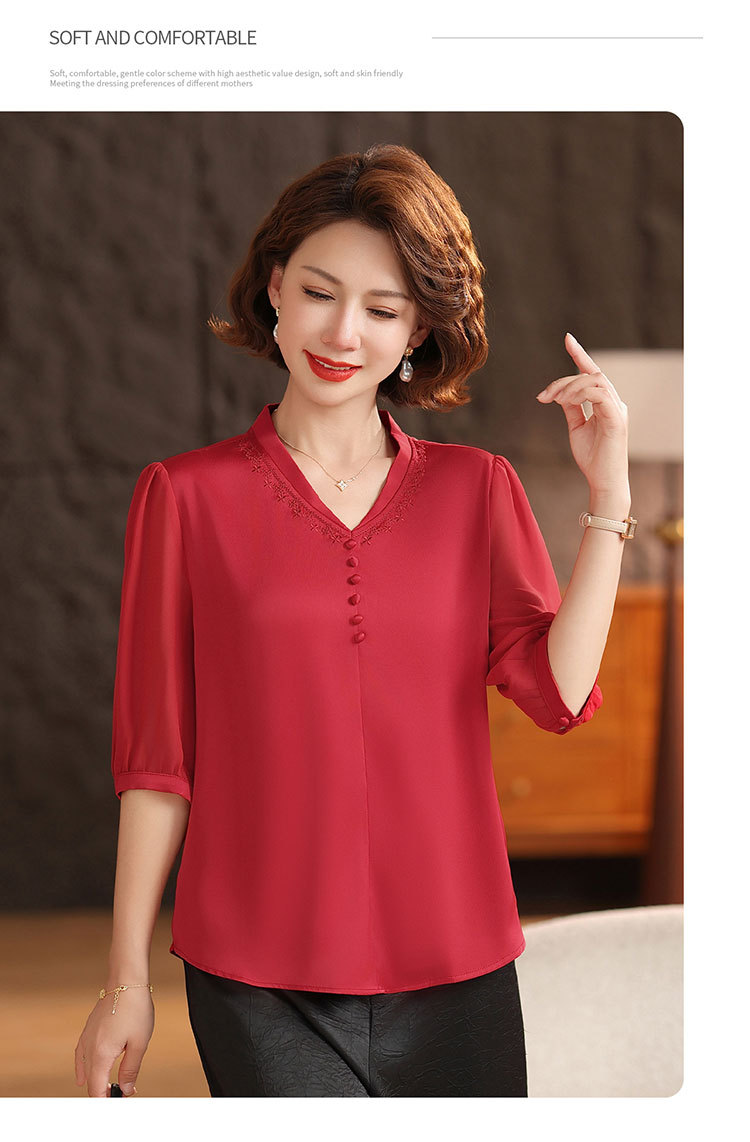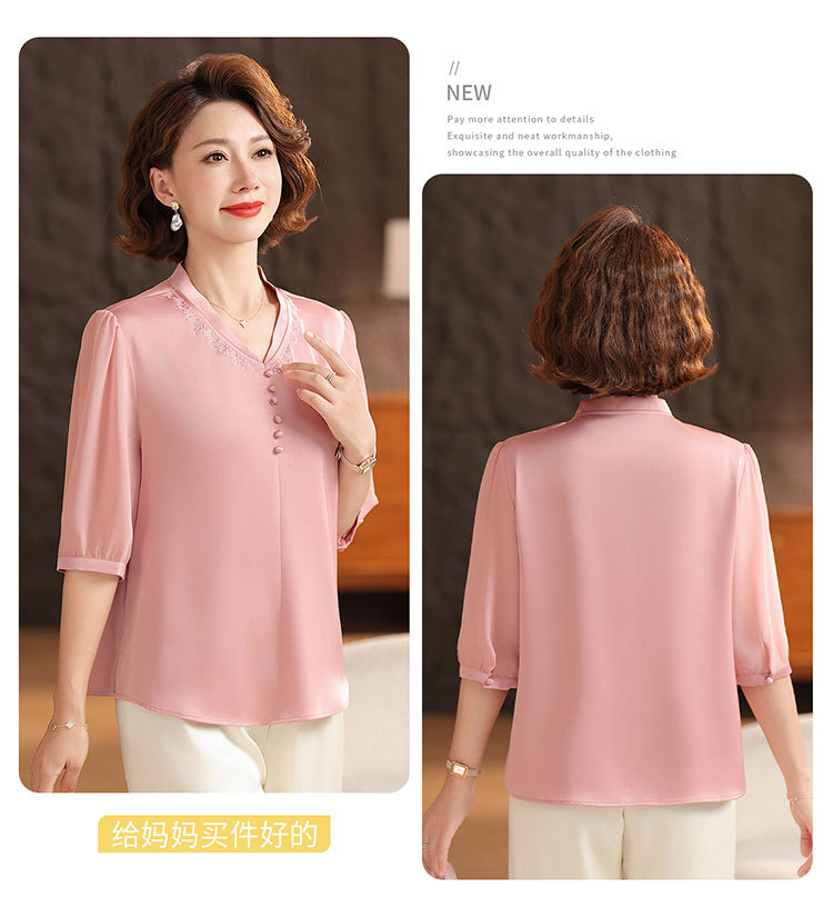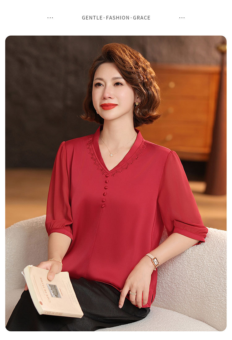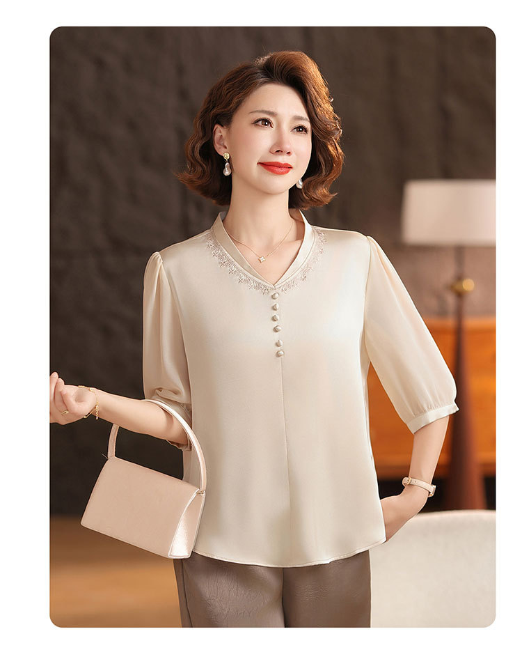 하이 엔드 센스 셔츠 여자 2025 년 여름 새로운 실크 V-넥 티셔츠 어머니의 올 매치 살을 덮는 슬림 셔츠 탑