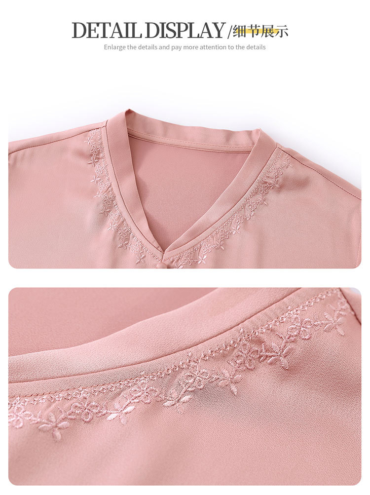 하이 엔드 센스 셔츠 여자 2025 년 여름 새로운 실크 V-넥 티셔츠 어머니의 올 매치 살을 덮는 슬림 셔츠 탑스토어 가기