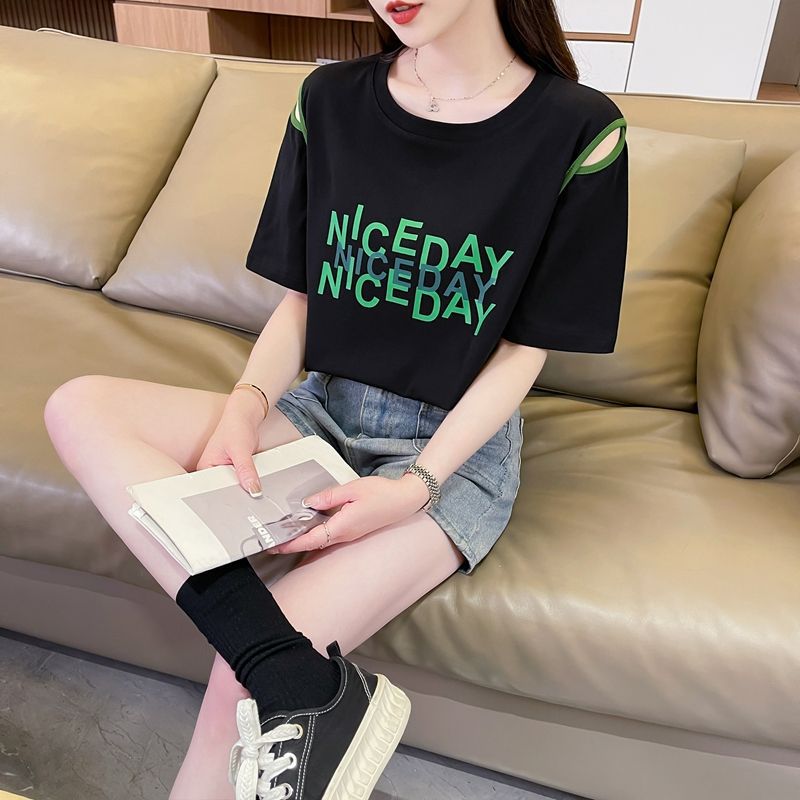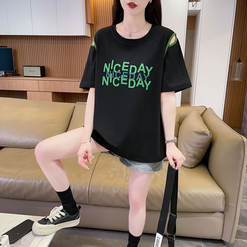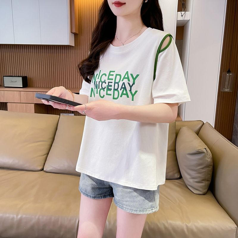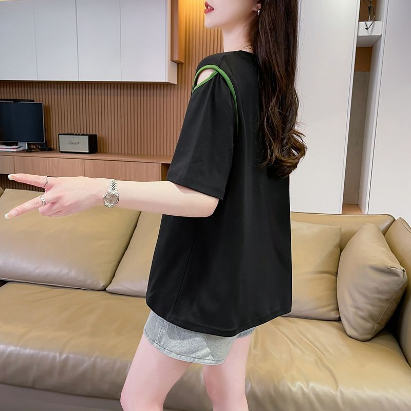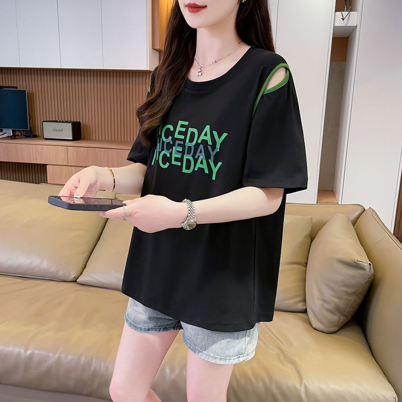 느슨한 새로운 반팔 서유럽 스타일 대형 티셔츠 여성 플러스 사이즈 통통녀 슬리밍 디자인 센스 할로우 아웃 숄더 탑스토어 가기