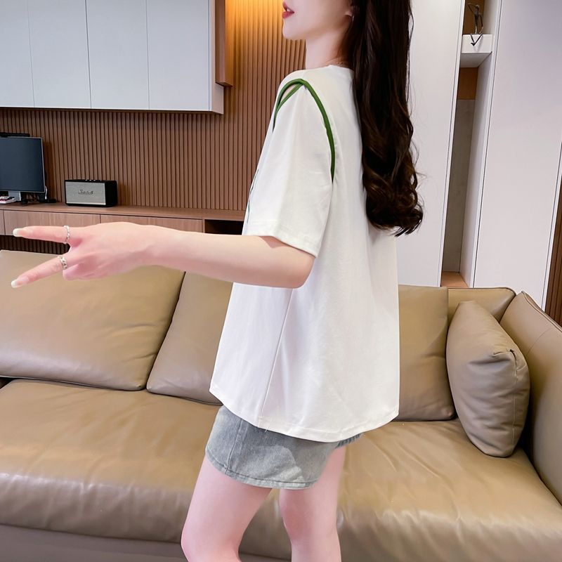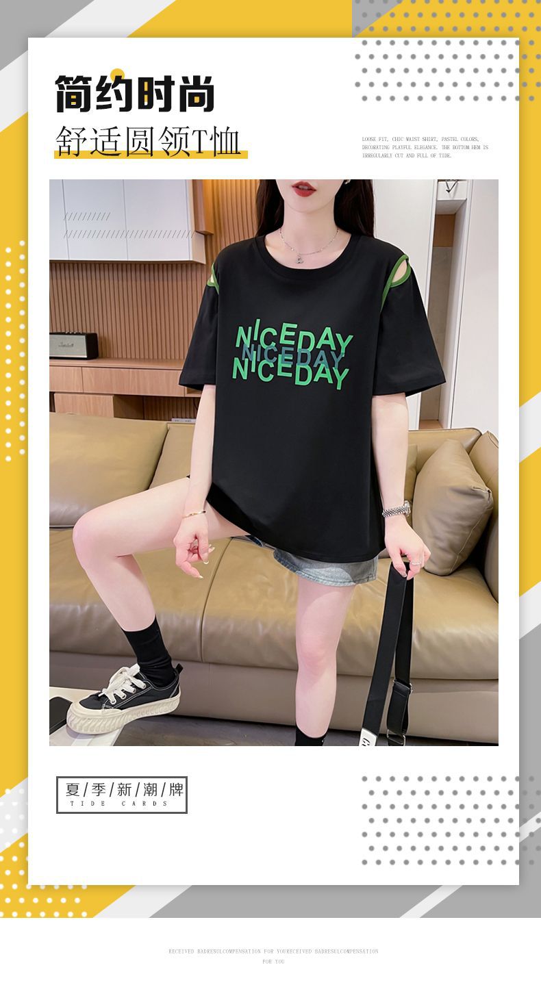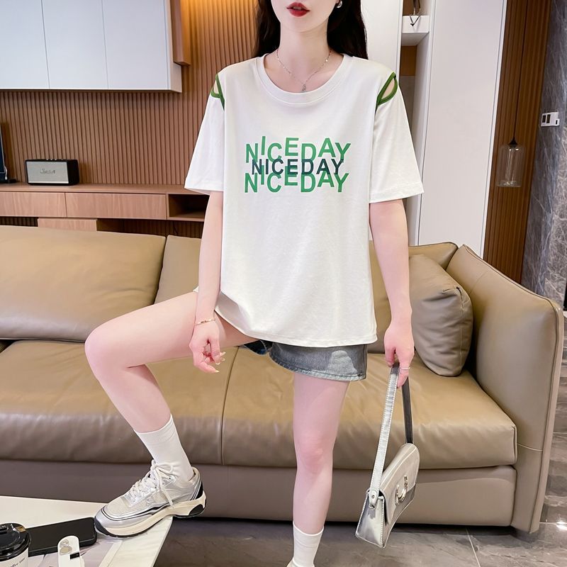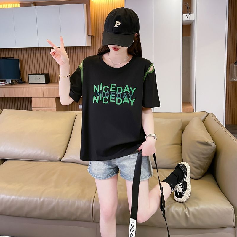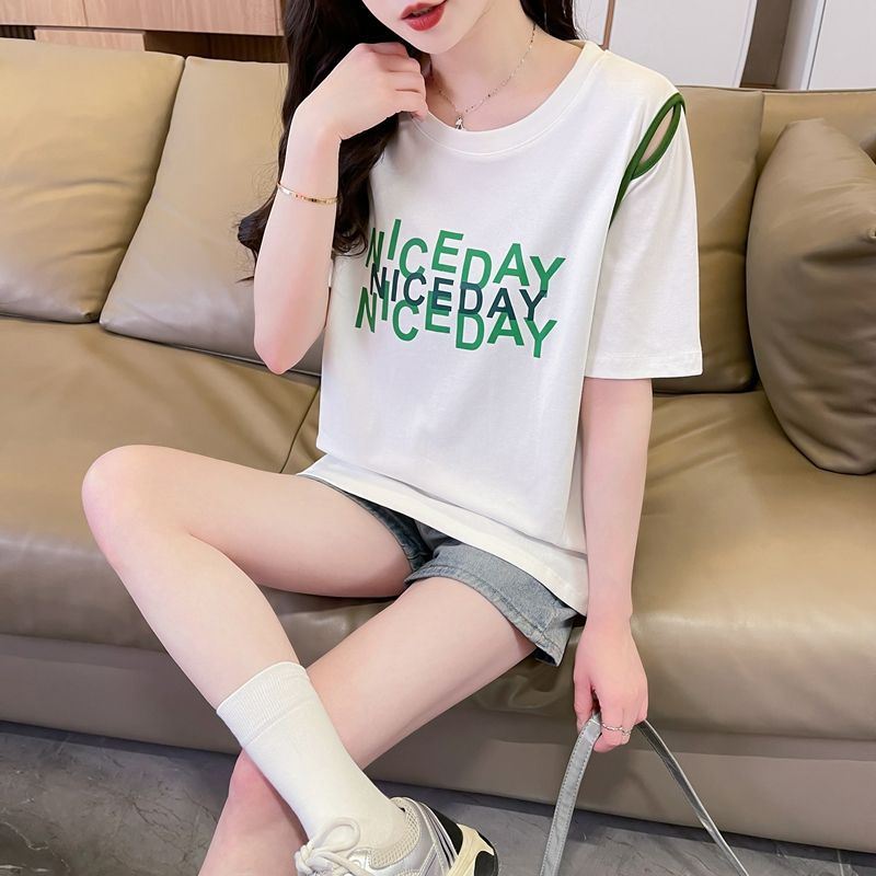느슨한 새로운 반팔 서유럽 스타일 대형 티셔츠 여성 플러스 사이즈 통통녀 슬리밍 디자인 센스 할로우 아웃 숄더 탑스토어 가기