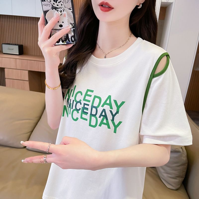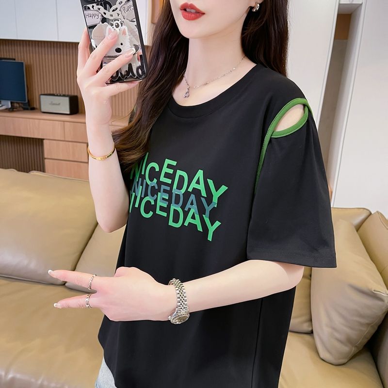 느슨한 새로운 반팔 서유럽 스타일 대형 티셔츠 여성 플러스 사이즈 통통녀 슬리밍 디자인 센스 할로우 아웃 숄더 탑