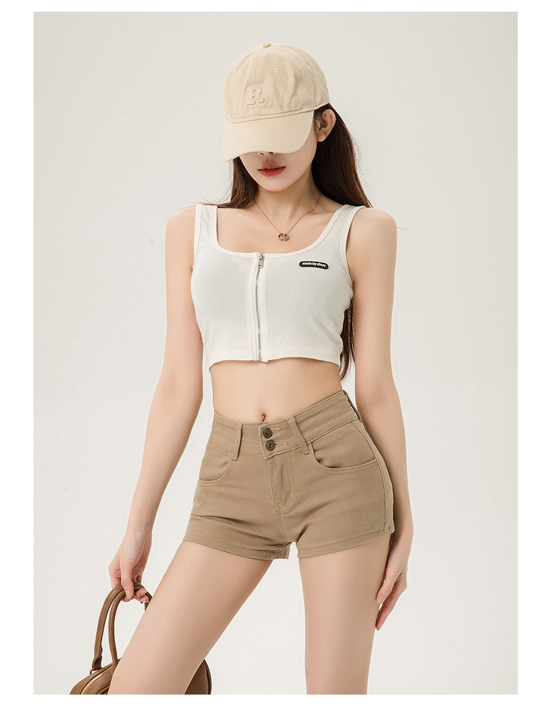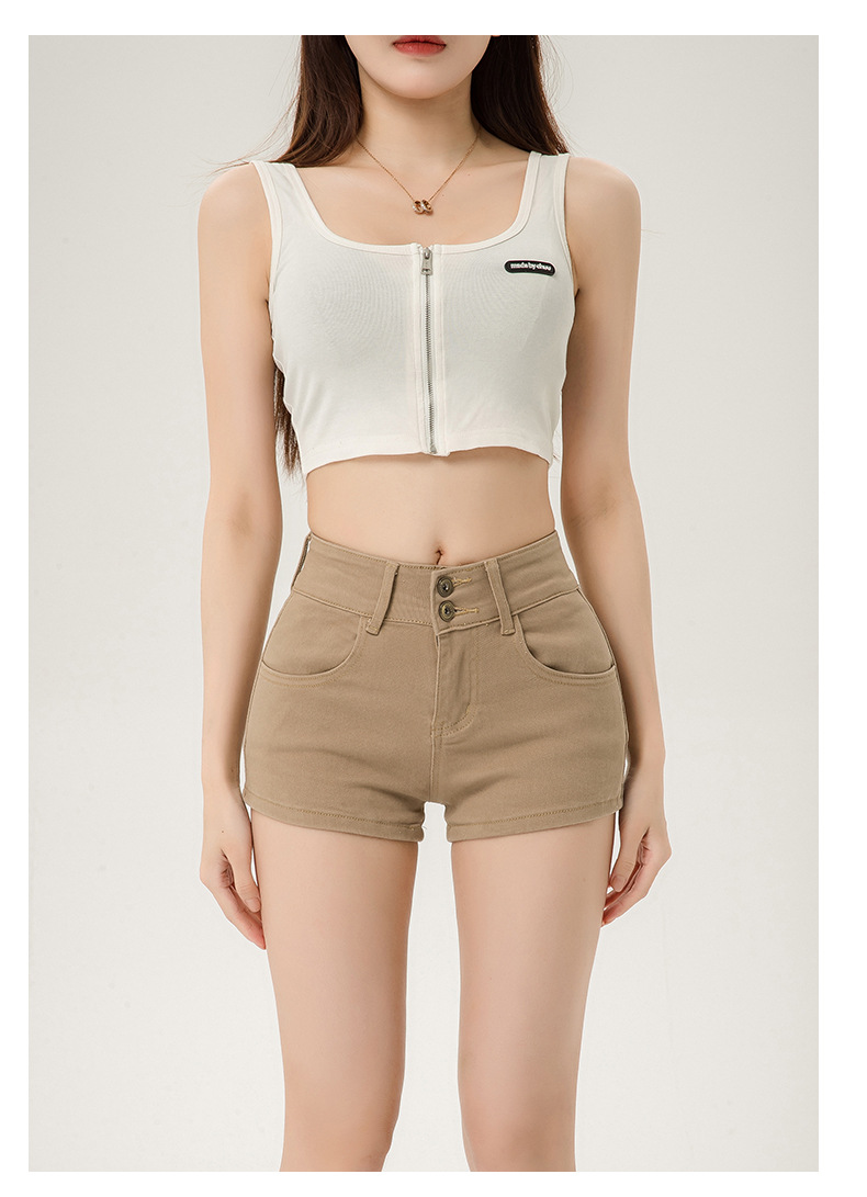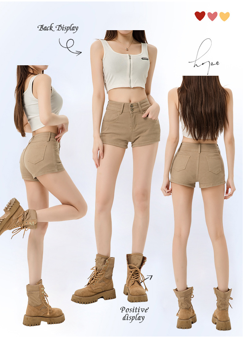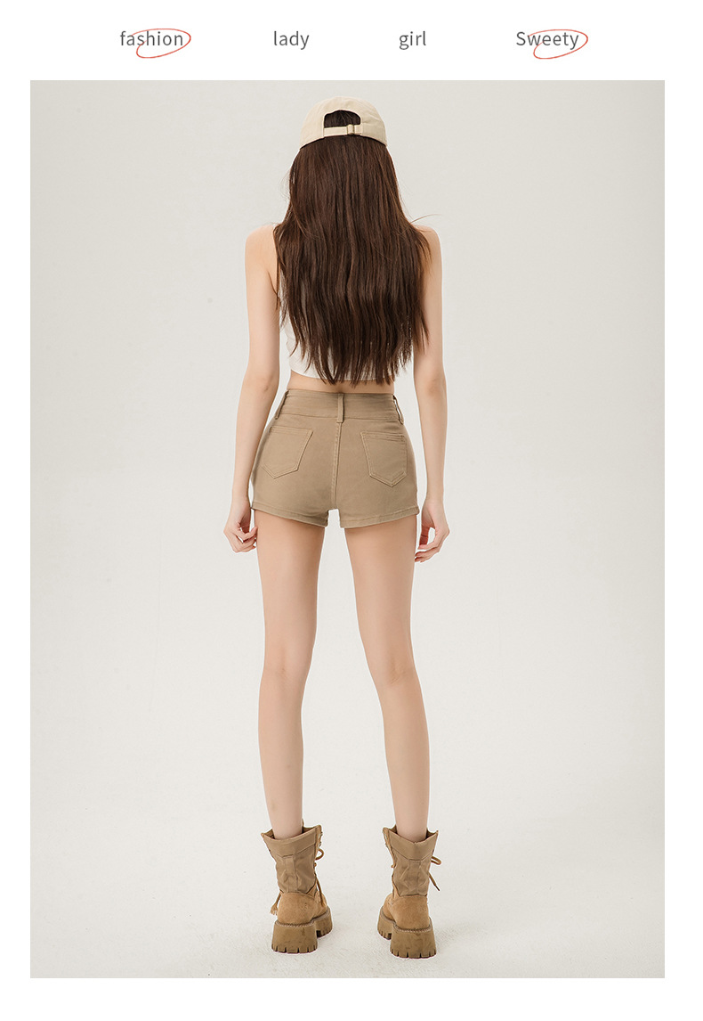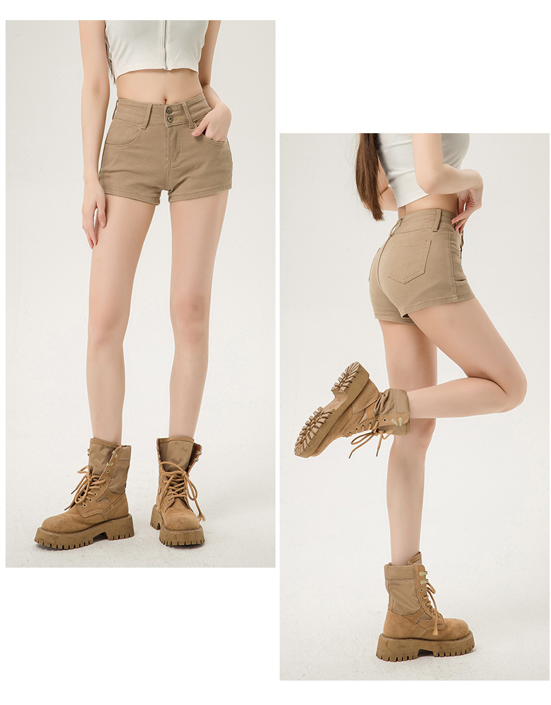 카키색 아메리칸 스타일 데님 반바지 여성 여름 신상 하이웨이스트 더블 버튼 슬림핏 신축성 있는 외출용 힙업 핫팬츠