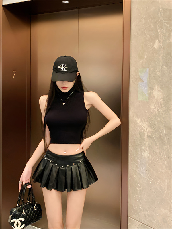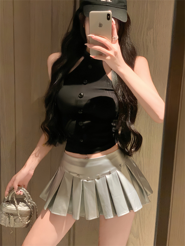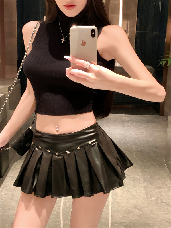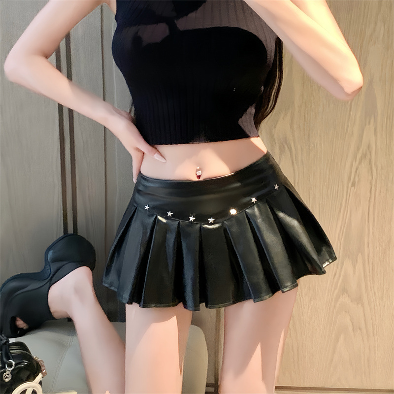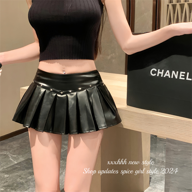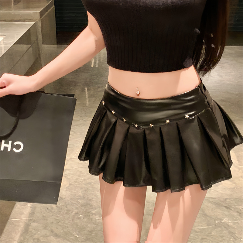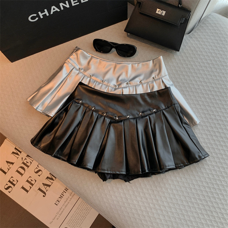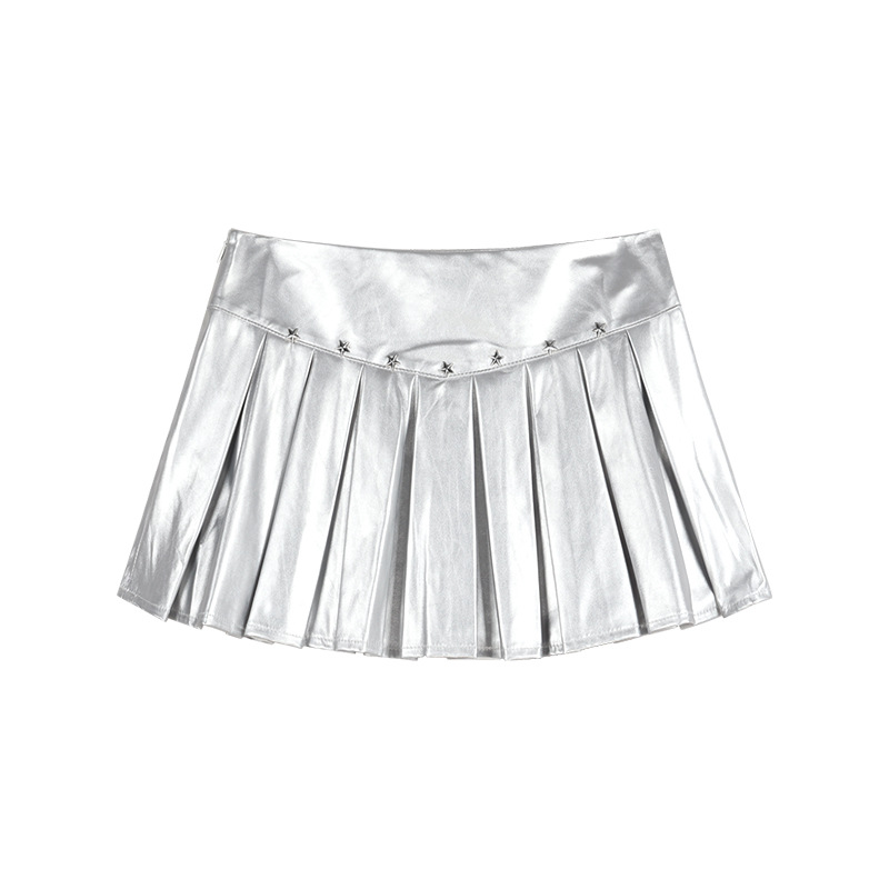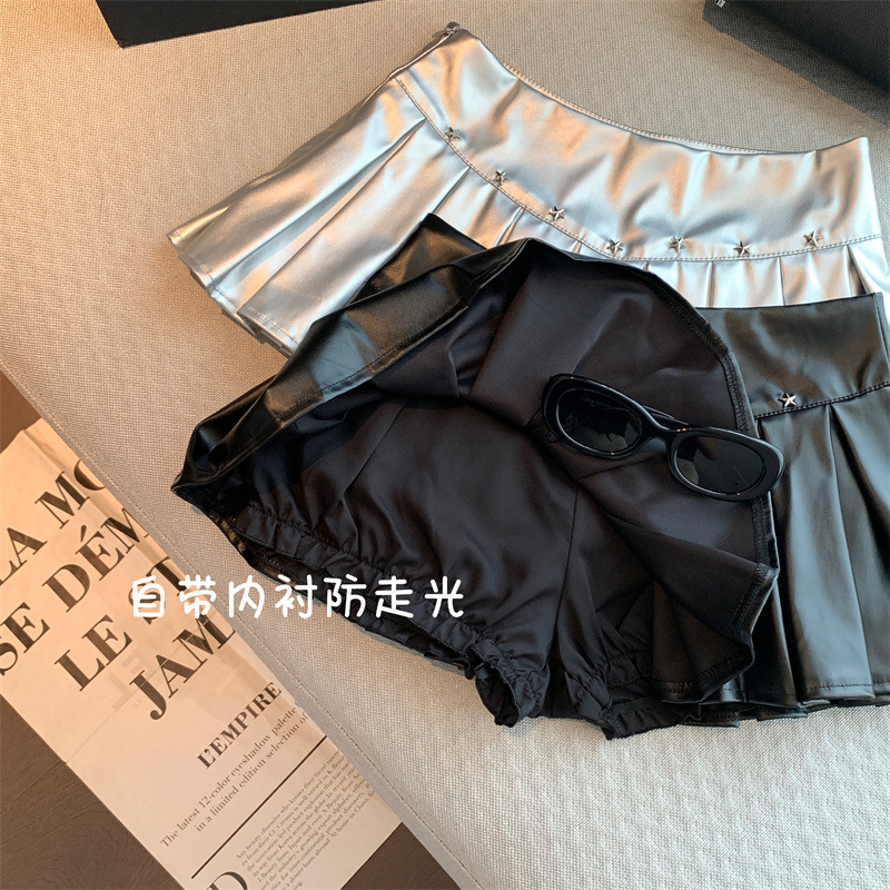 여름 여성을 위한 아메리칸 핫걸 플리츠 스커트, 섹시한 노출 방지 미니 스커트, 실버 로우 웨이스트 PU 가죽 A라인 스커트
