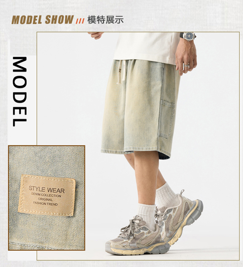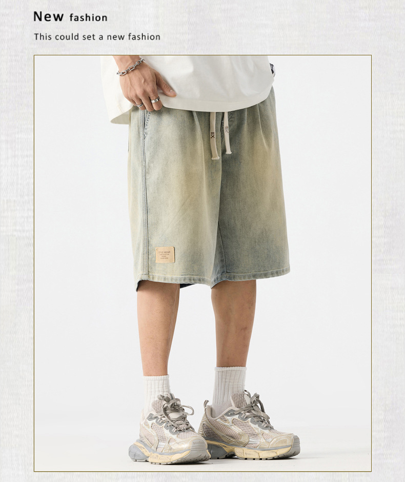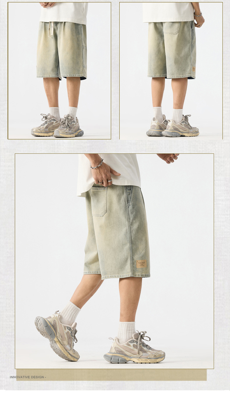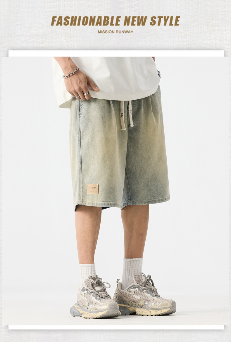플러스 사이즈 남성 여름 신작 일본 복고풍 워싱 데님 반바지 남성 루즈 스트레이트 얇은 5부 바지스토어 가기