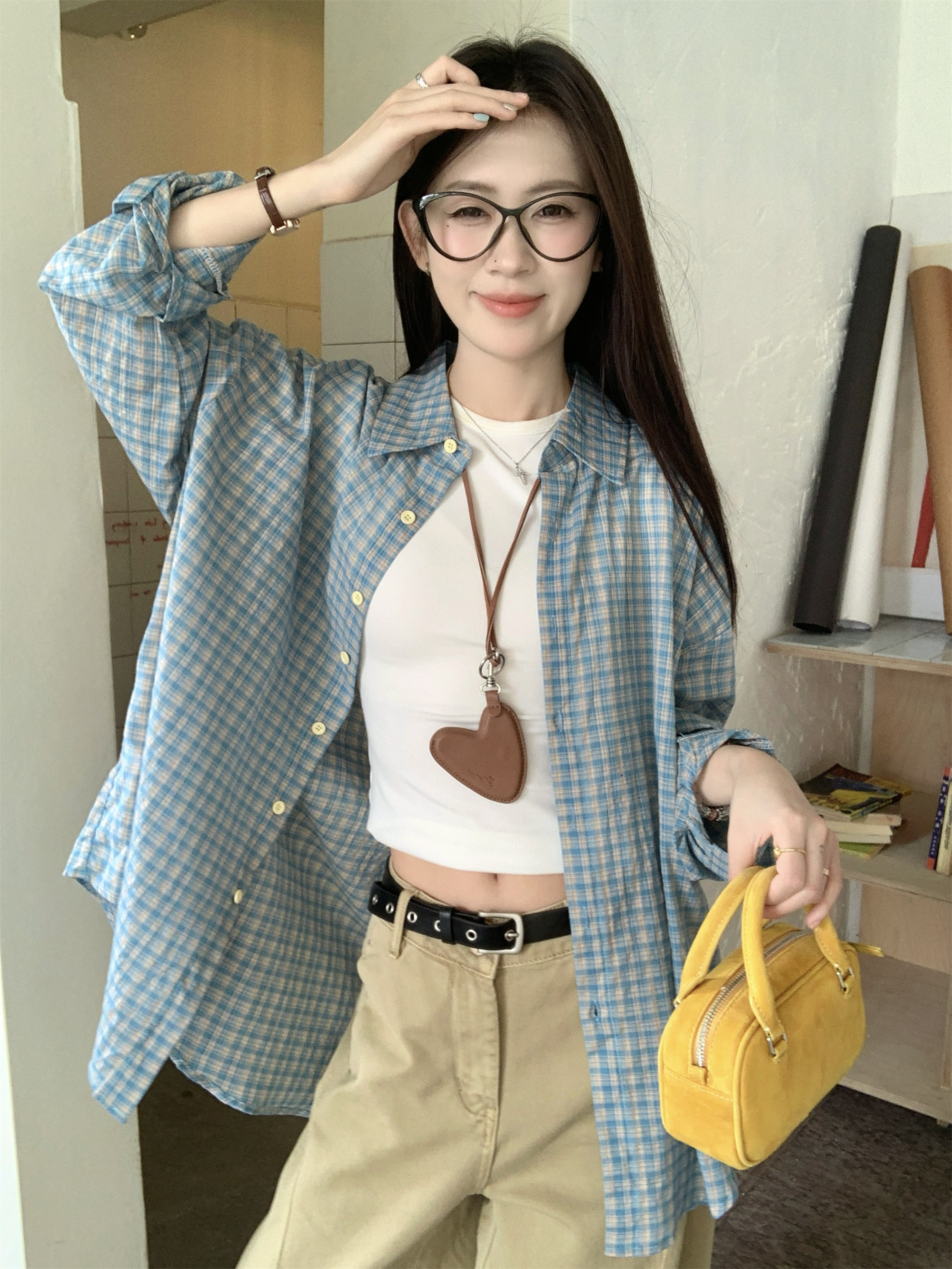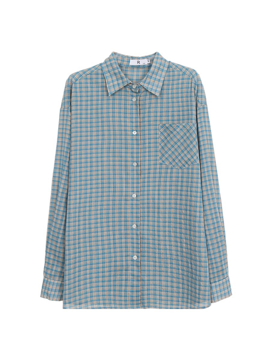 블루 플레이드 폴로 칼라 긴팔 선 스크린 셔츠 여성용 여름 얇은 외부 셔츠 재킷 올 매치 캐주얼 탑스토어 가기