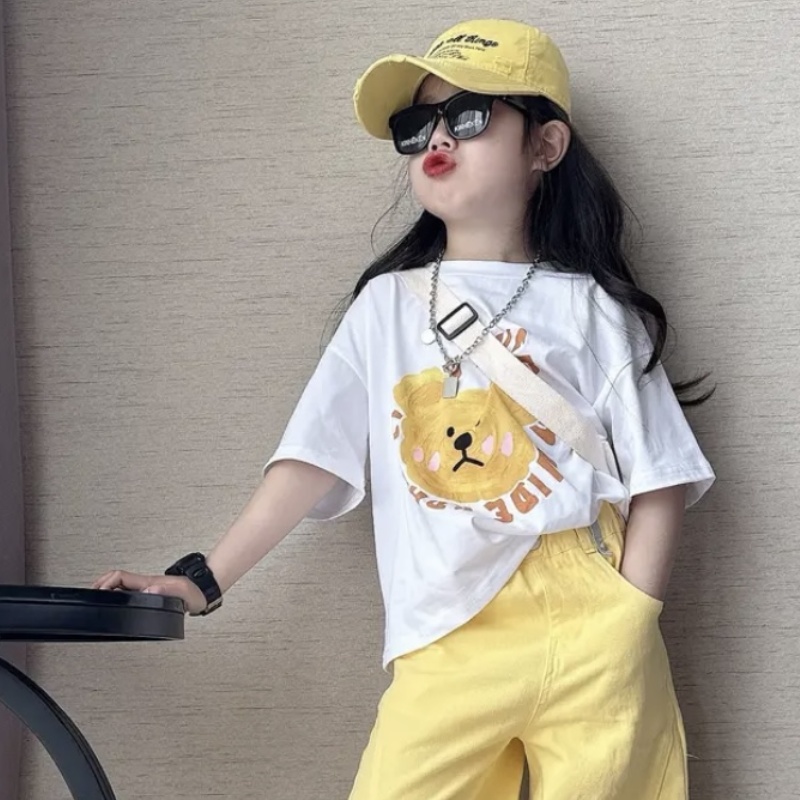 여름 소녀 도파민 착용 2025 새로운 한국식 곰 반팔 티셔츠 캐주얼 느슨한 마체테 바지 세트