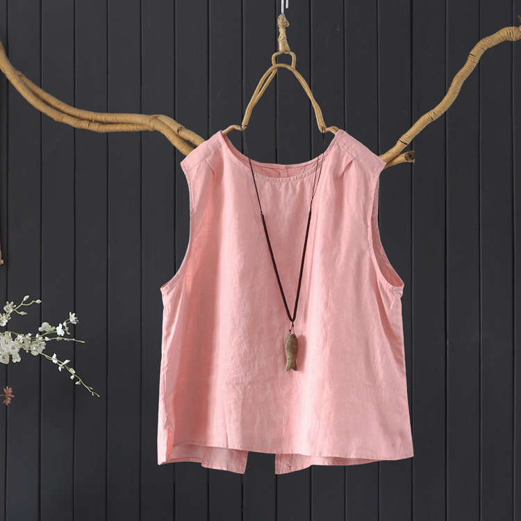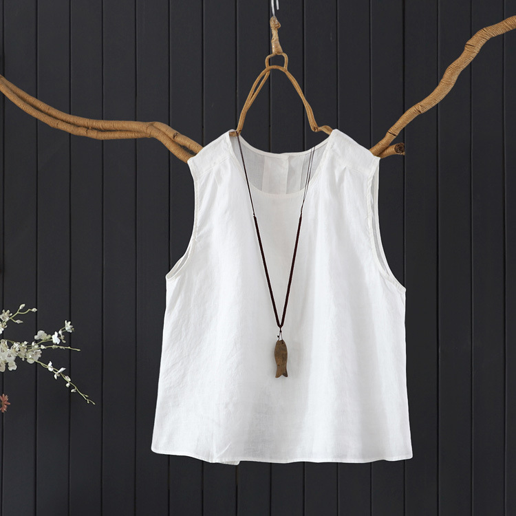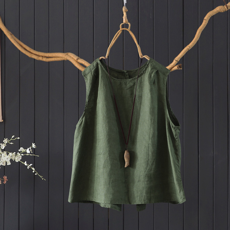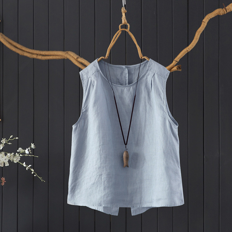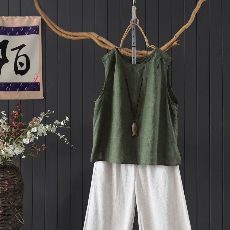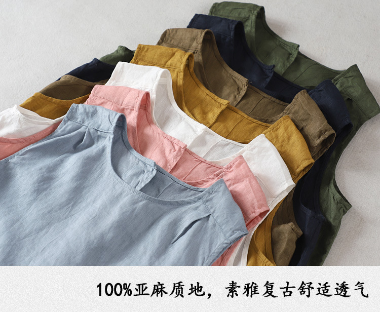 예술적 올매치 도브테일 라운드 넥 풀오버 조끼 여자 여름 쿨 100% 리넨 솔리드 컬러베이스 셔츠