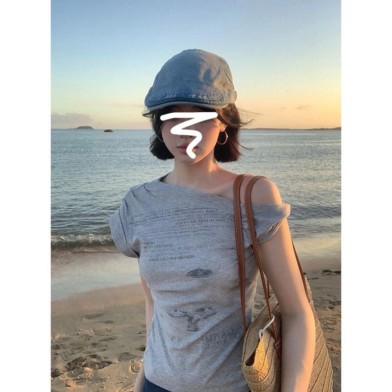 홍콩 스타일 세련된 편지 경사 어깨 반팔 티셔츠 여성 여름 슬리밍 디자인 센스 셀러브리티 우아한 올 매치 탑