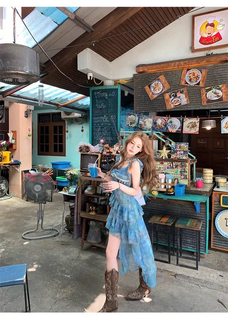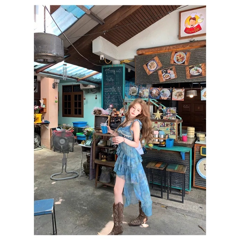 봄과 여름 2025 새로운 도착 작은 비행 소매 원피스 여성의 불규칙한 휴가 스커트스토어 가기