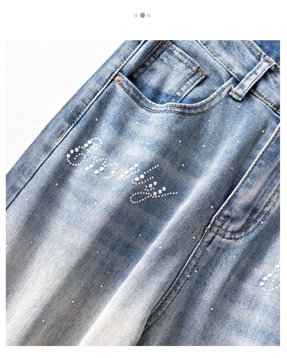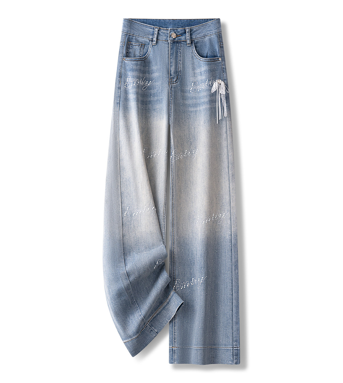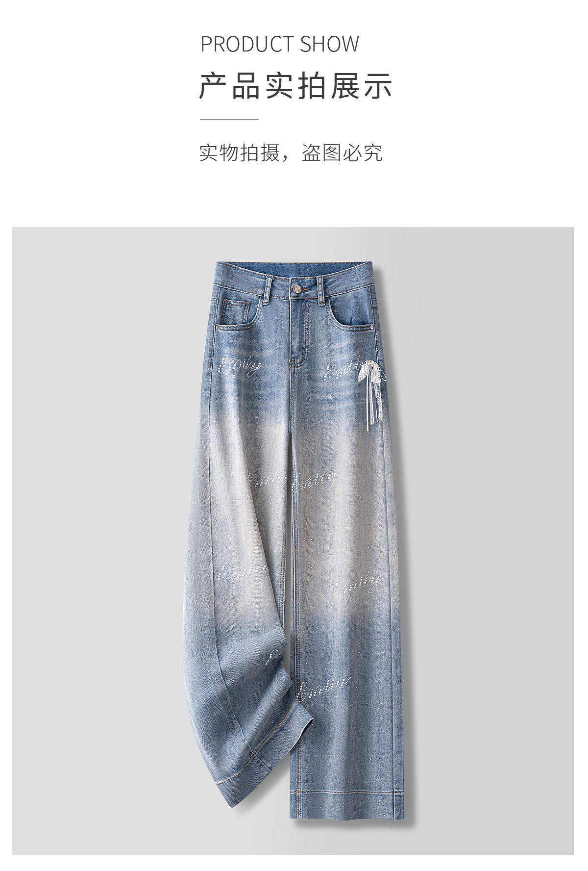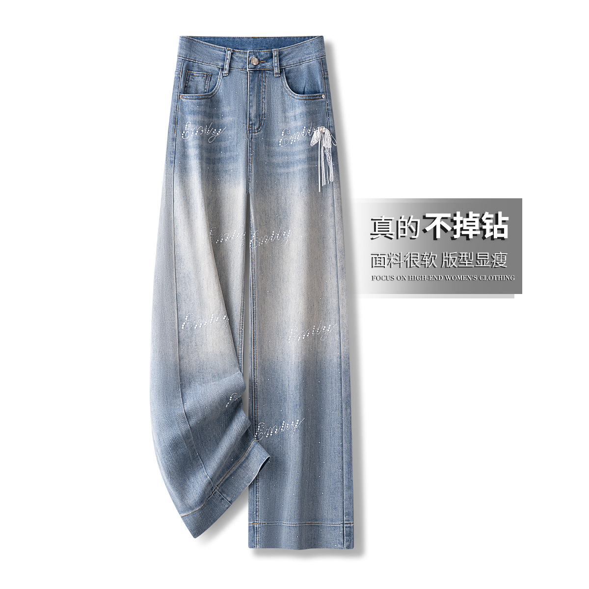 슈퍼 잘 생긴 넓은 다리 청바지 여성의 2025 새로운 여름 활 장식 디자인 센스 핫 드릴링 스트레이트 바지스토어 가기